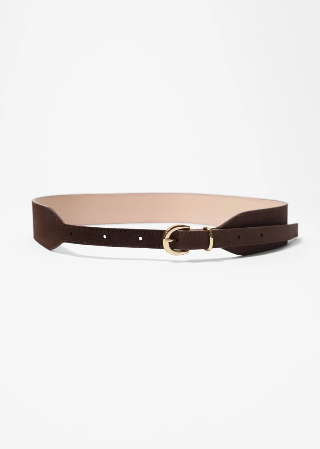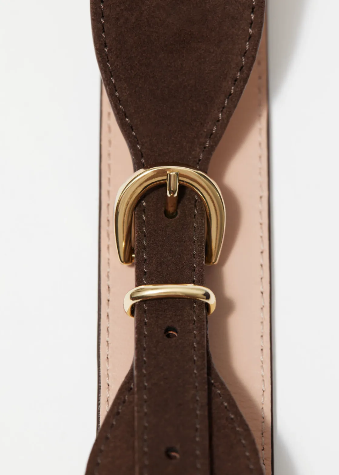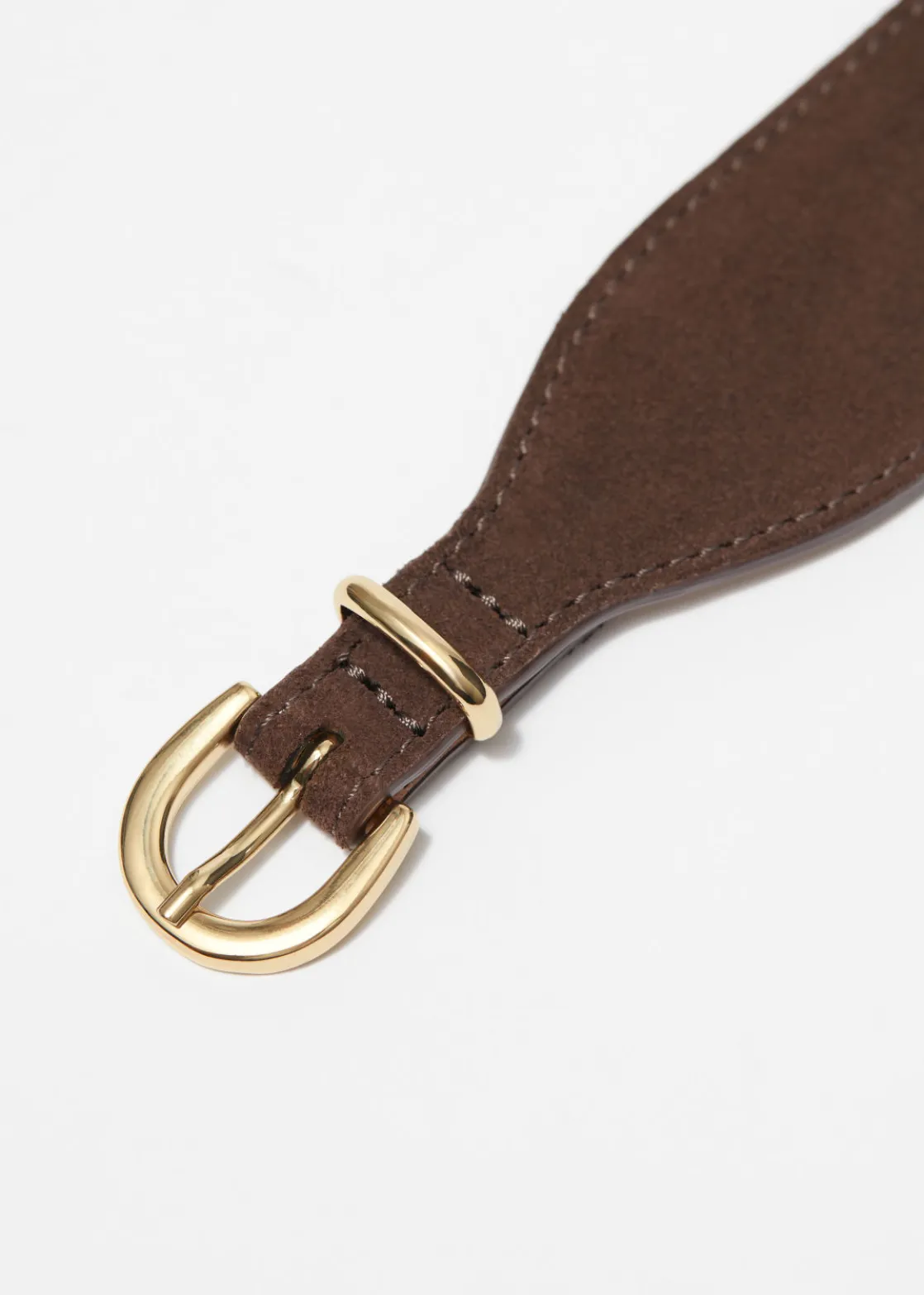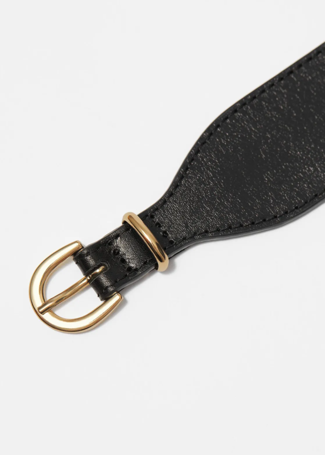 Waist belt crafted from leather with a wide design and a thin centered gold toned buckle.
