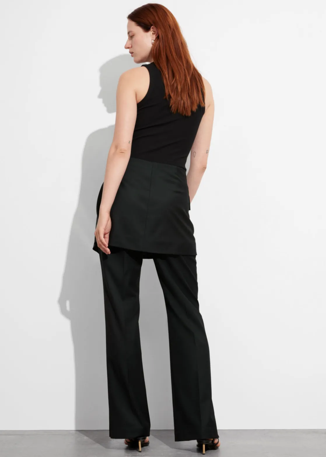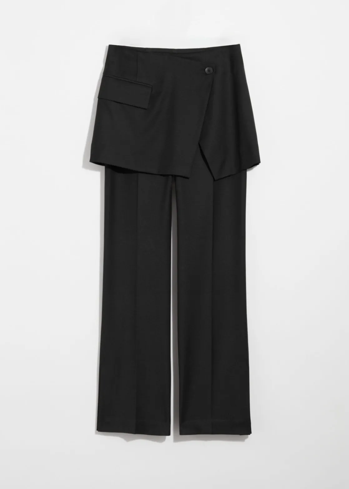 High-waist trousers layered with a wrap skirt featuring a flap pocket and a single button closure.