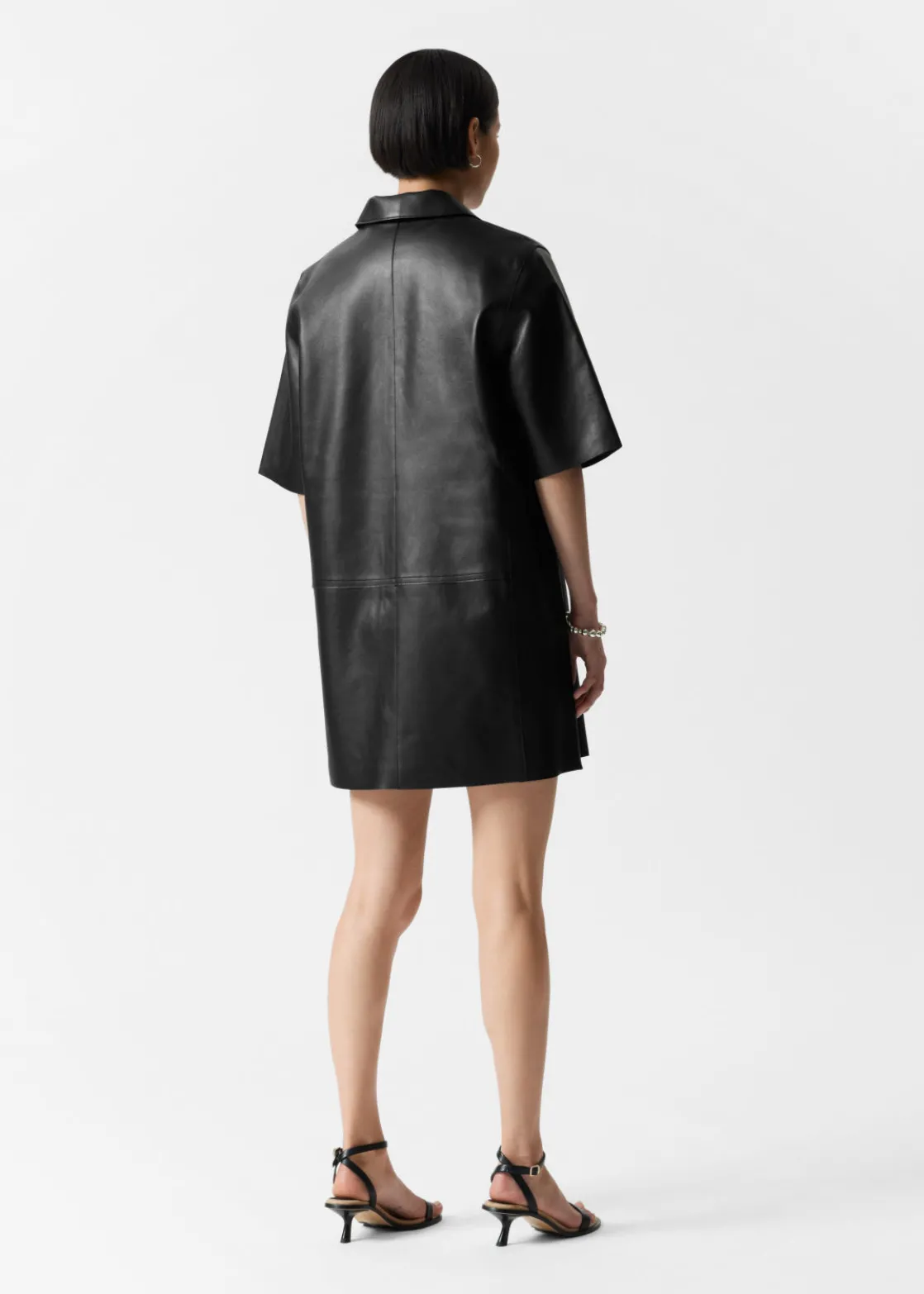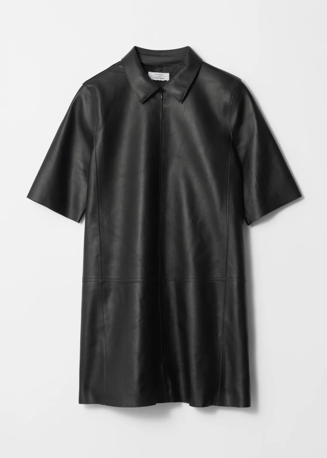 Short-sleeve leather dress in a smooth finish. Detailed with a centre front zipper.