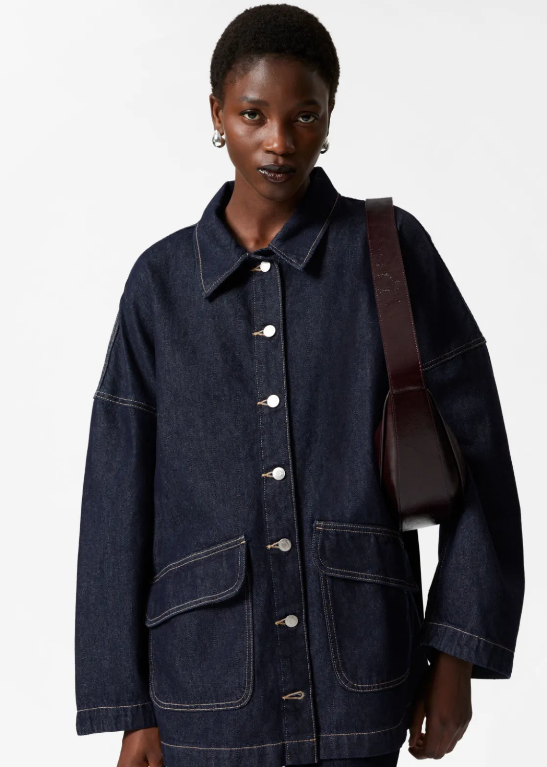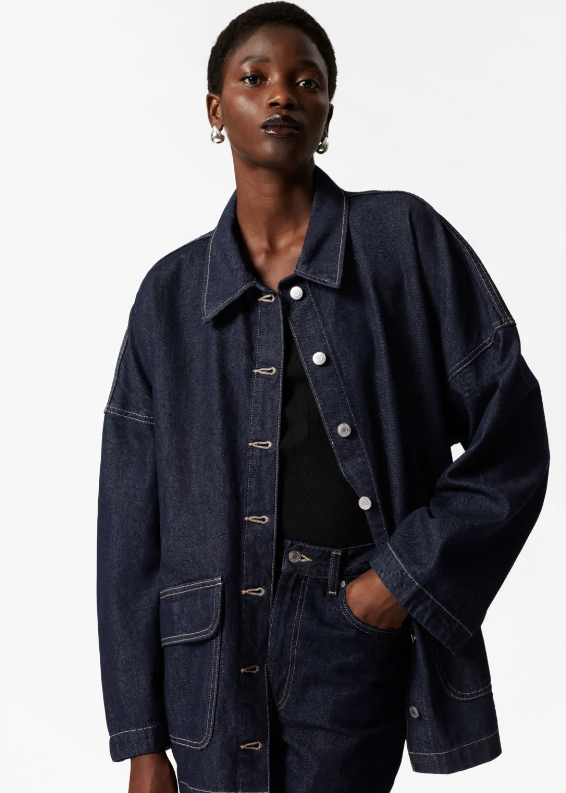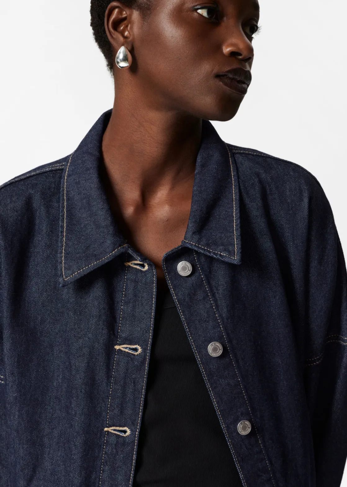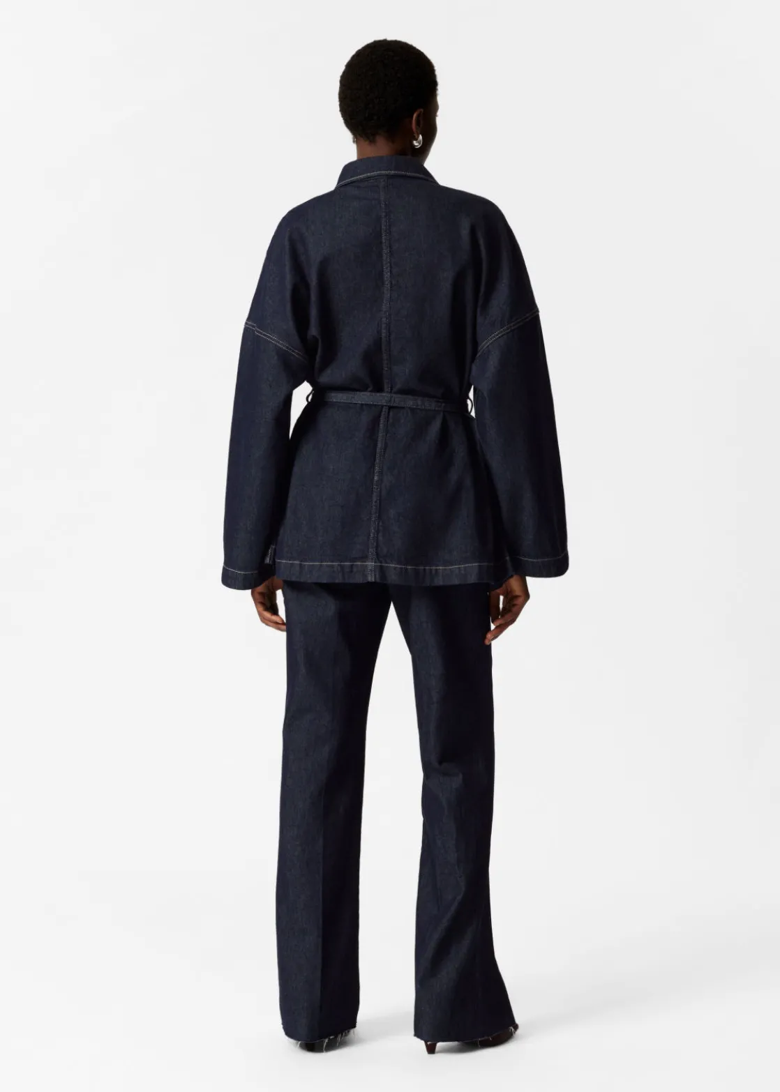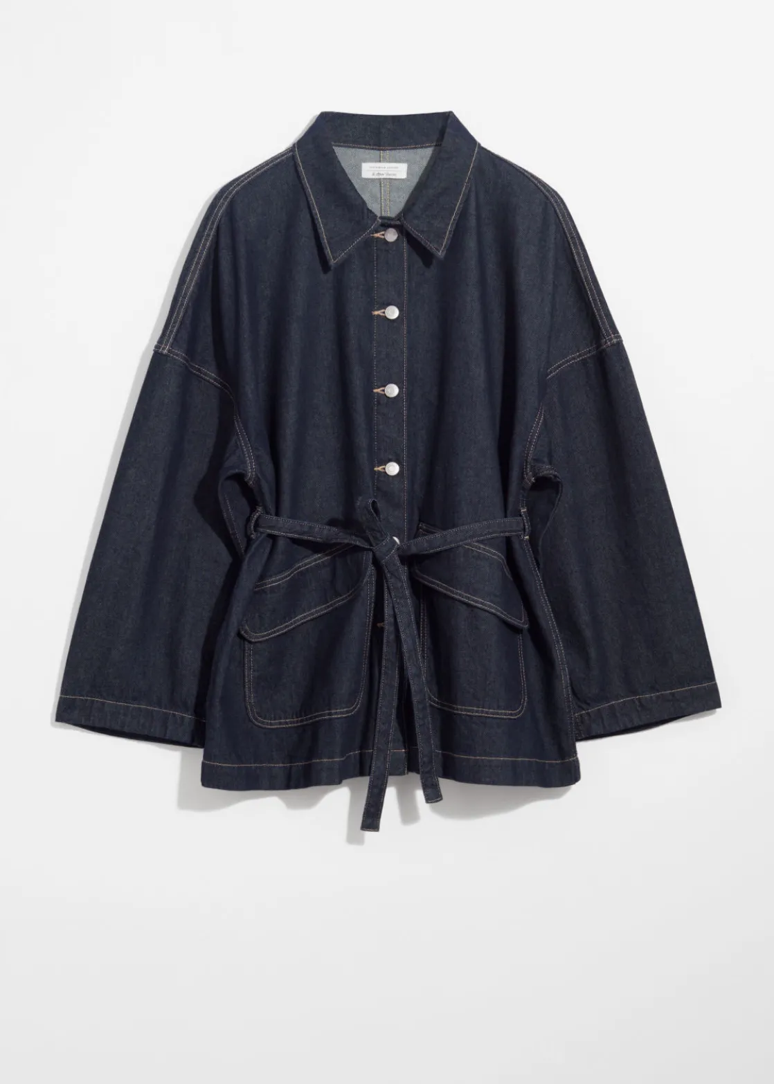 Oversized denim jacket featuring large patch pockets and a self-tie belt. Traced with seven jeans button closures.