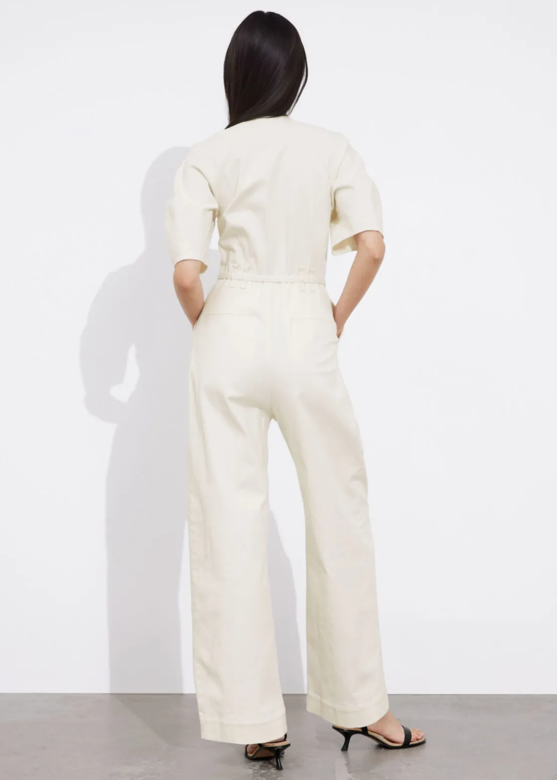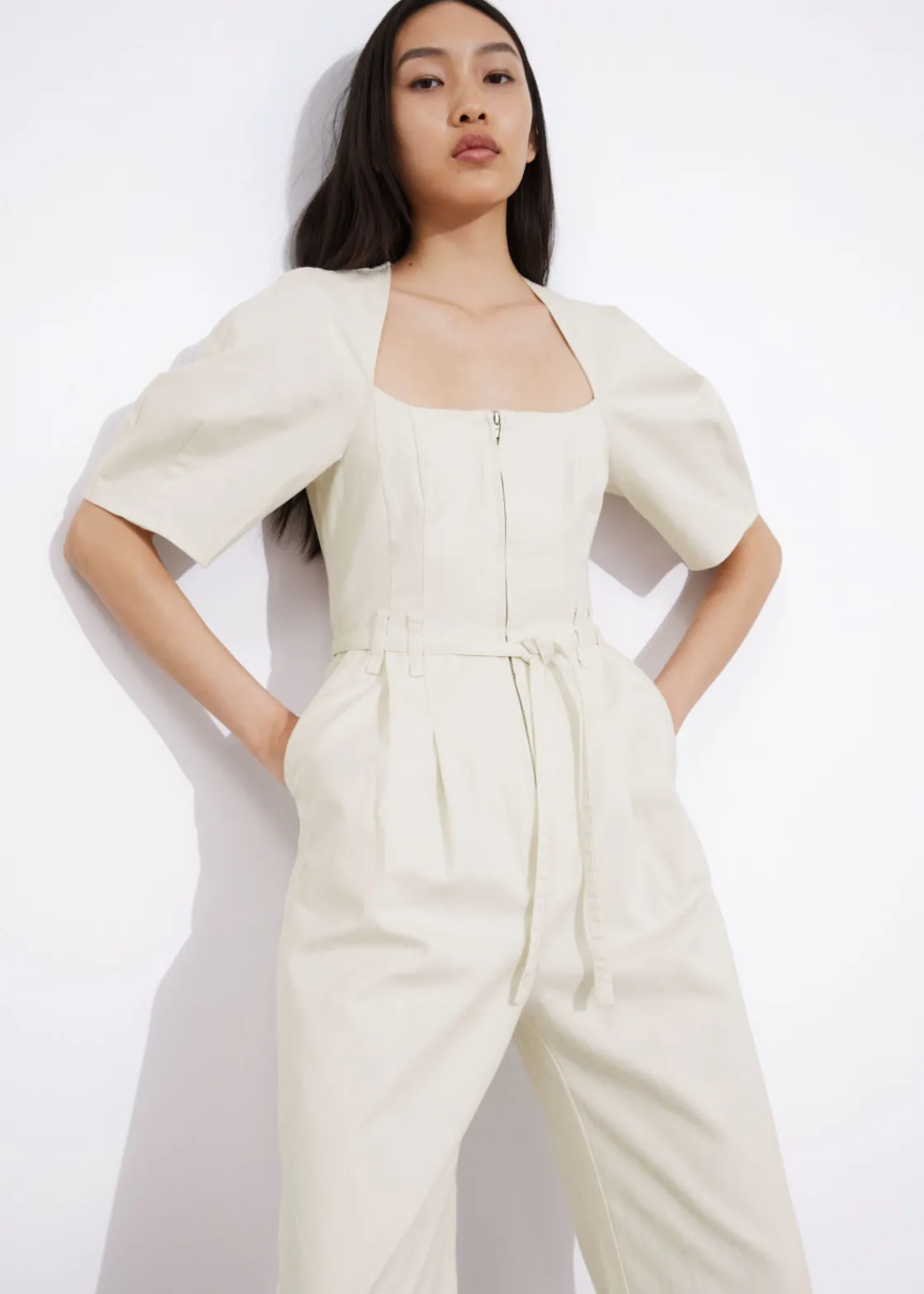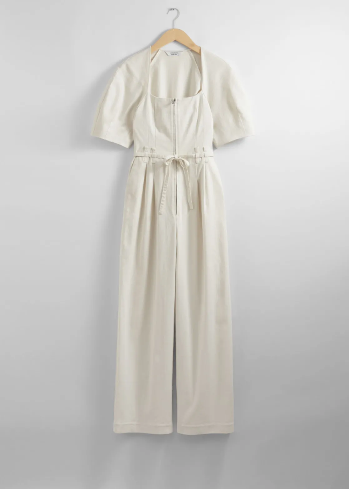 Jumpsuit featuring a square neckline and short three-quarter sleeves. Secured with a thin self-tie belt.