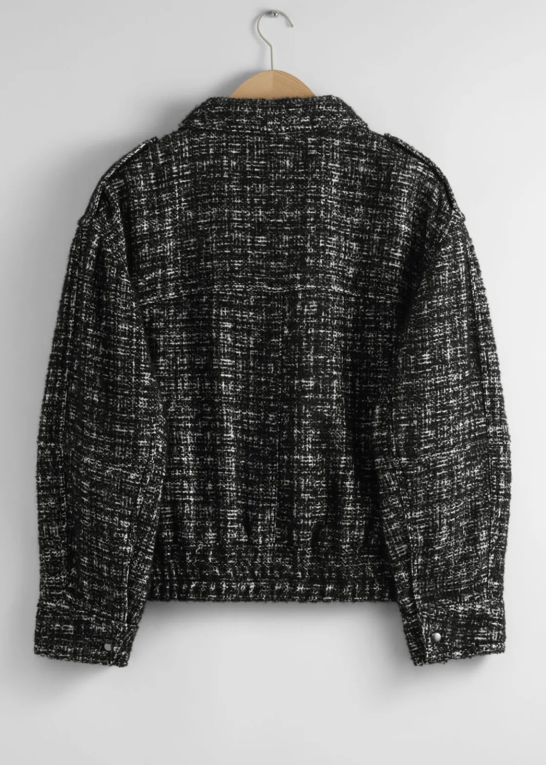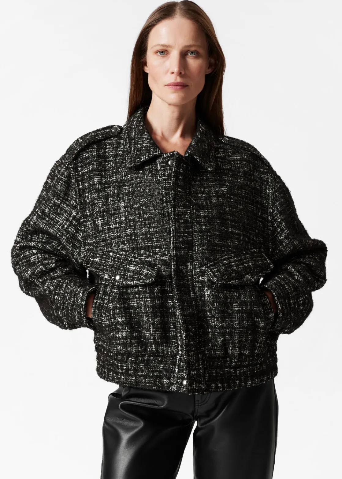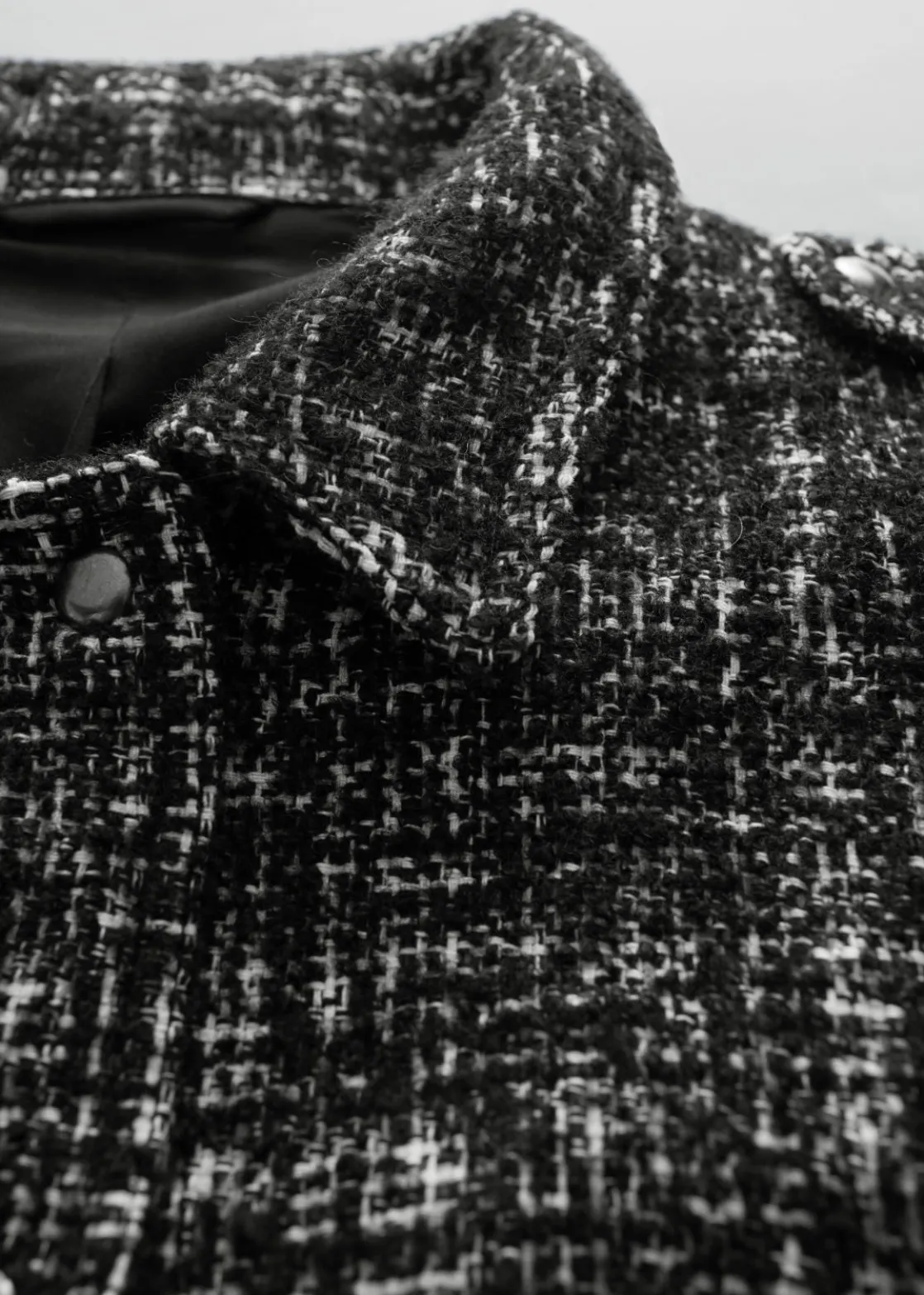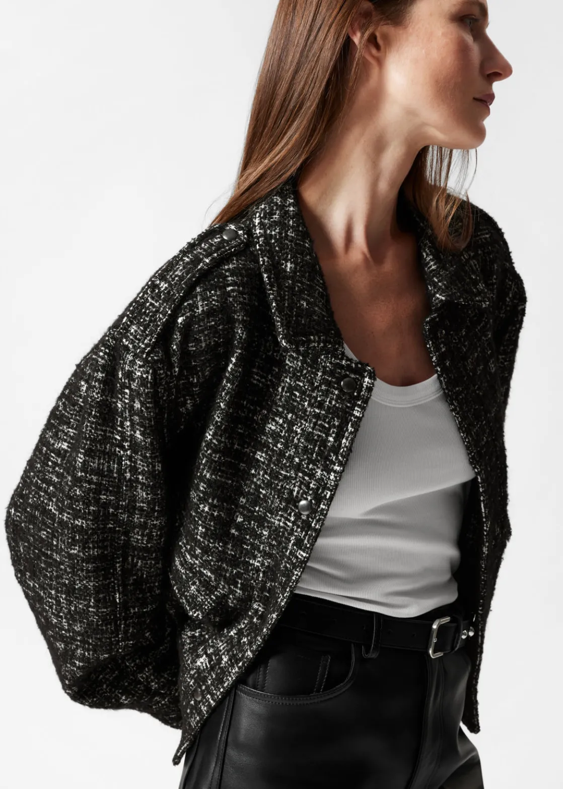 Collared tweed jacket traced with snap button closures. Featuring a relaxed, boxy silhouette.