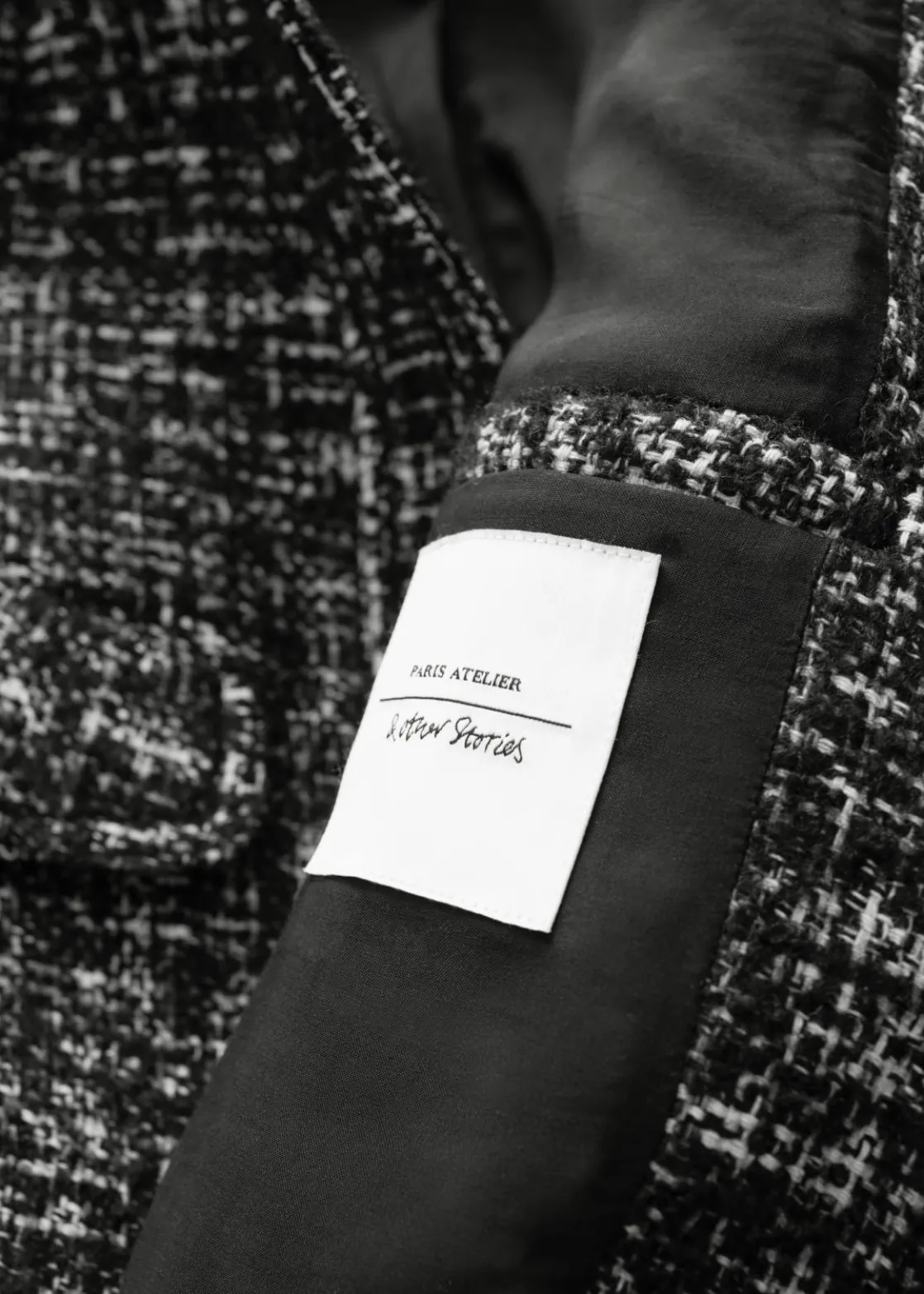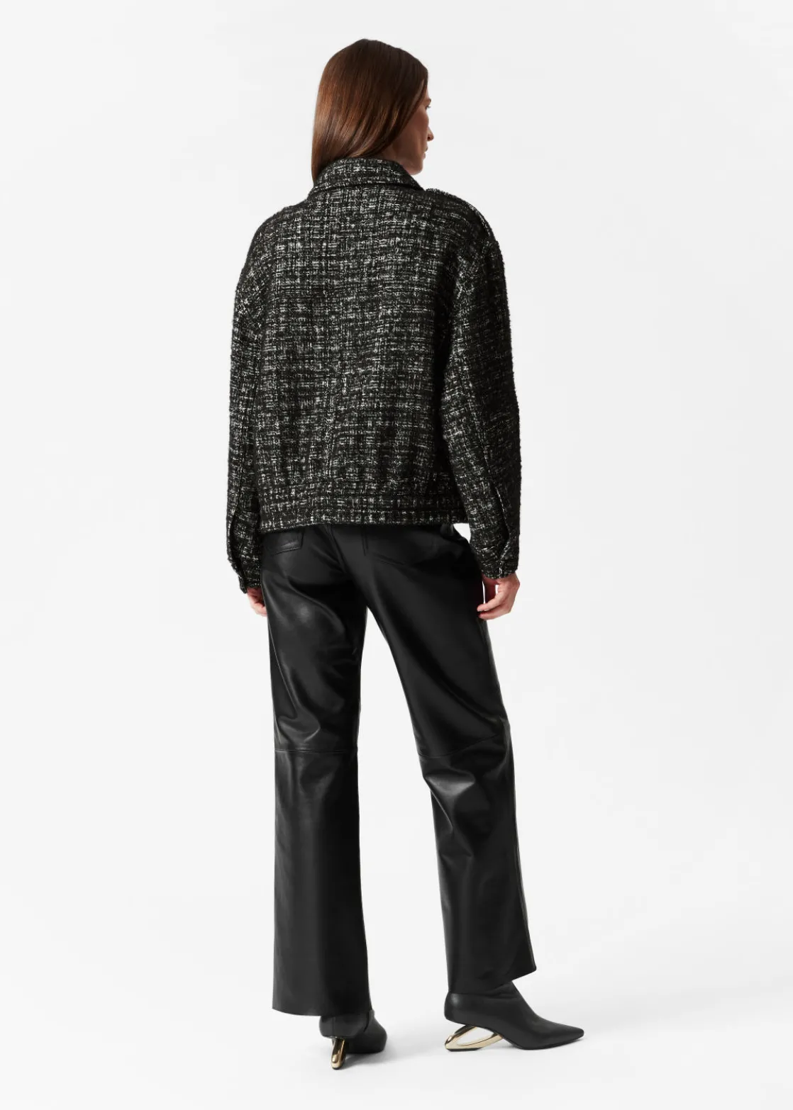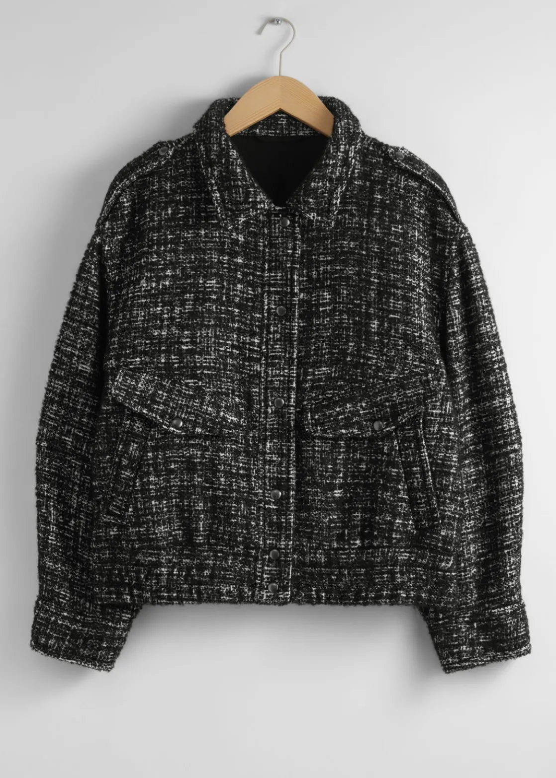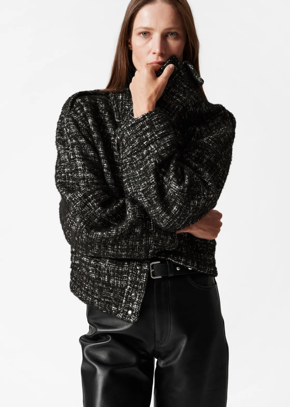 Collared tweed jacket traced with snap button closures. Featuring a relaxed, boxy silhouette.