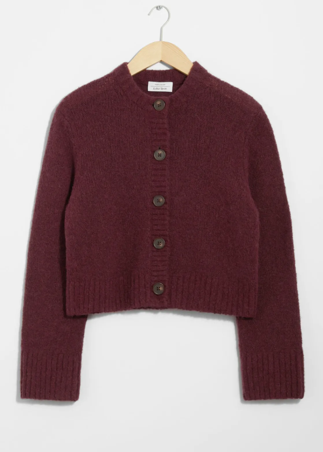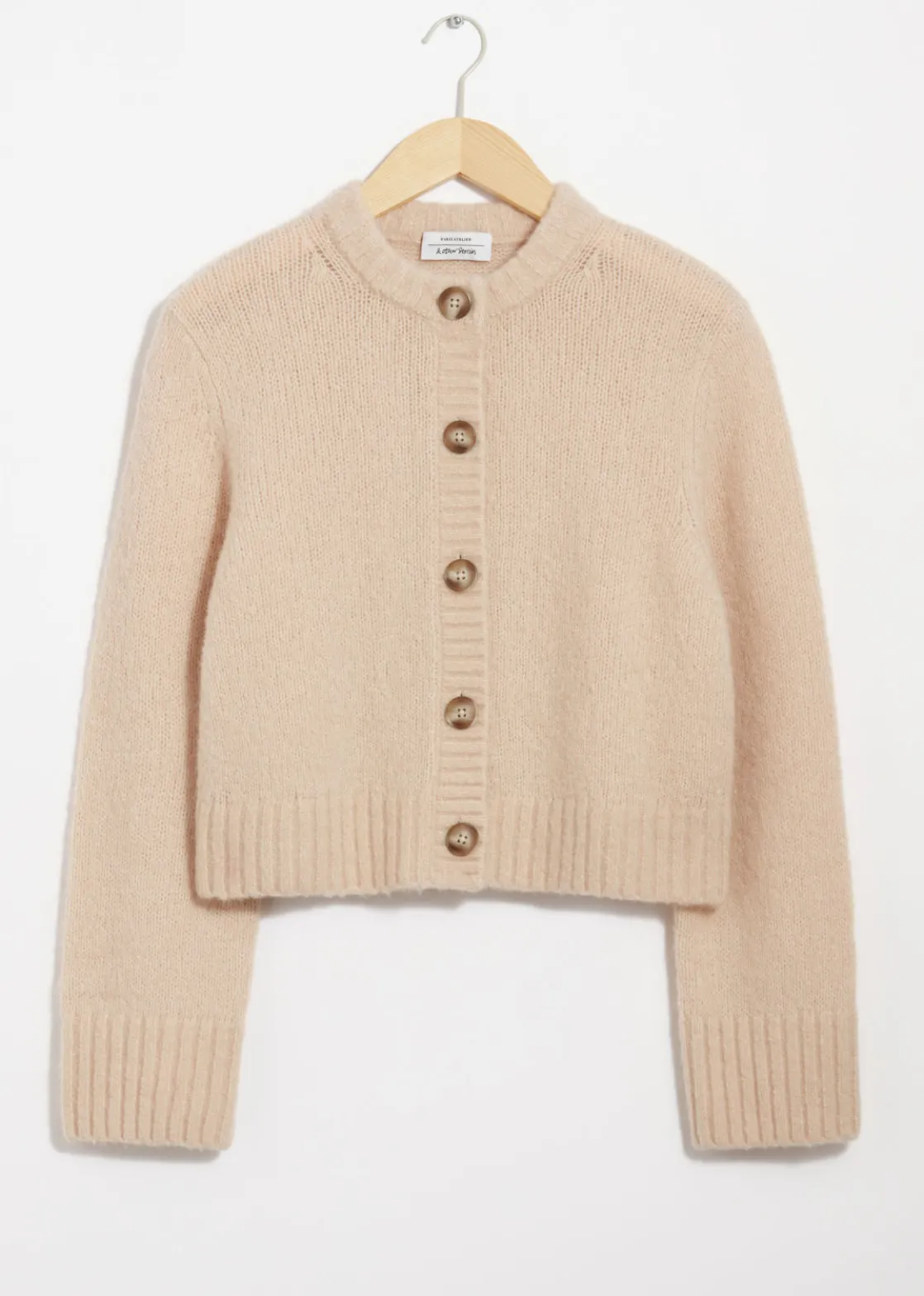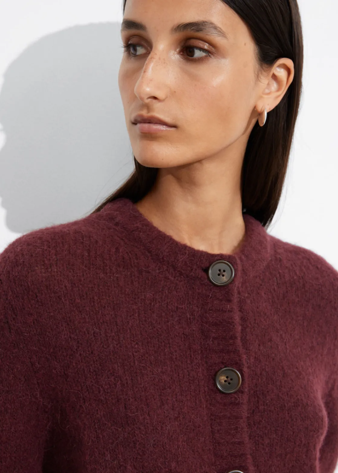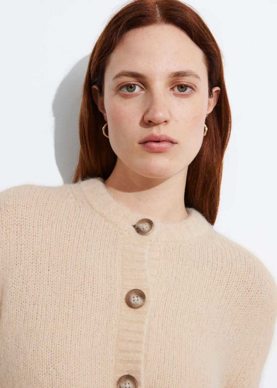 Cardigan knitted from a wool and alpaca blend. Traced with five button closures.