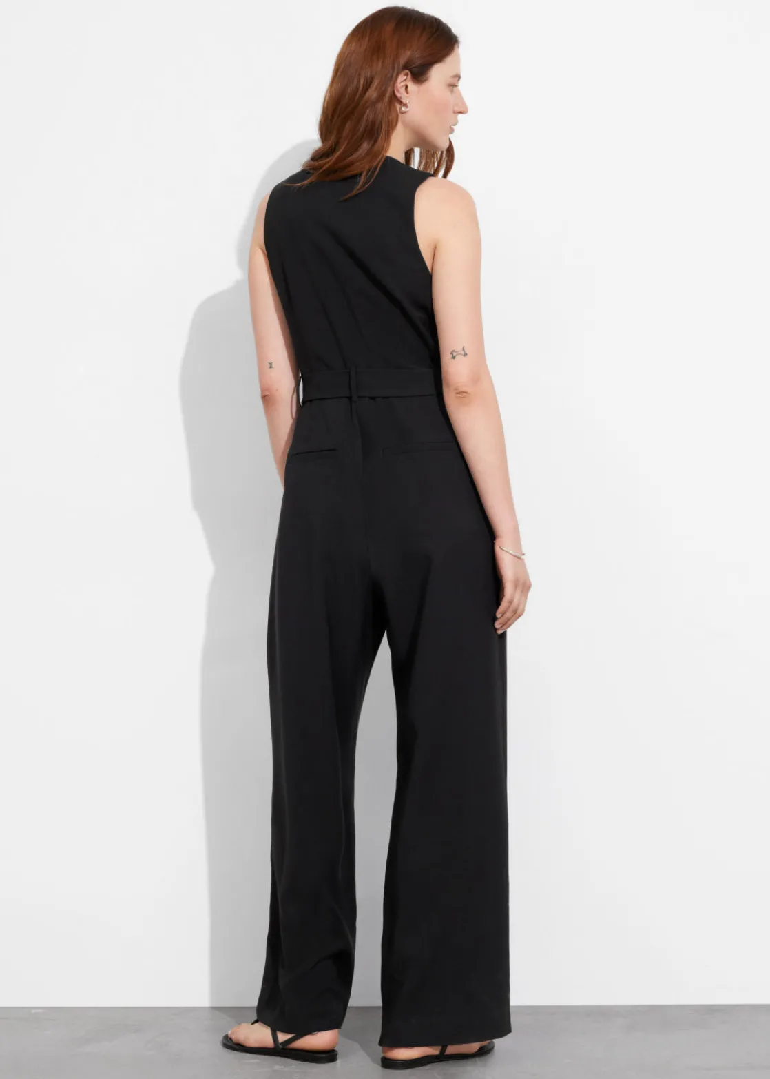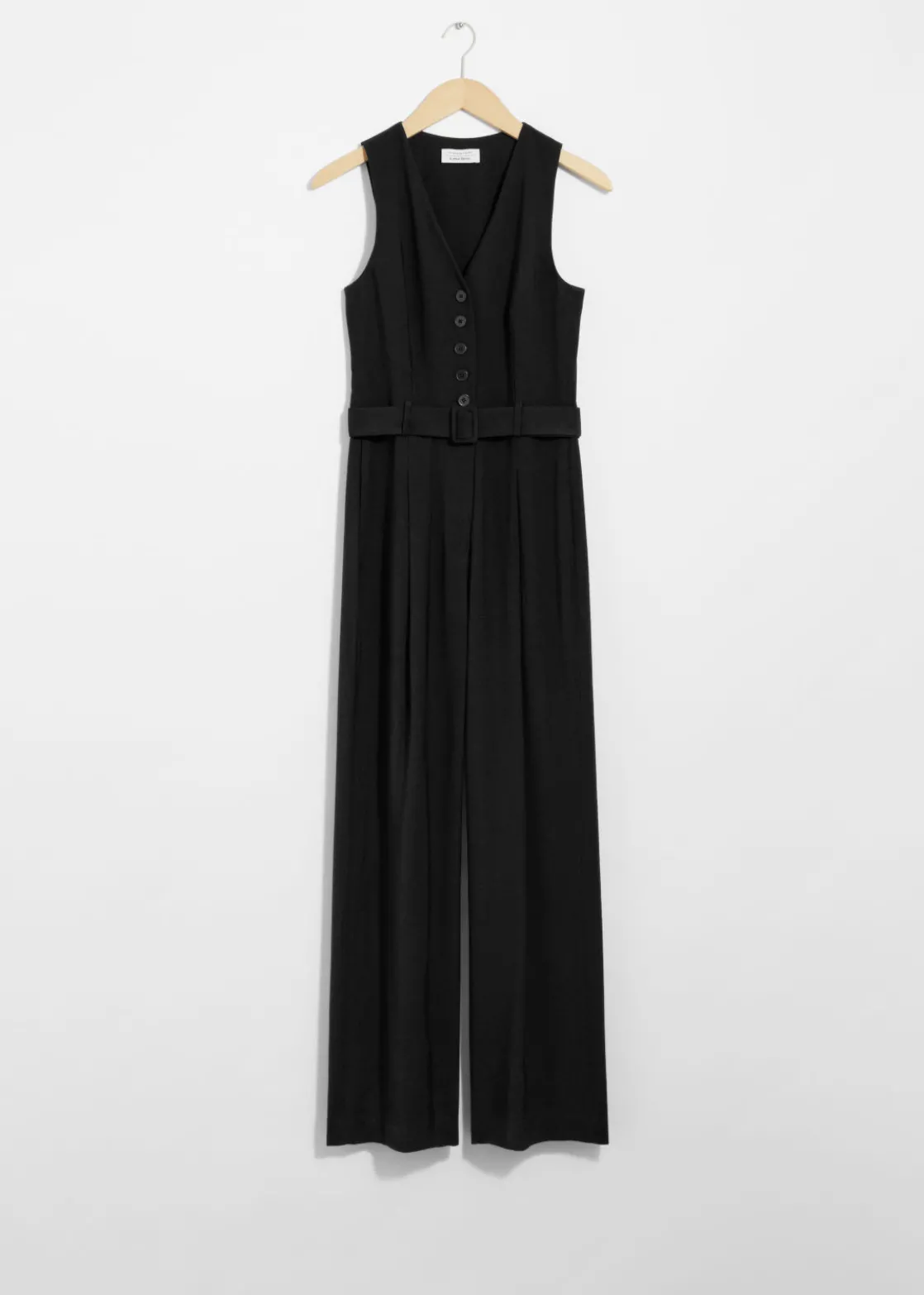 Sleeveless jumpsuit featuring a buttoned vest-inspired top. Secured with a self-covered buckle belt.