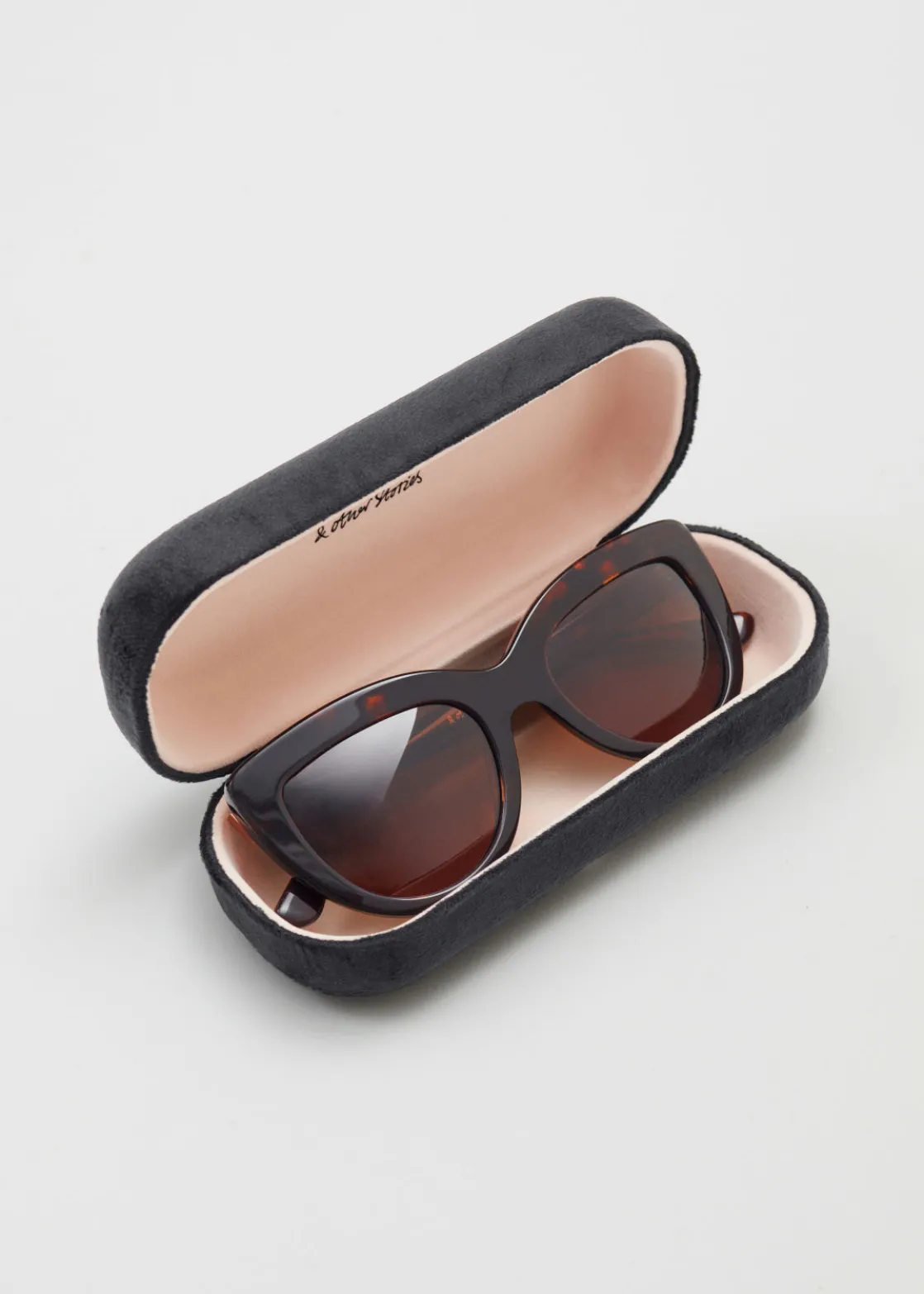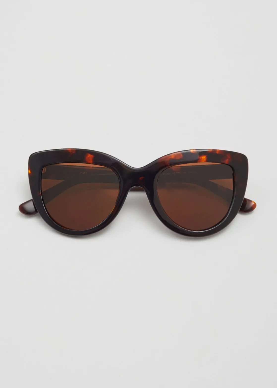 Made from acetate, these sunglasses features classic cat-eye frames. Keep yours scratch-free by storing them in the included case.