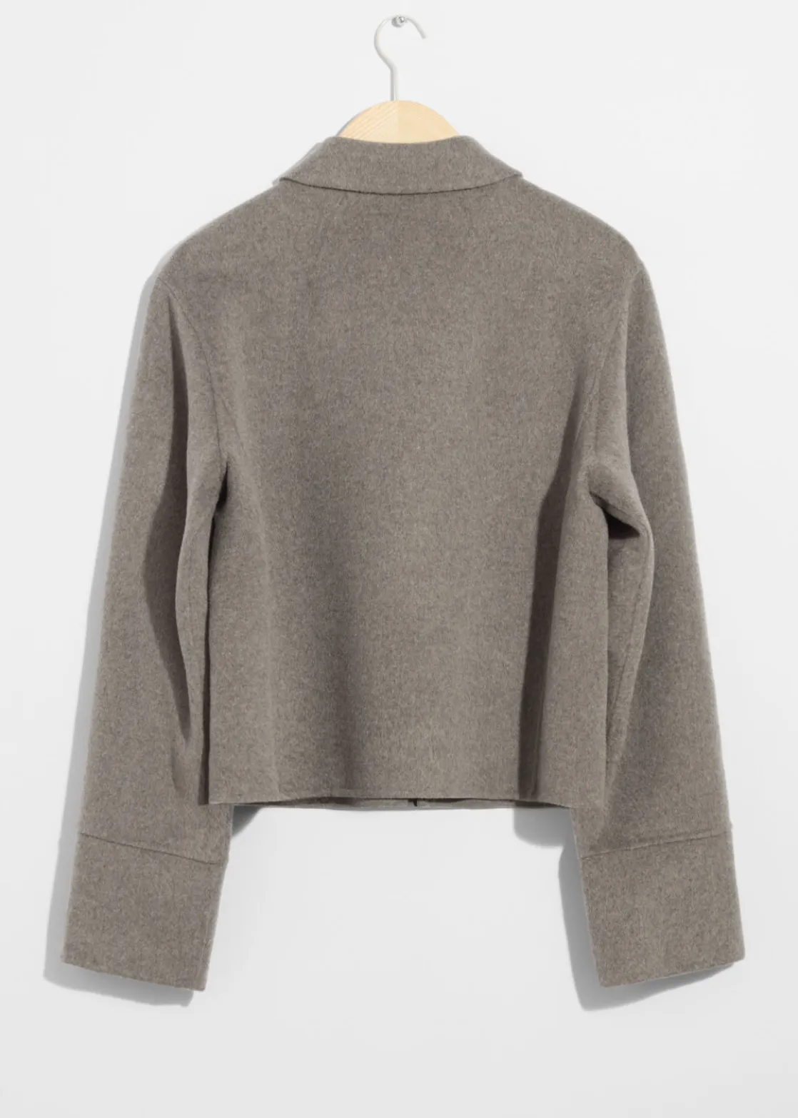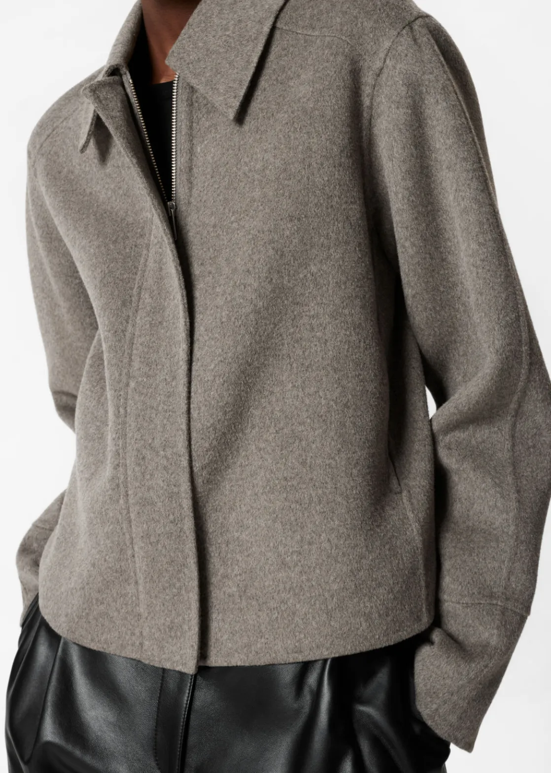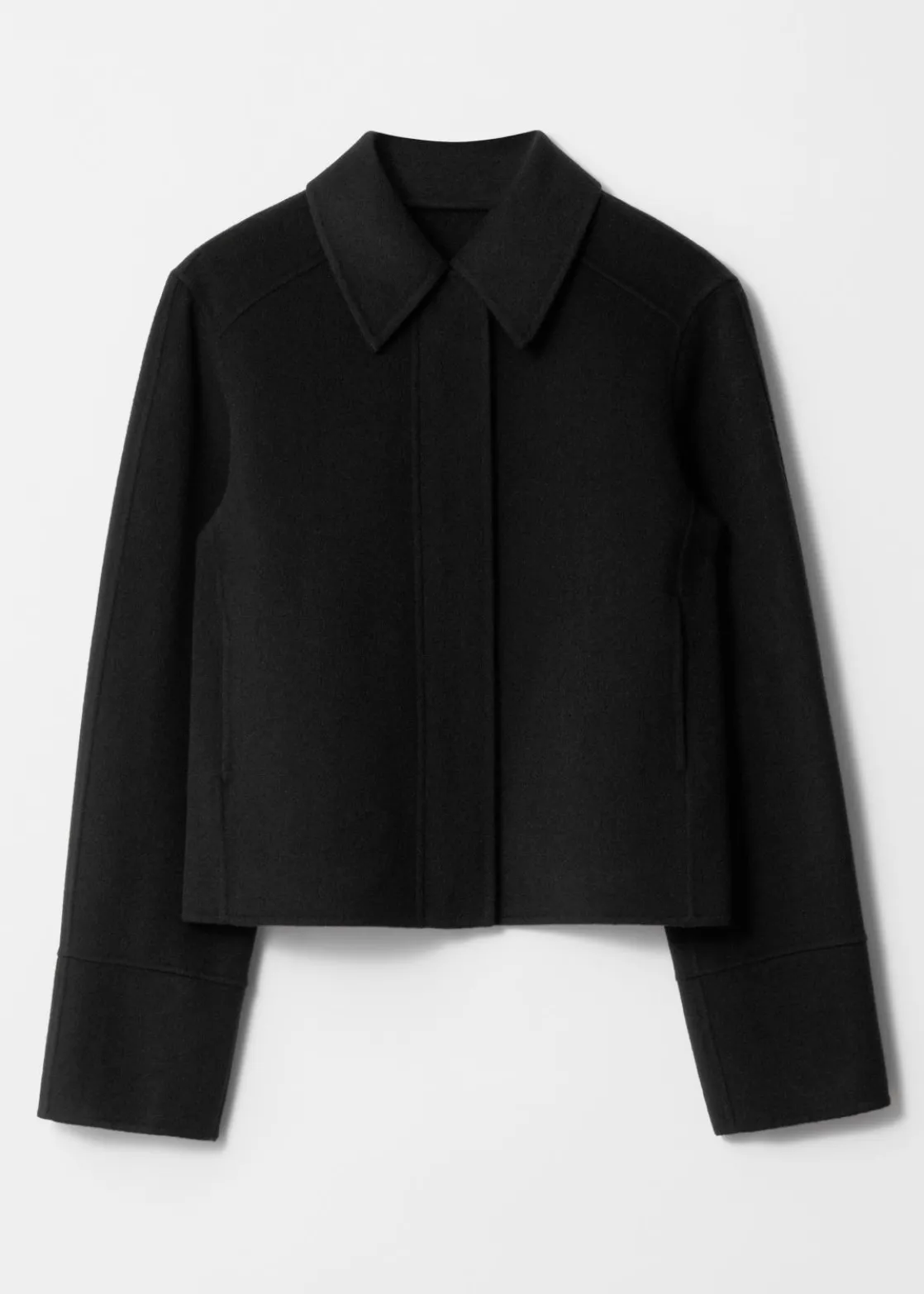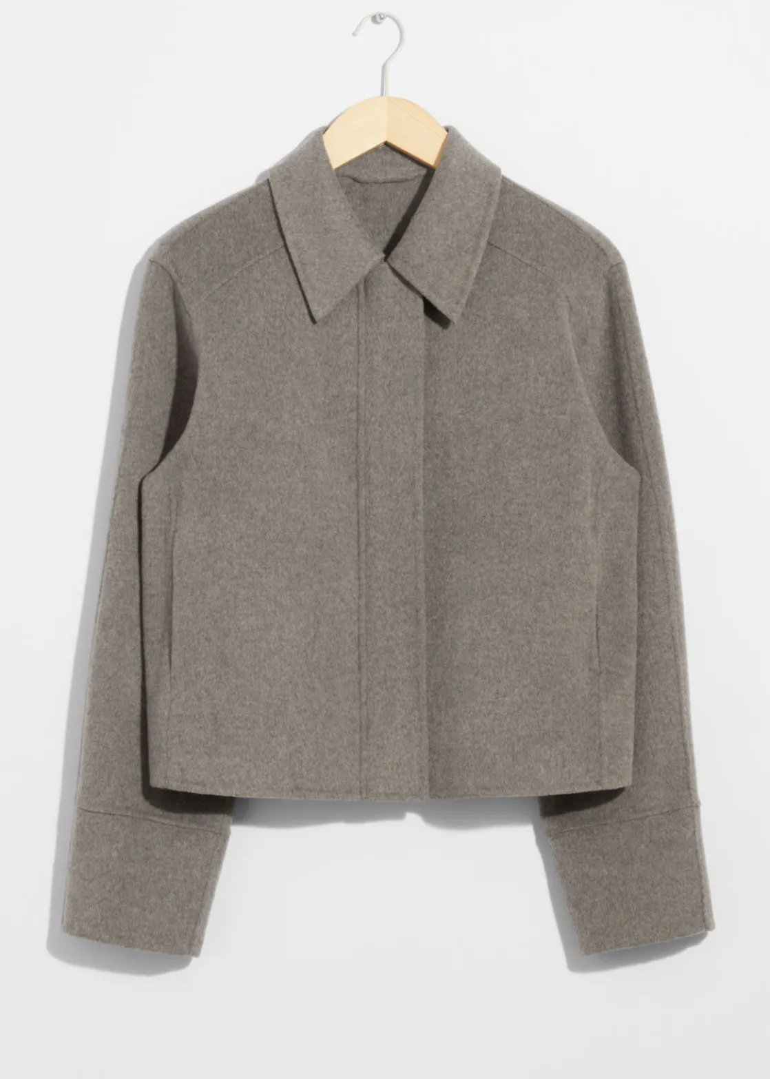 Jacket made from a wool-blend, fastened with a concealed zipper closure.
