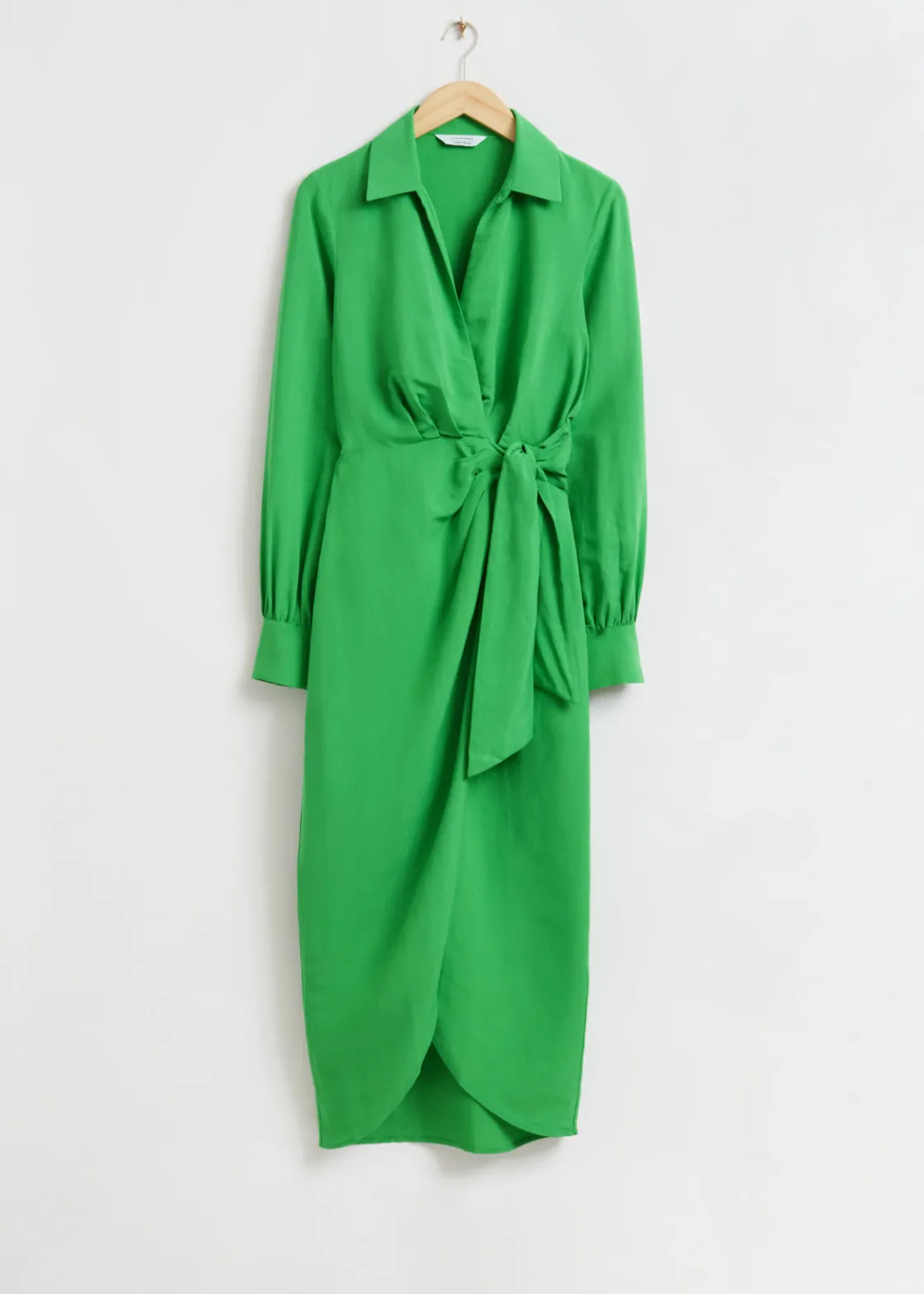 Collared v-cut wrap midi dress finished with a self-tie detail at the side.