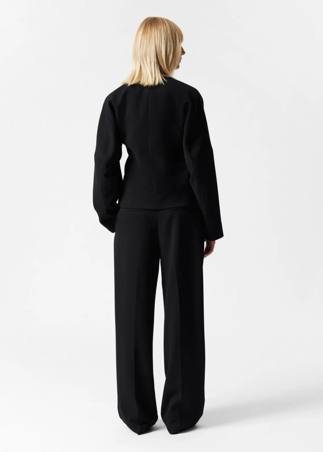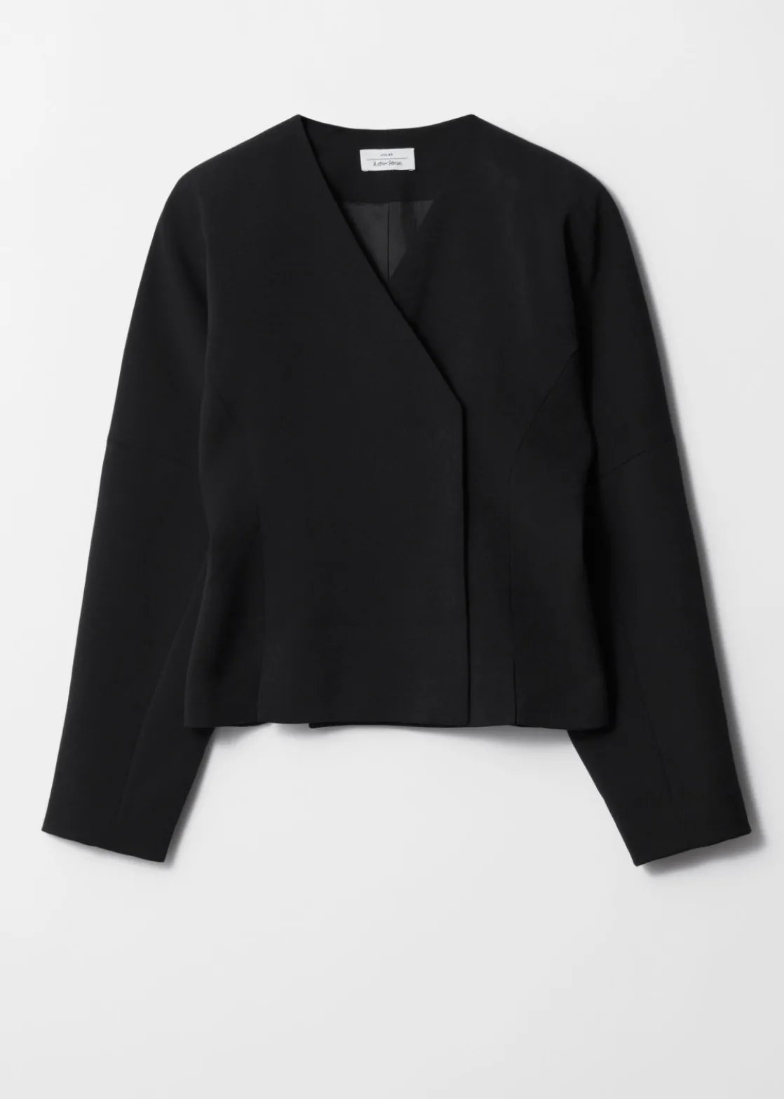 Long-sleeve collarless blazer featuring an overlapping lapel with concealed clasp closures.