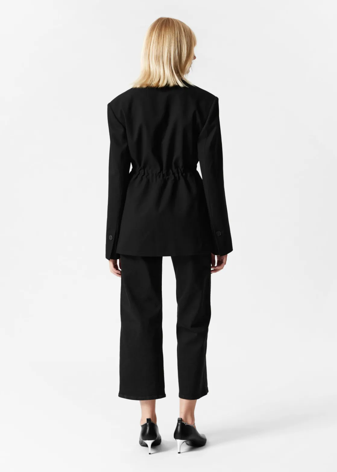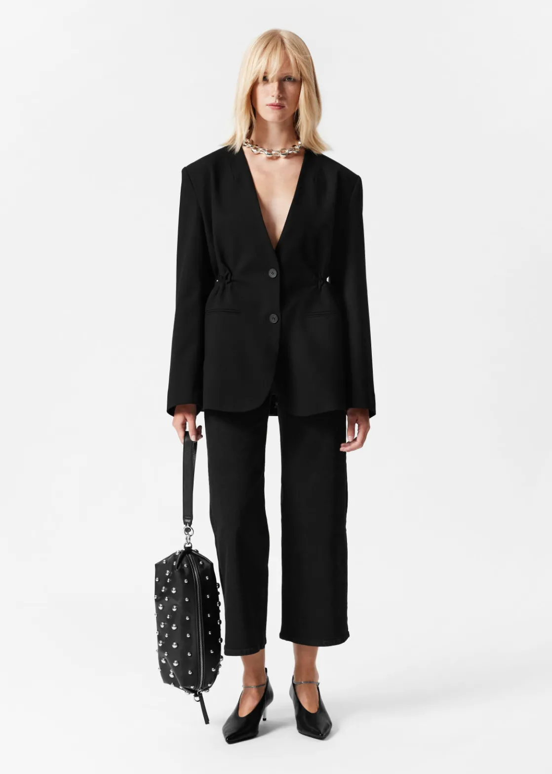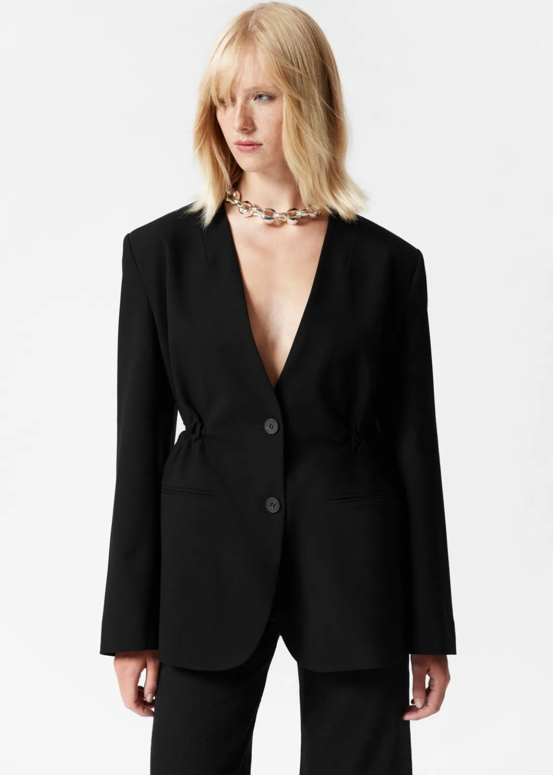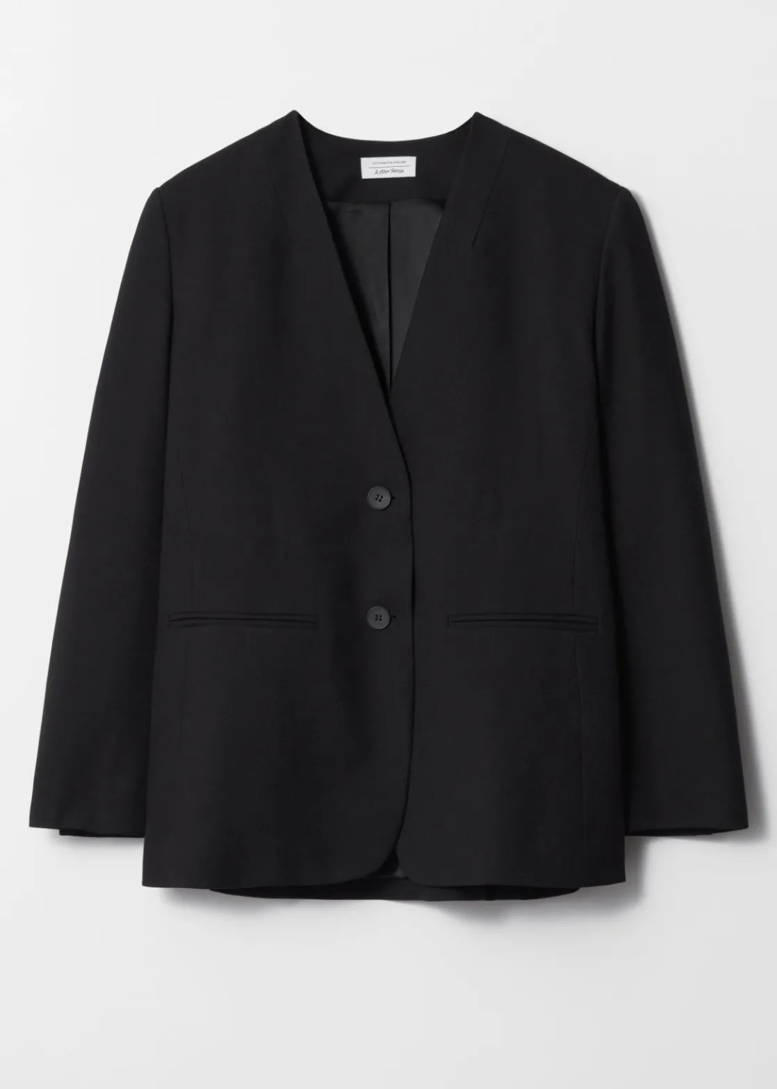 Single-breasted blazer designed with padded shoulders and a collarless, v-cut neckline.