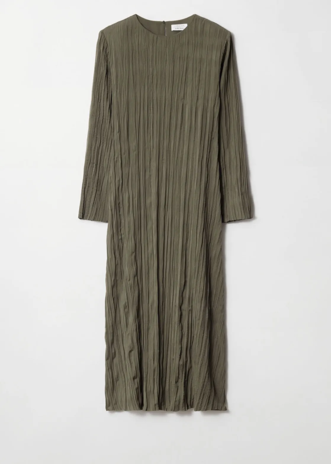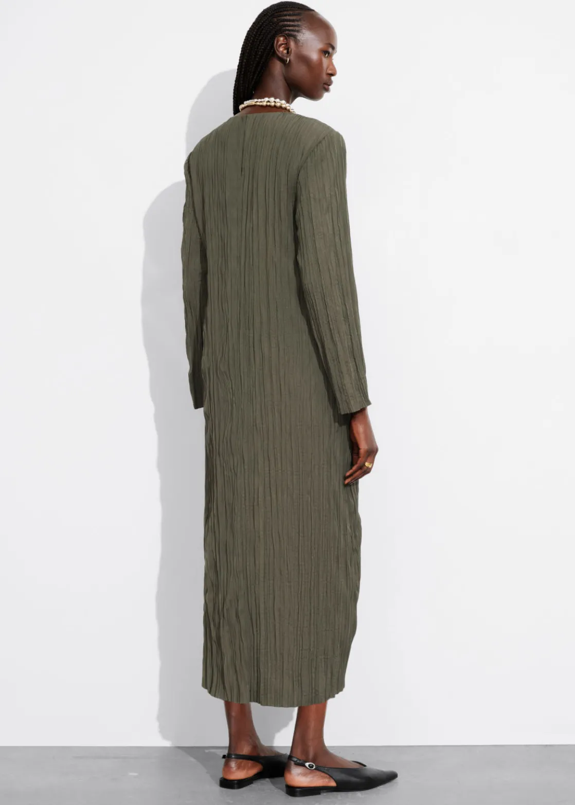 Long-sleeve midi dress defined by a crinkled finish. Finished with padded shoulders.