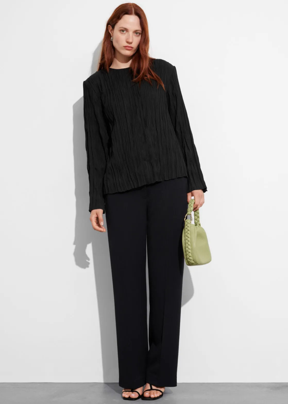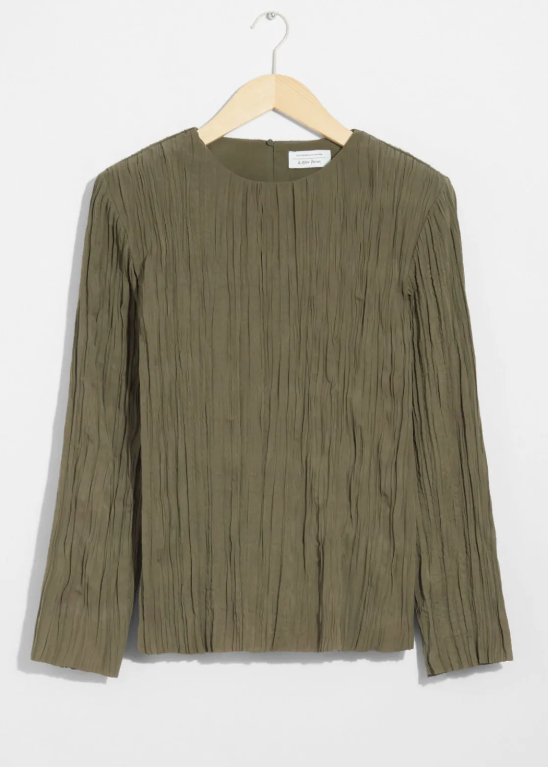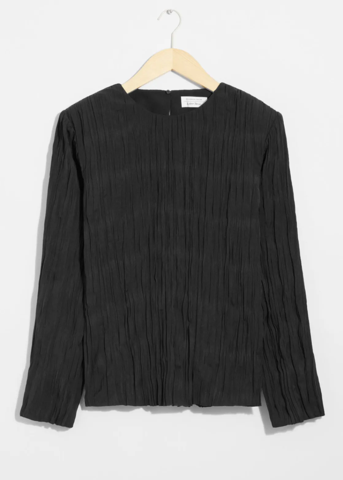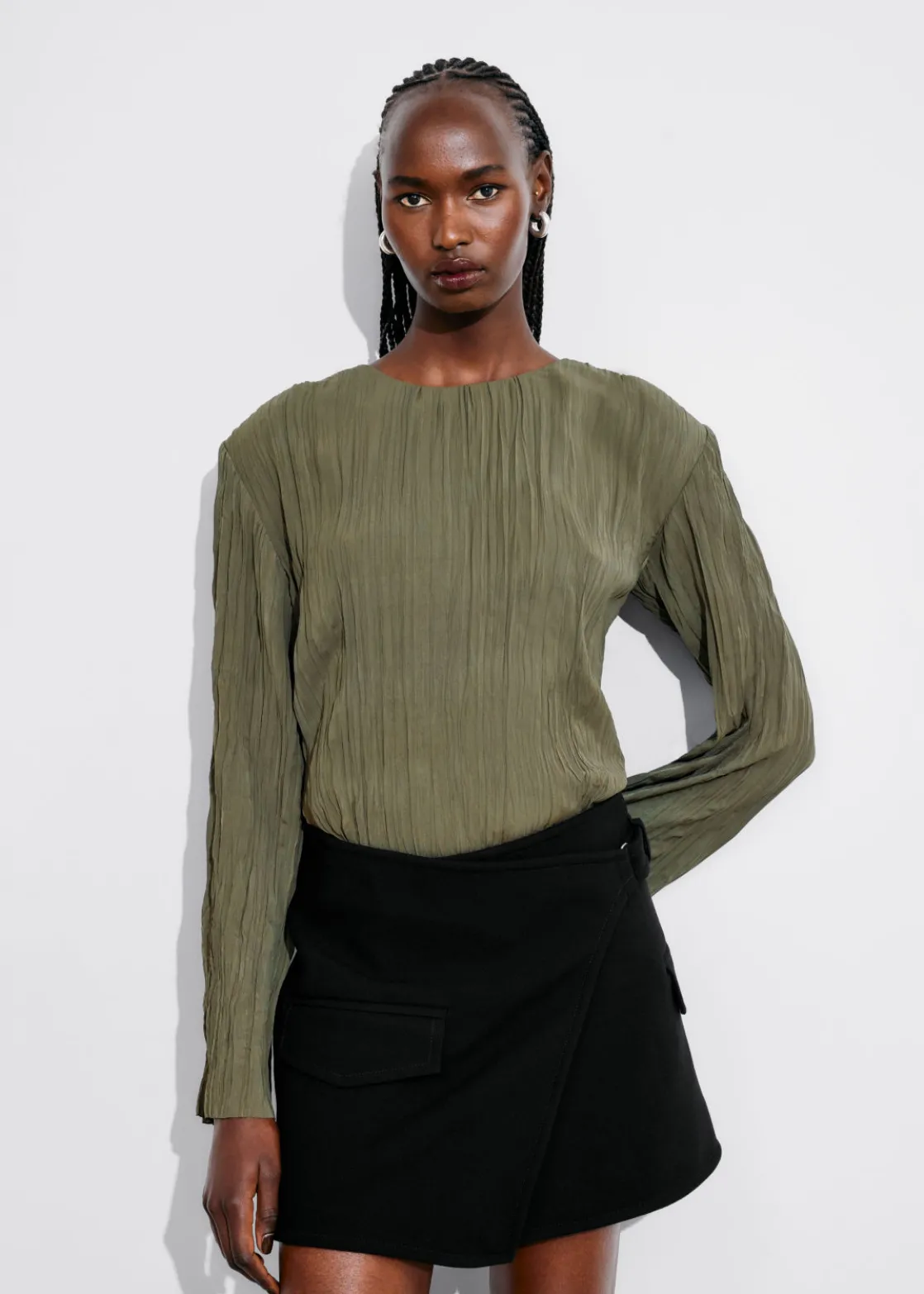 Long-sleeve top featuring a crinkled finish and padded shoulders.