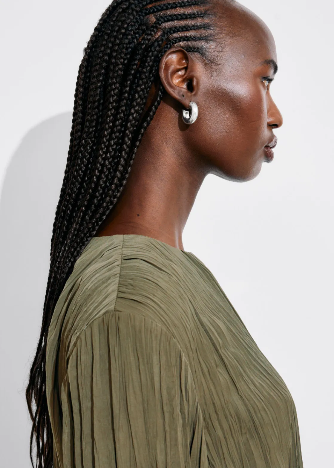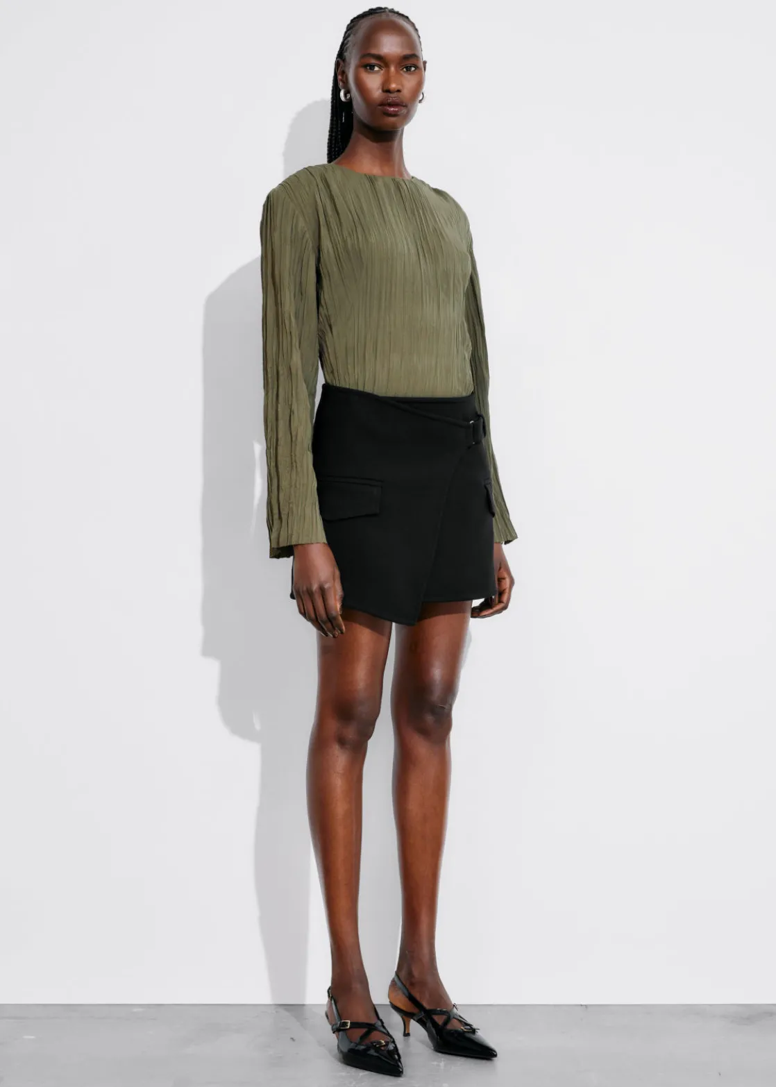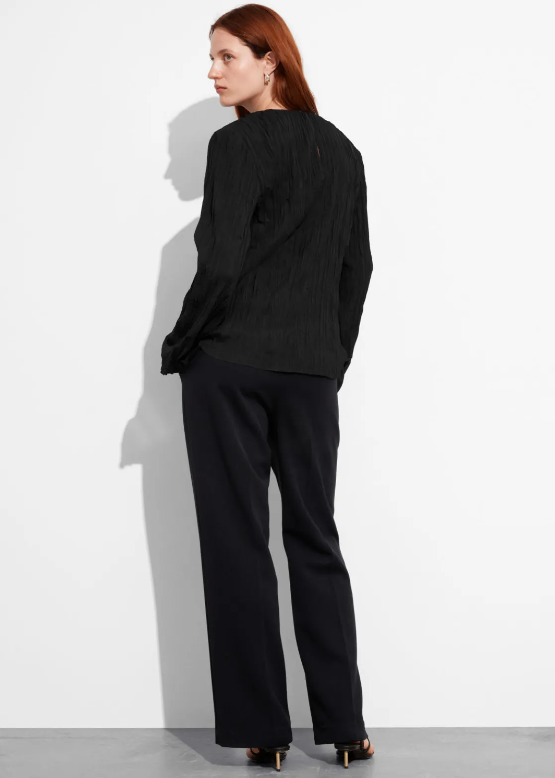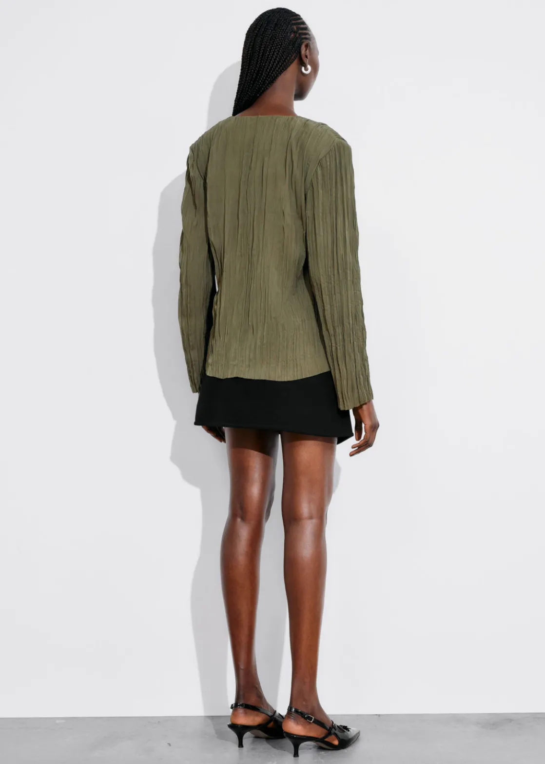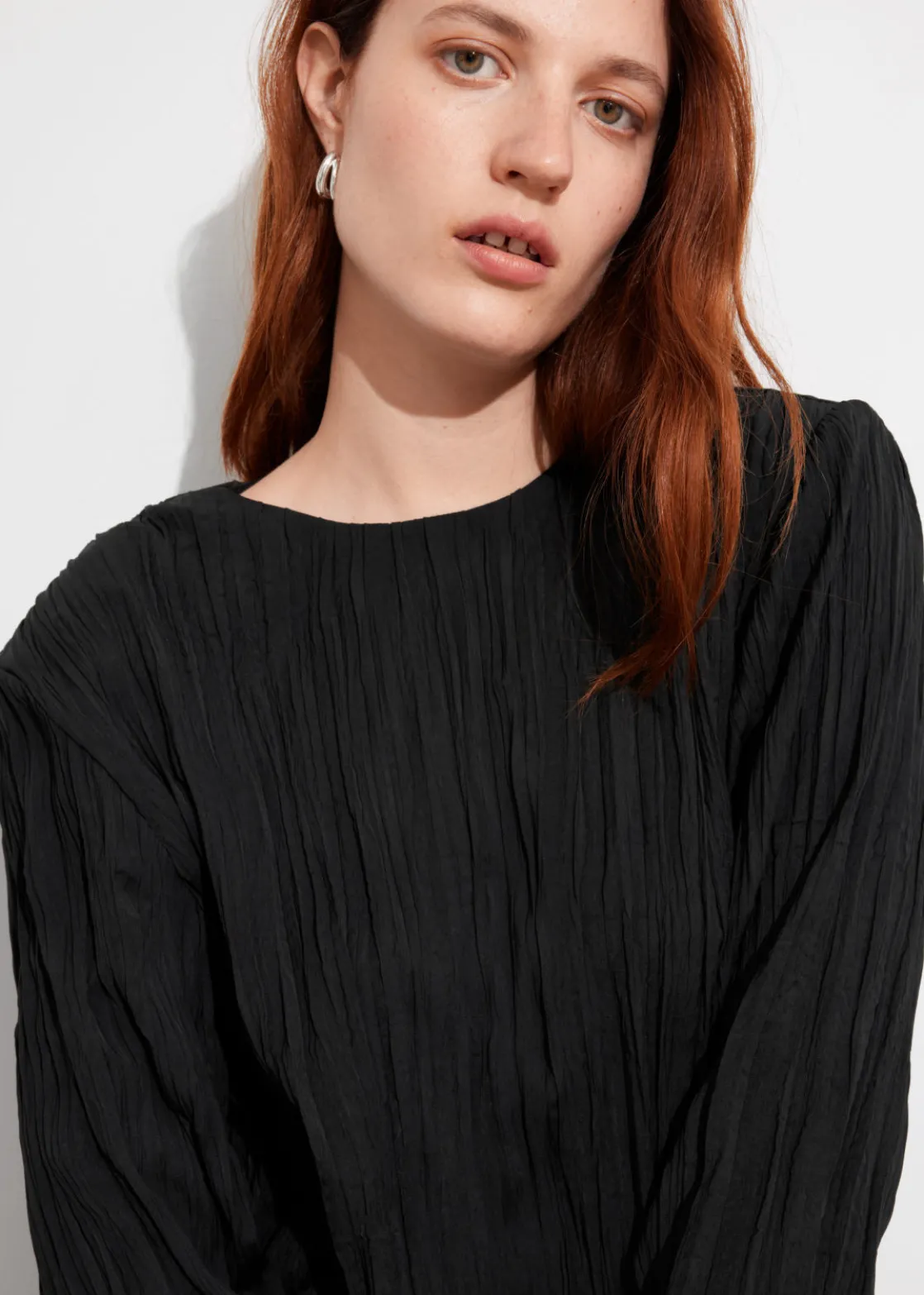 Long-sleeve top featuring a crinkled finish and padded shoulders.