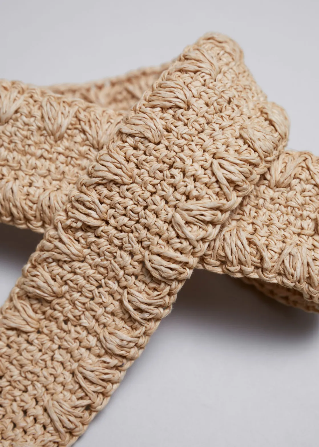 This belt is made from intricately woven elastic straw, meticulously braided together to create a crochet texture. Detailed with a gold-tone buckle.