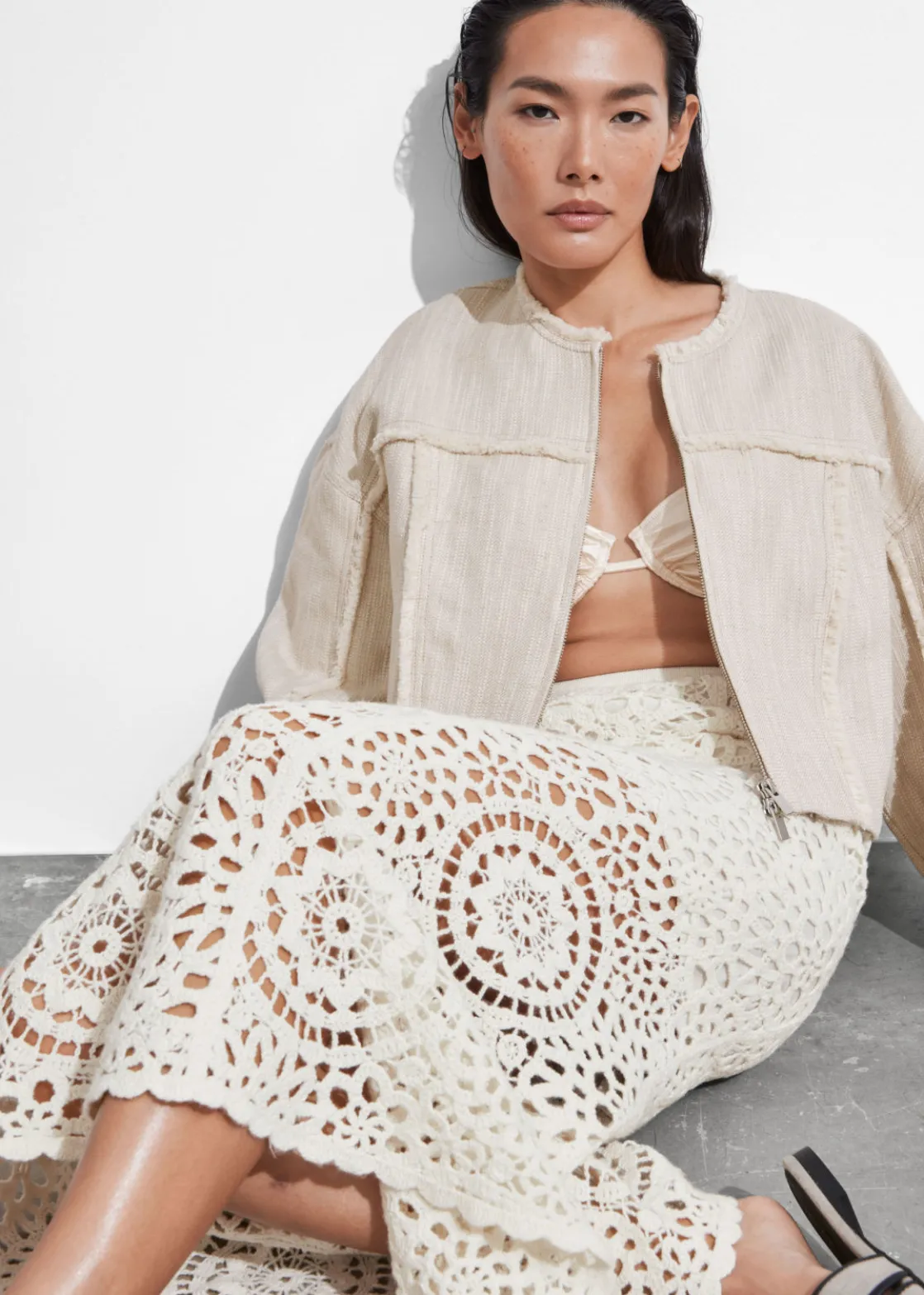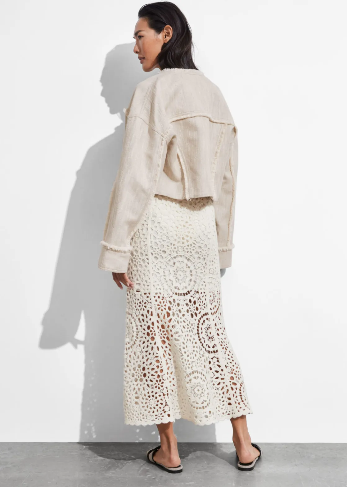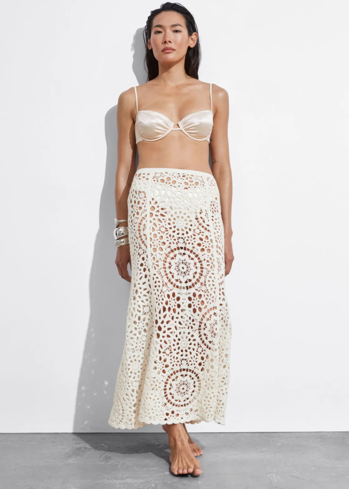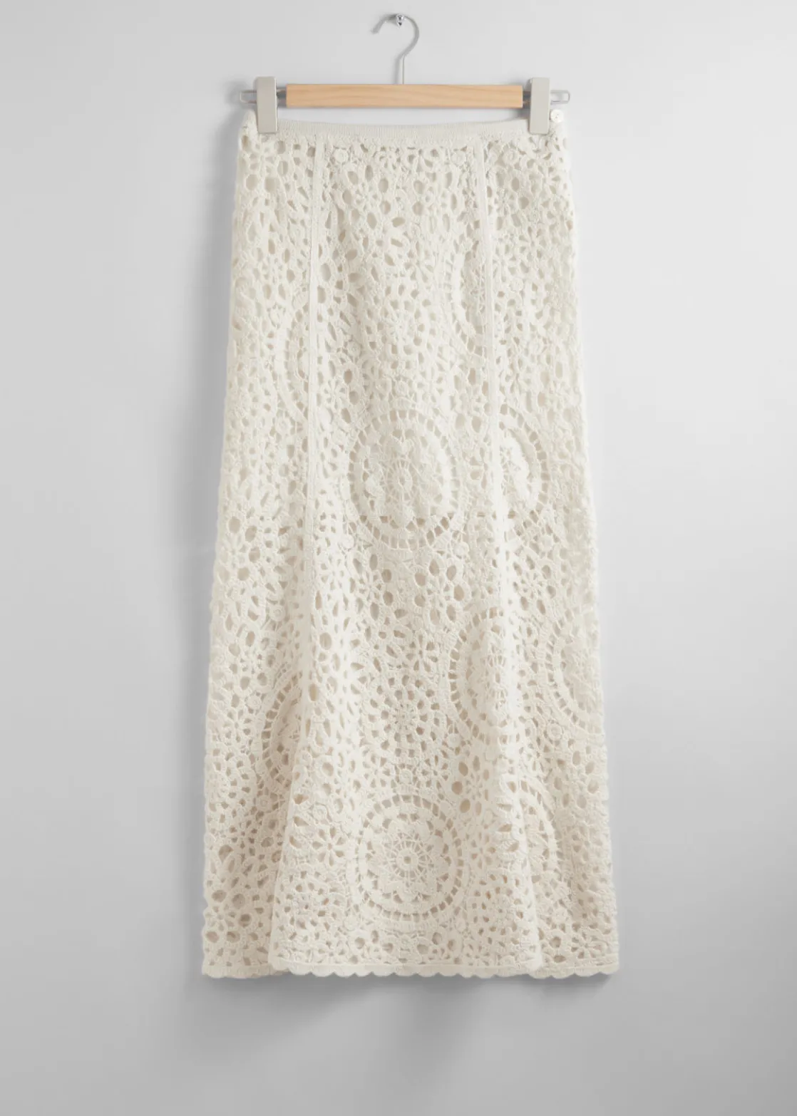 Crocheted high-waist midi skirt finished with a scalloped hemline.