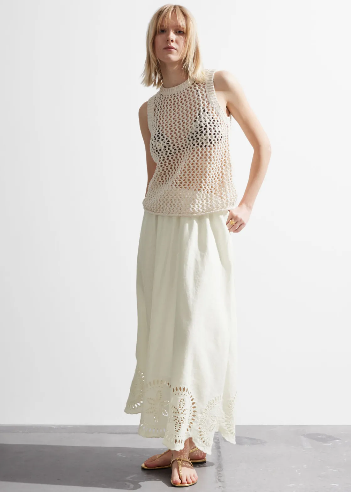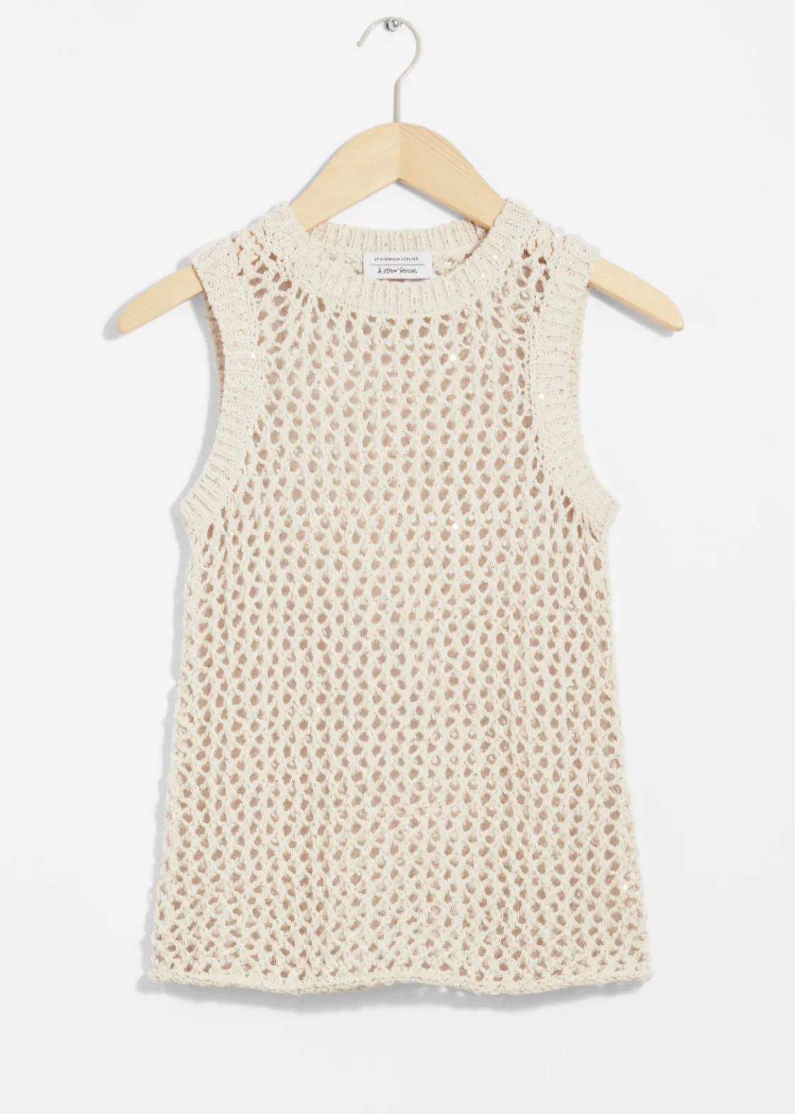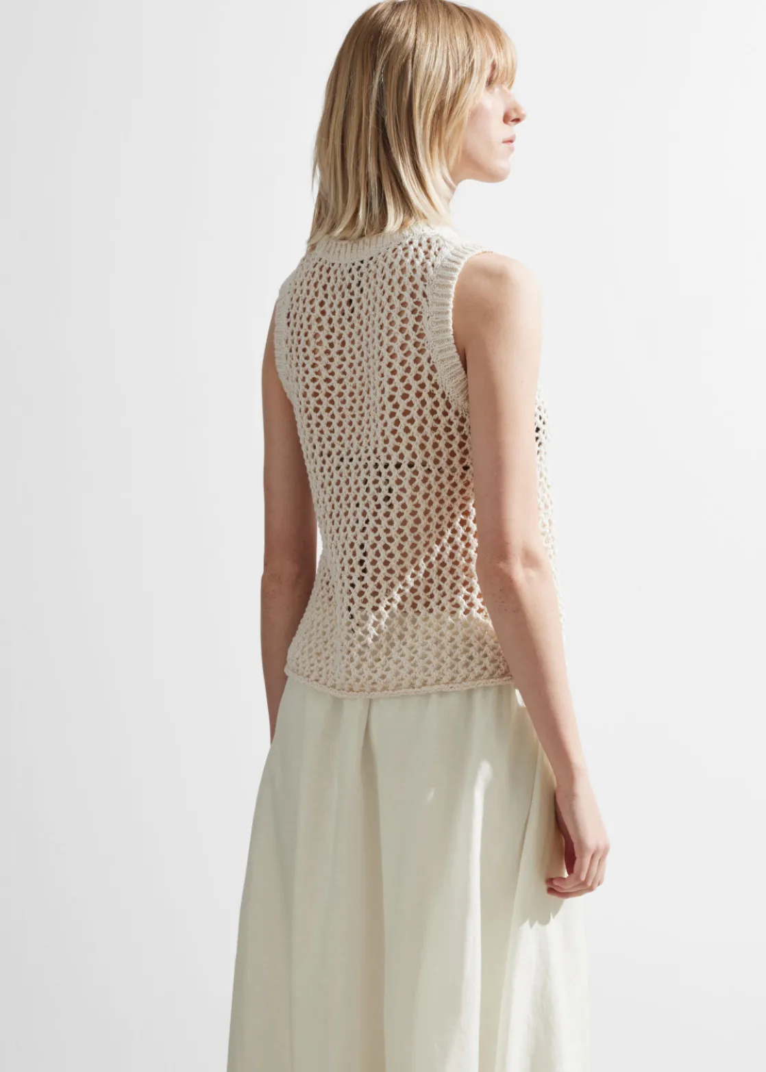 Crocheted tank top featuring a slim silhouette and a round neckline.