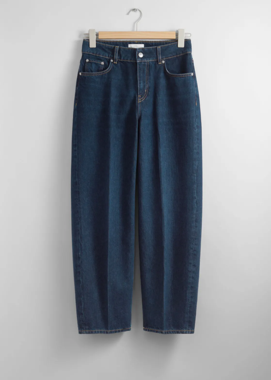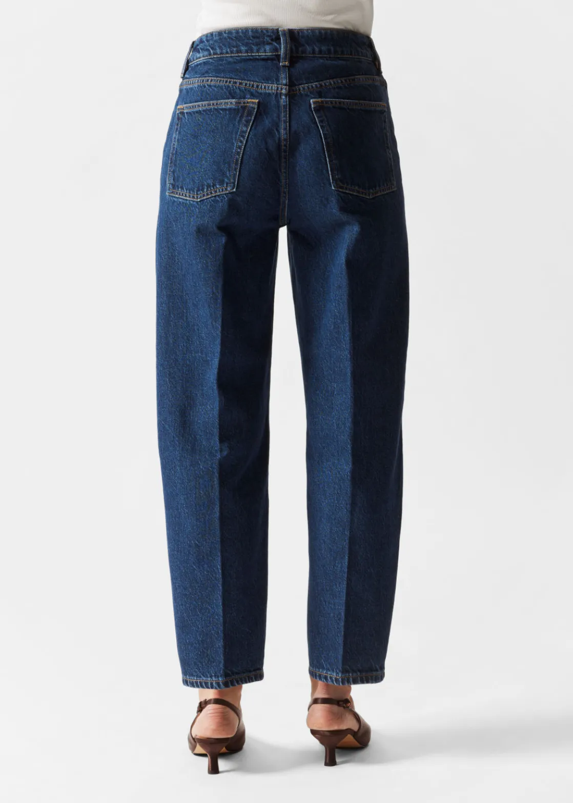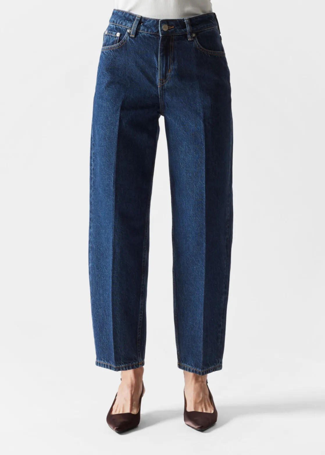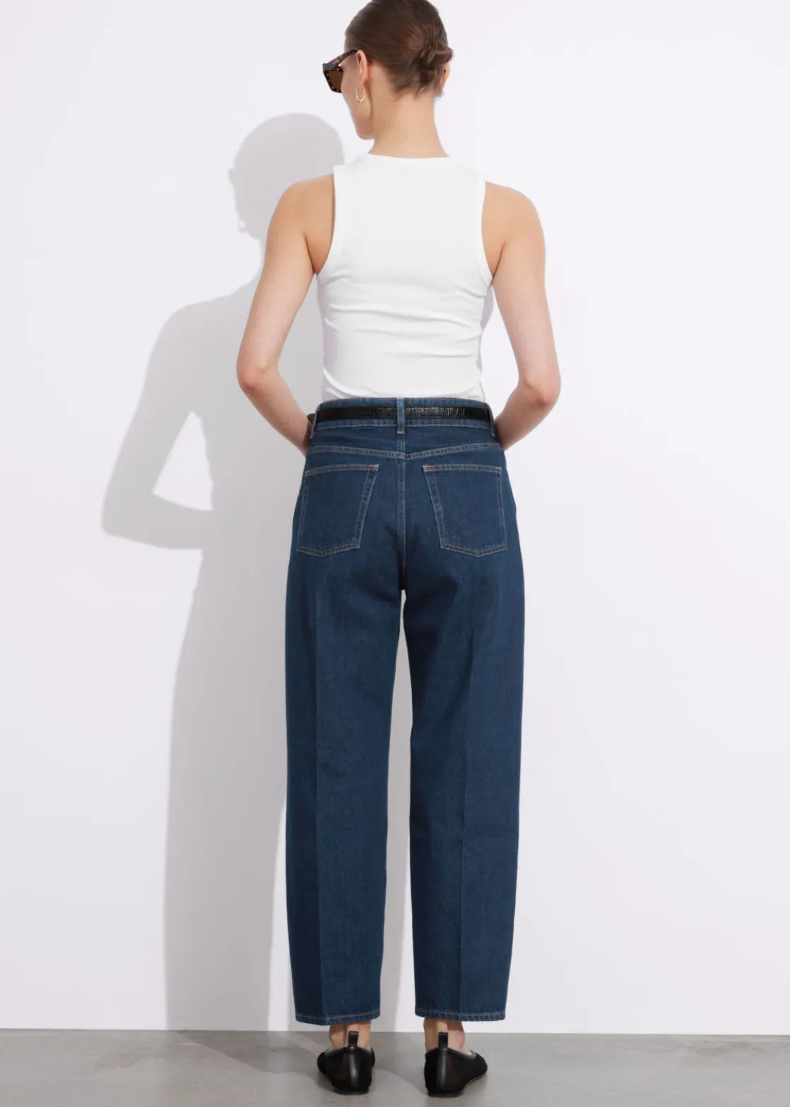 Denim jeans featuring a cropped, barrel-shaped leg and a classic five-pocket finish.