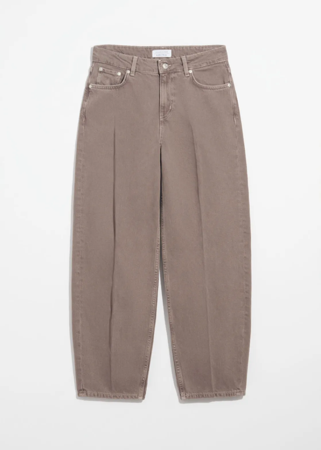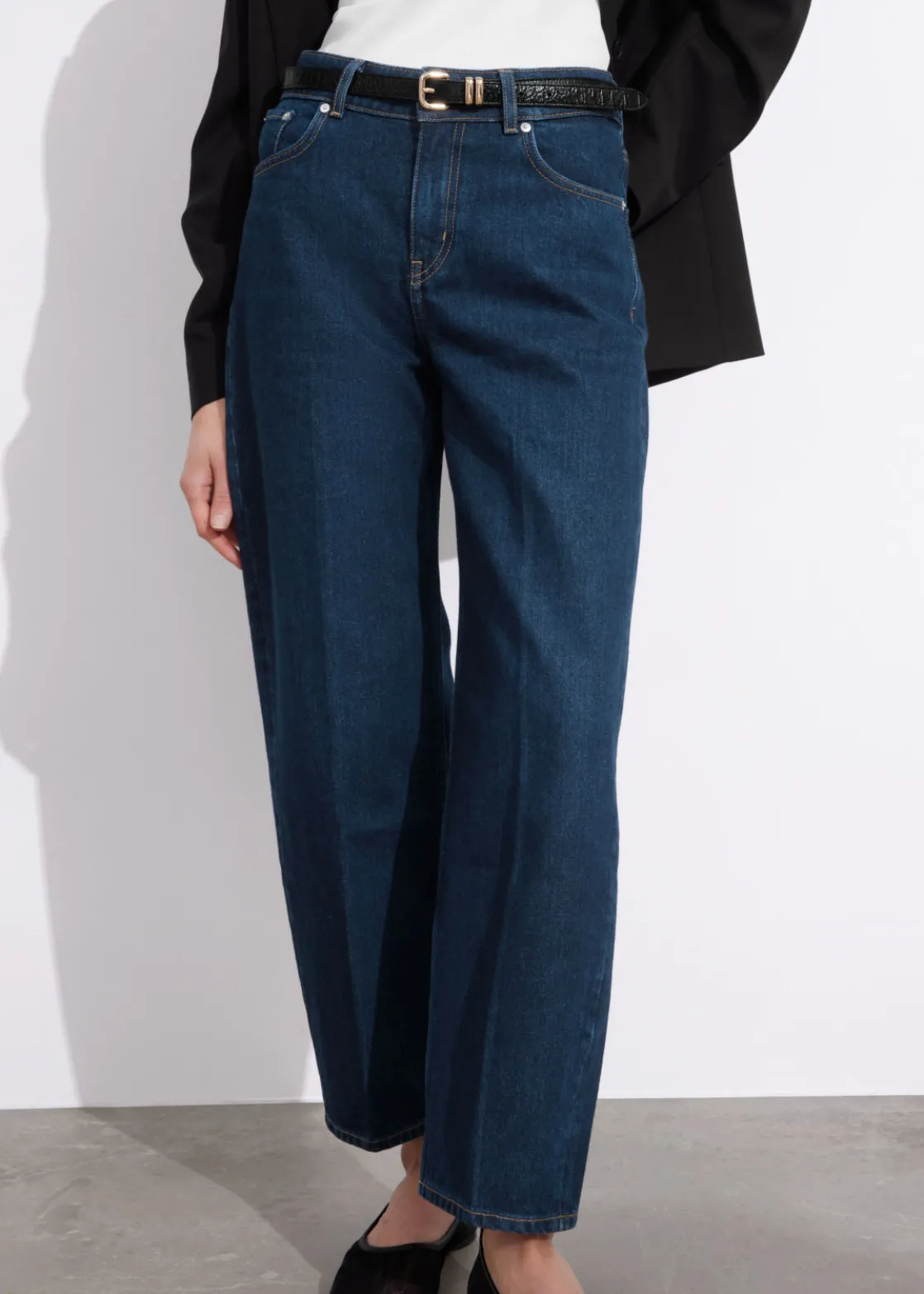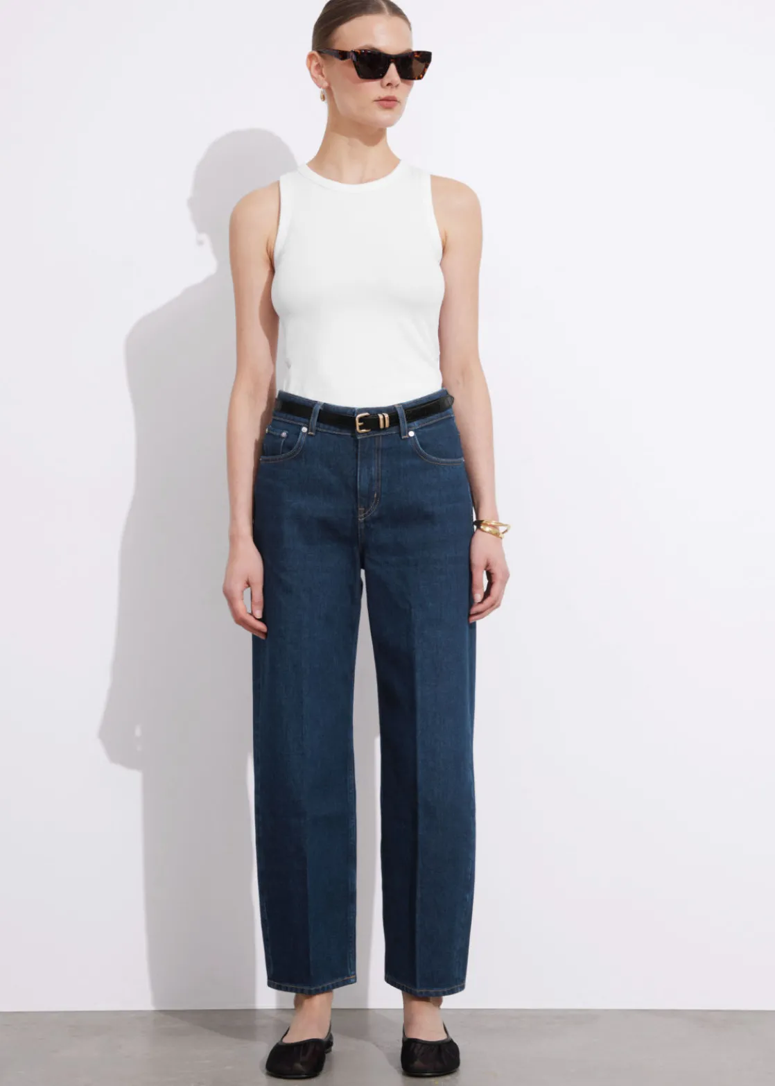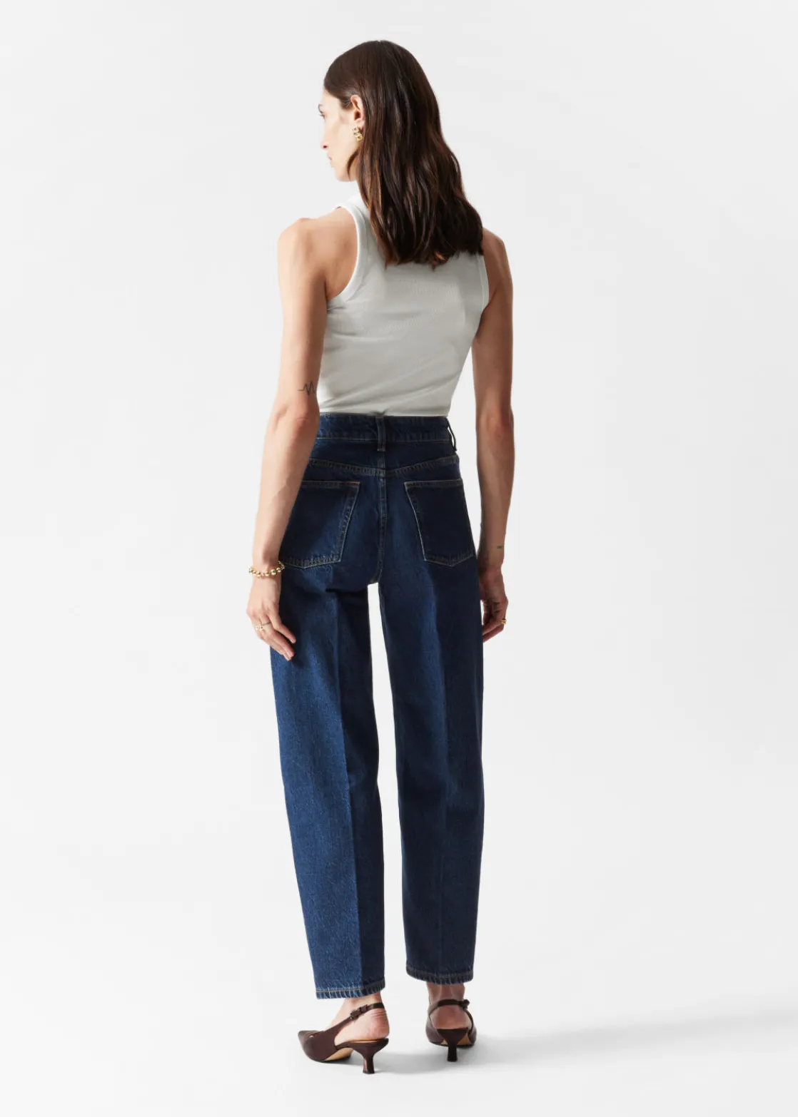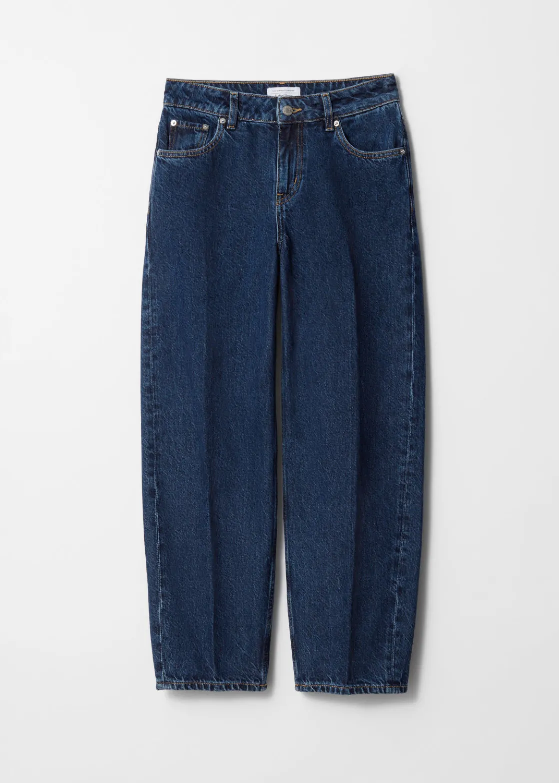 Denim jeans featuring a cropped, barrel-shaped leg and a classic five-pocket finish.