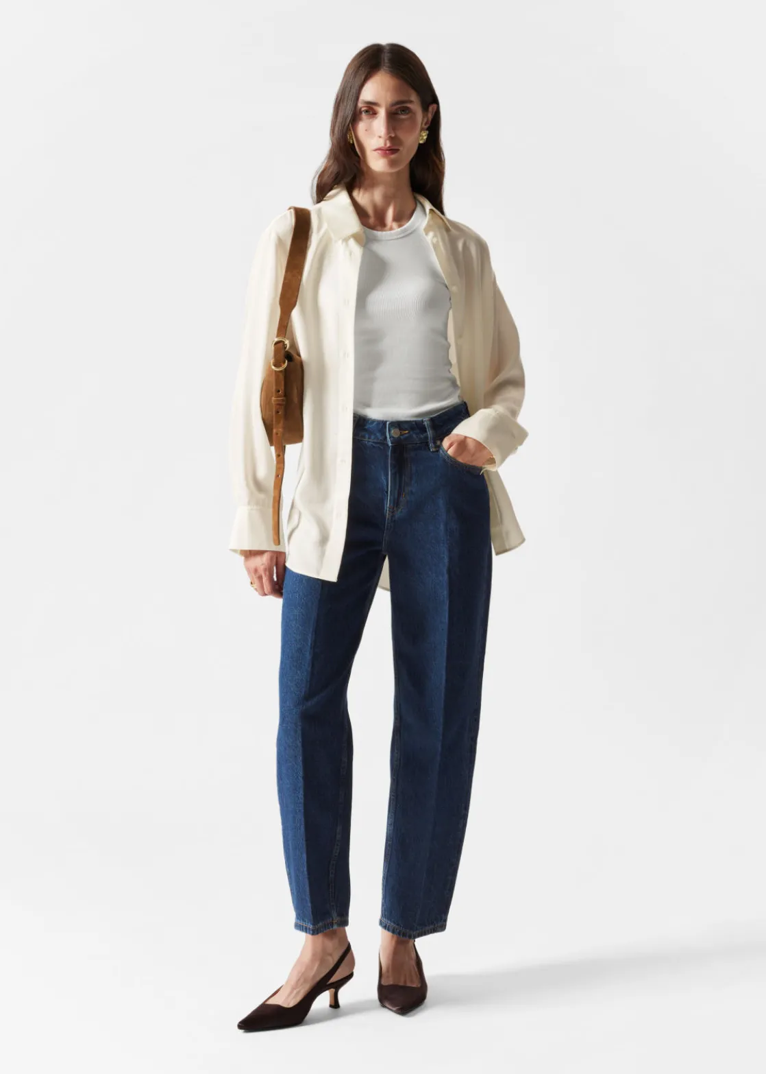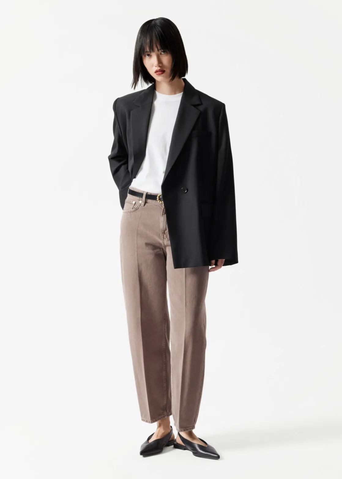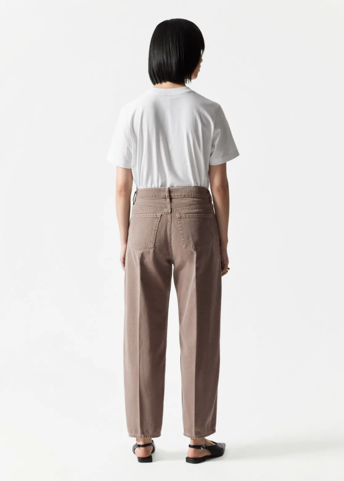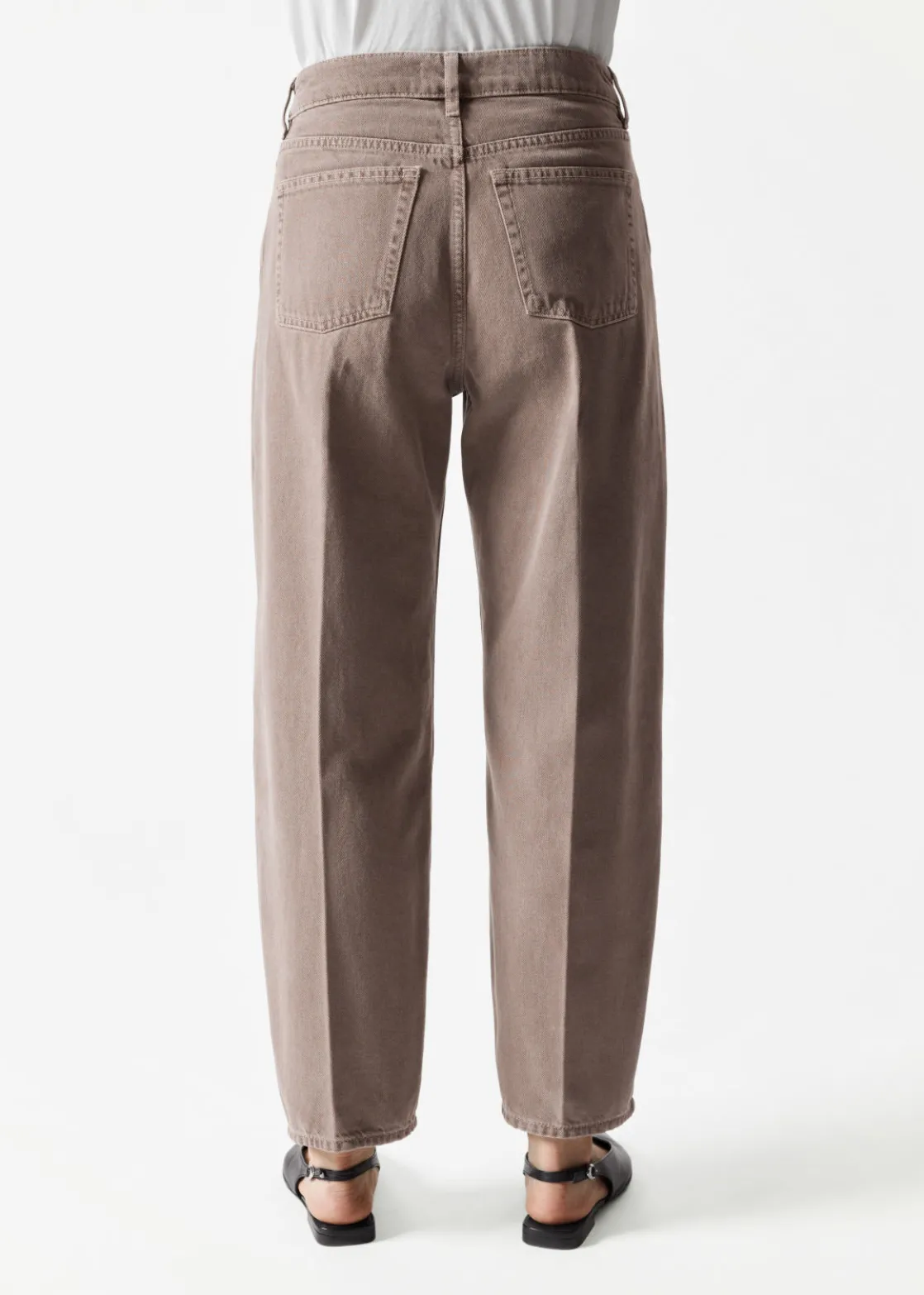 Denim jeans featuring a cropped, barrel-shaped leg and a classic five-pocket finish.