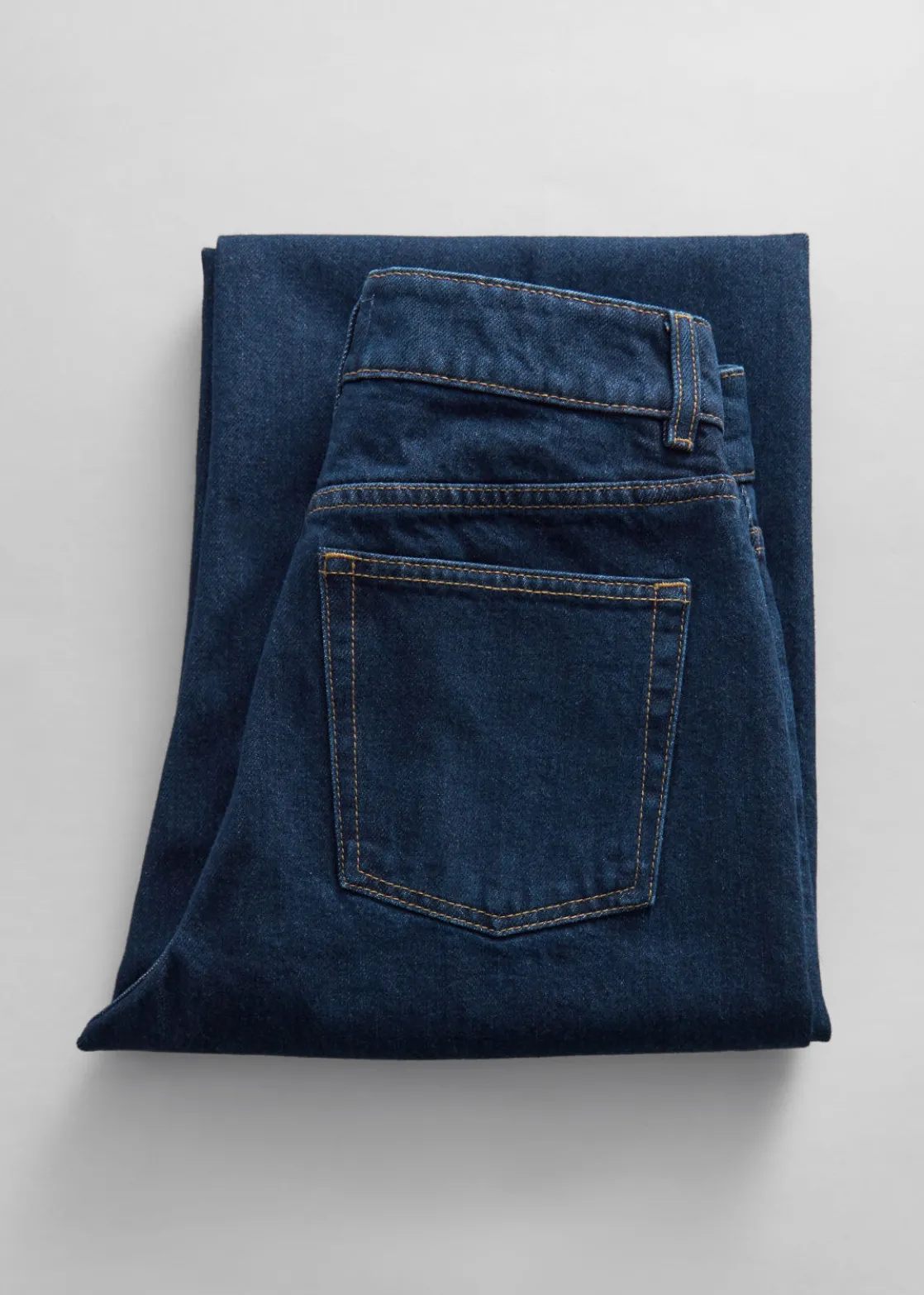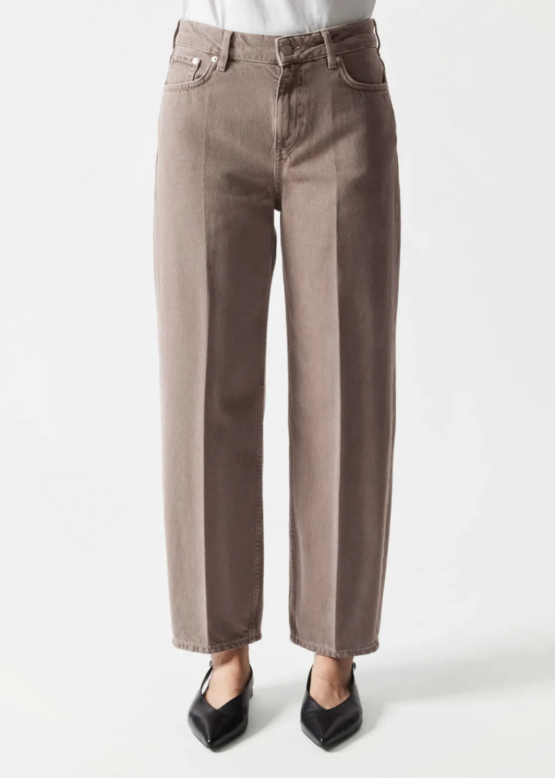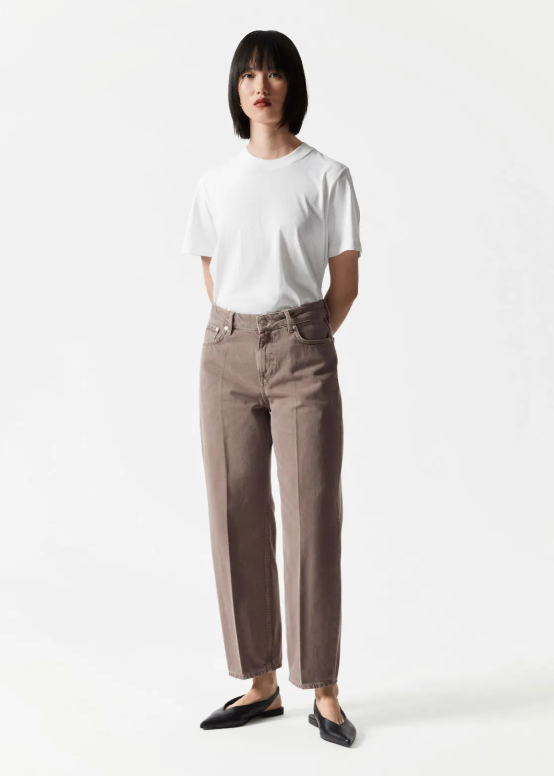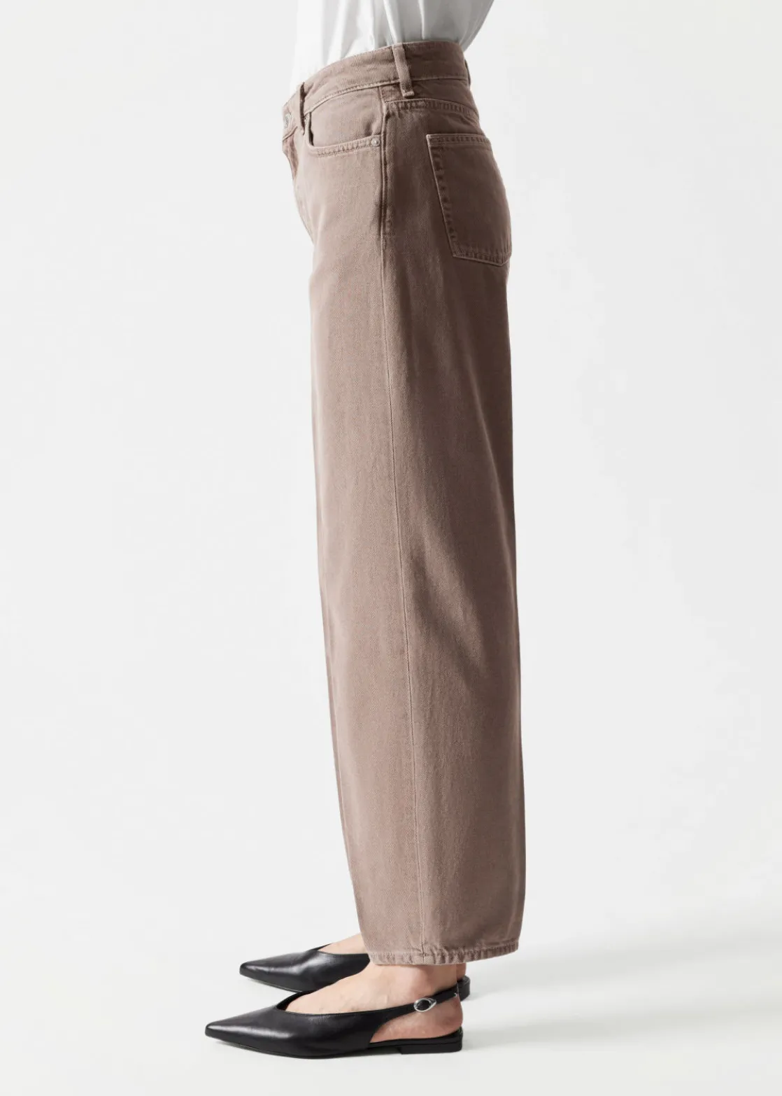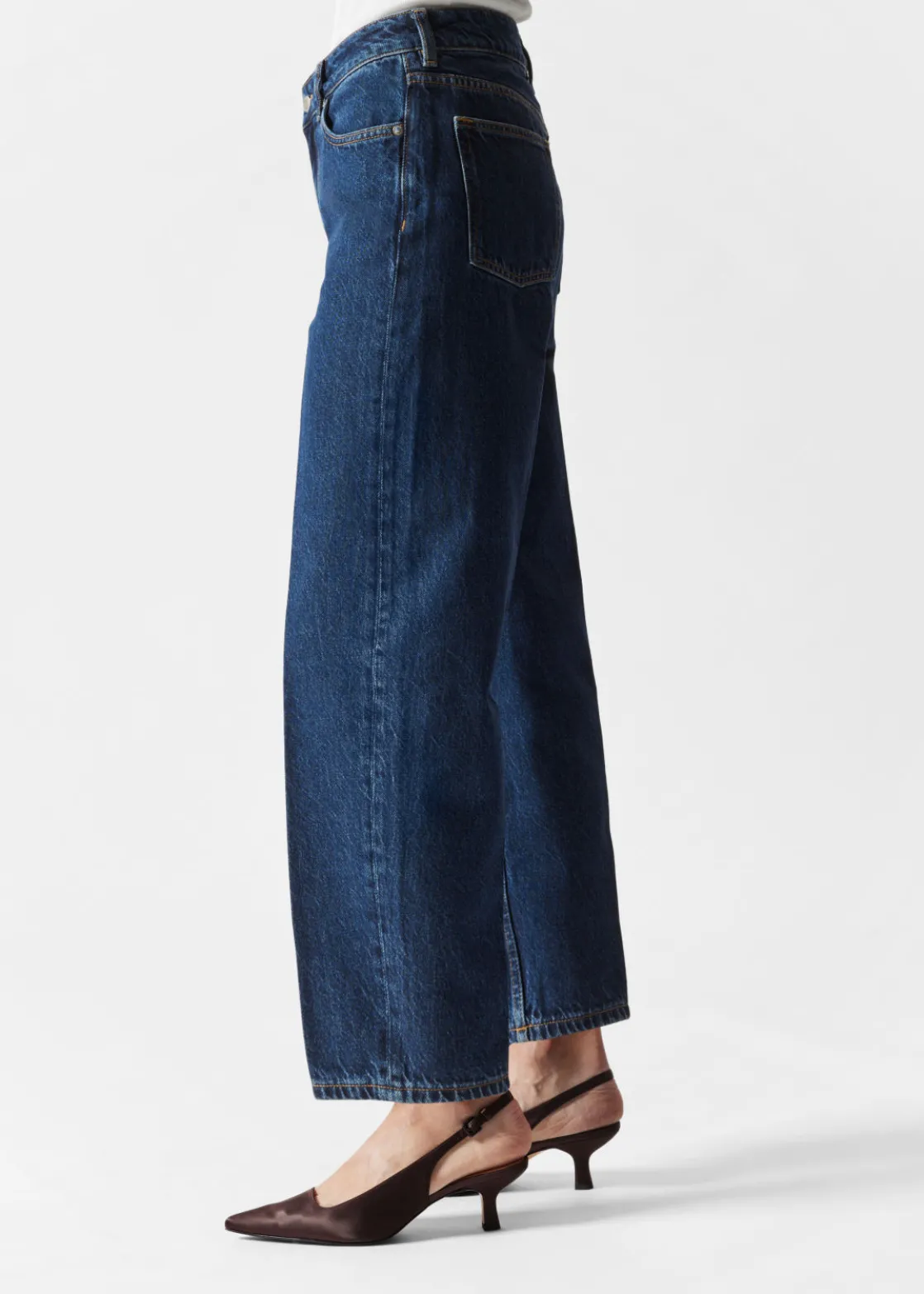 Denim jeans featuring a cropped, barrel-shaped leg and a classic five-pocket finish.