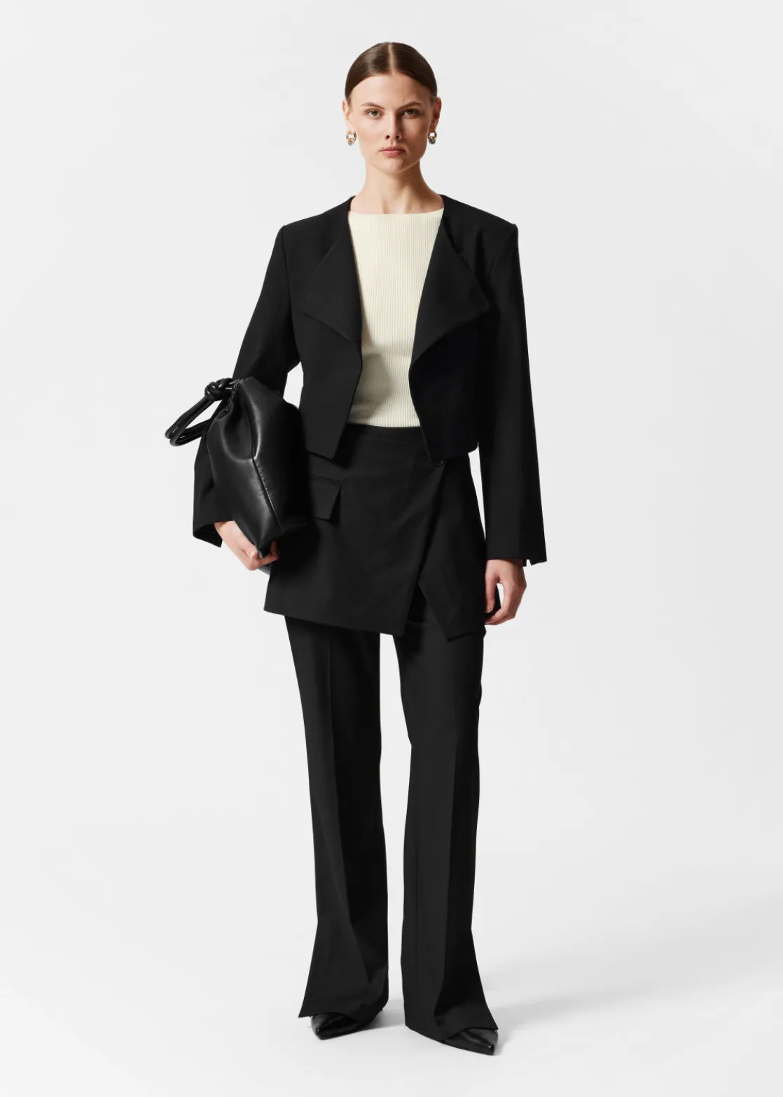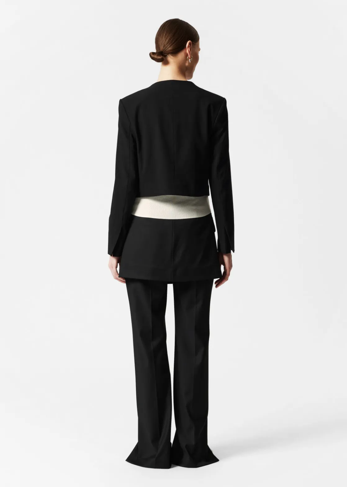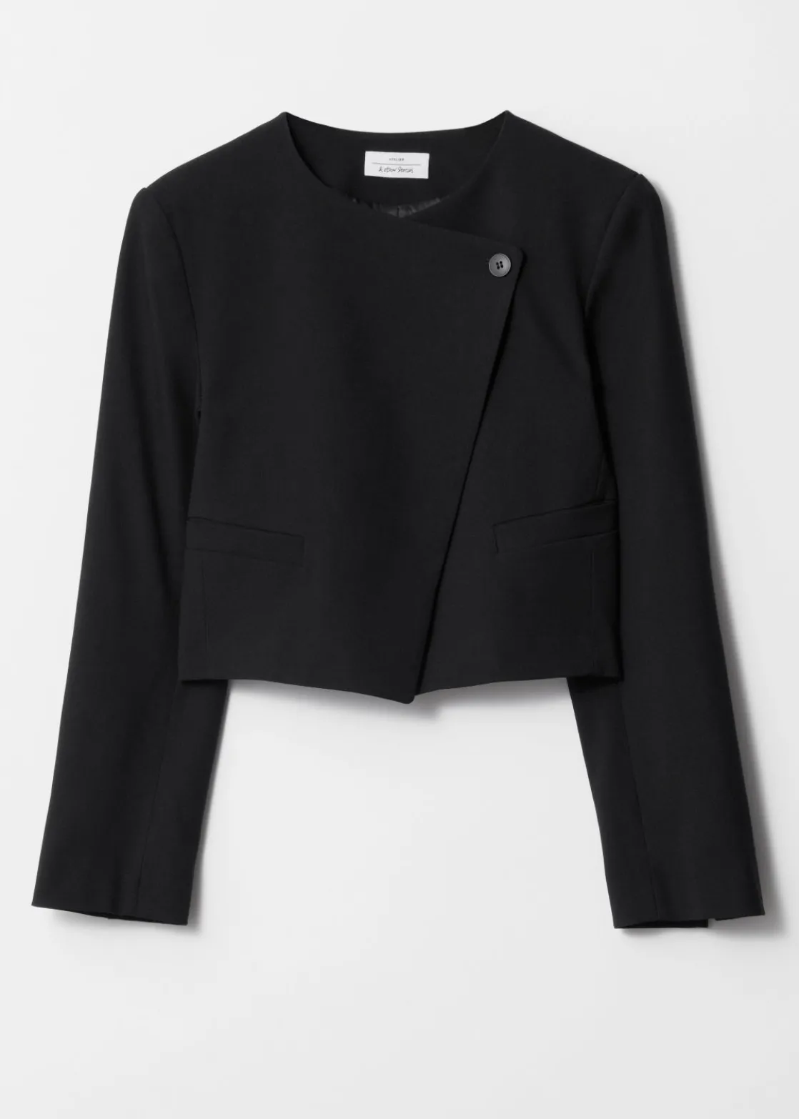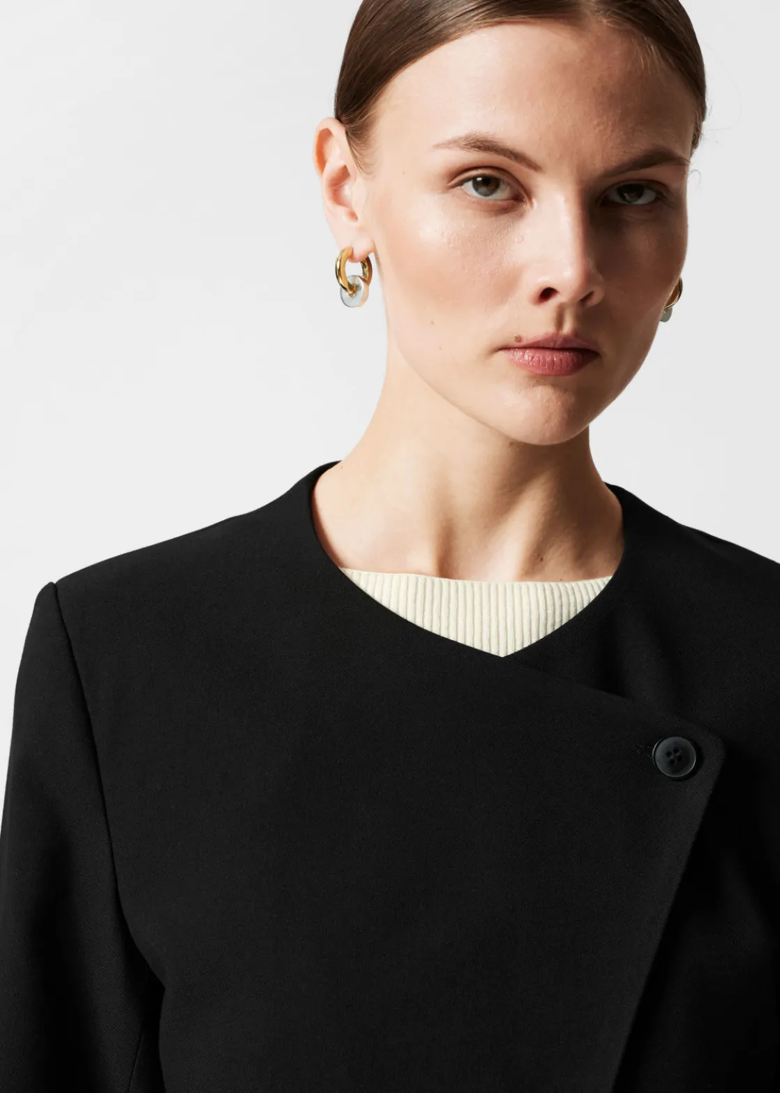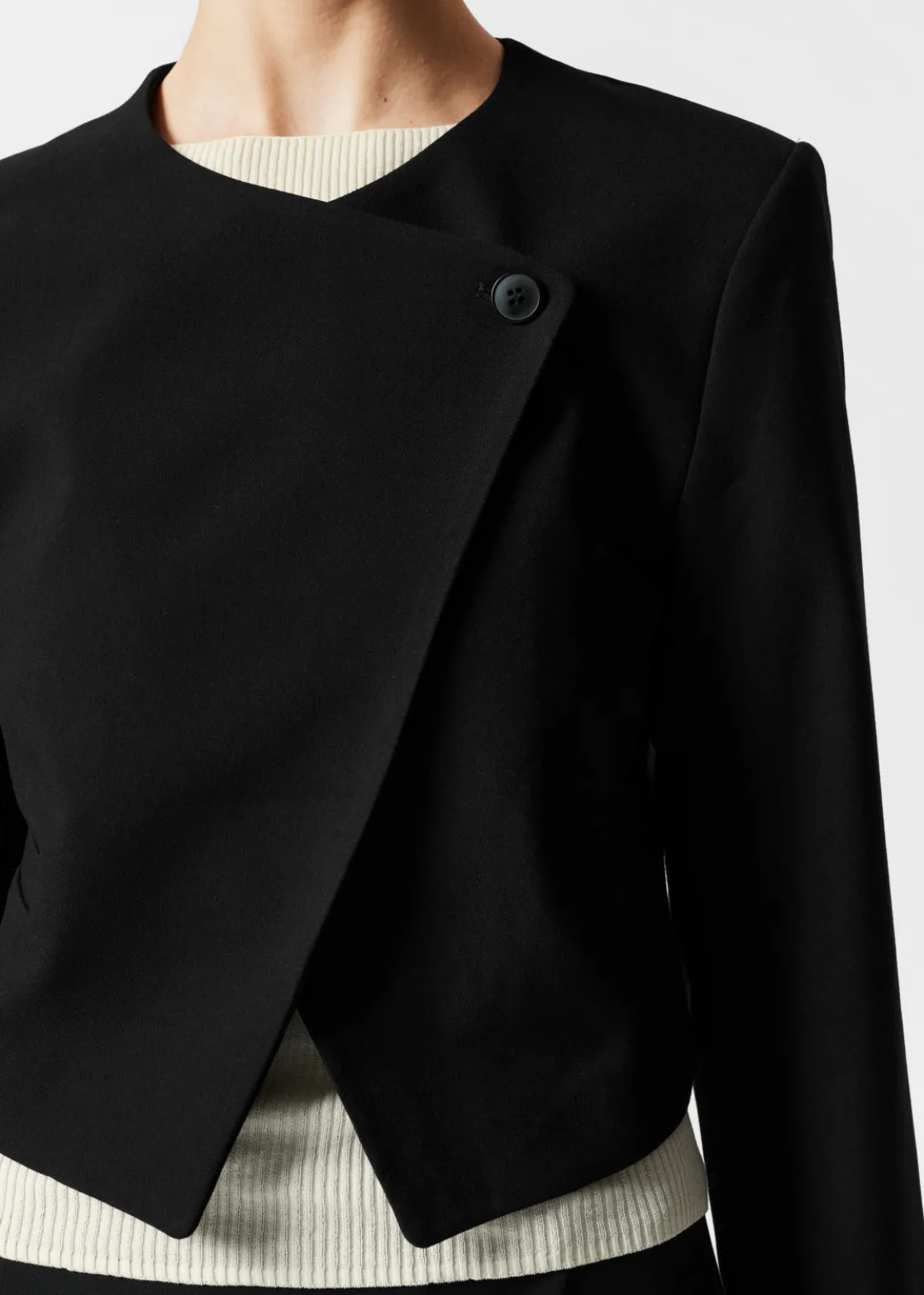 Collarless blazer in a cropped silhouette. Featuring a single-breasted, overlapping finish.