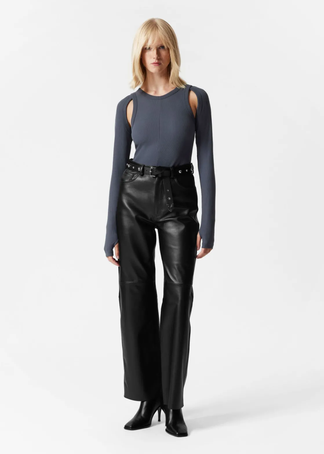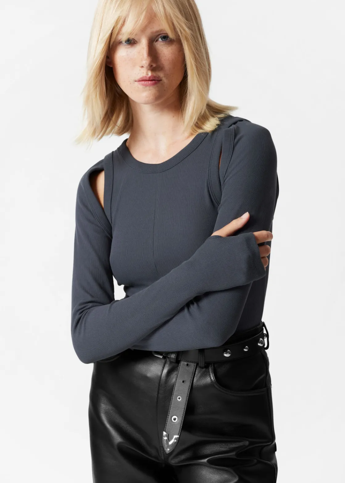 Long-sleeve tank top defined by cut-out detailing at the sleeve openings.