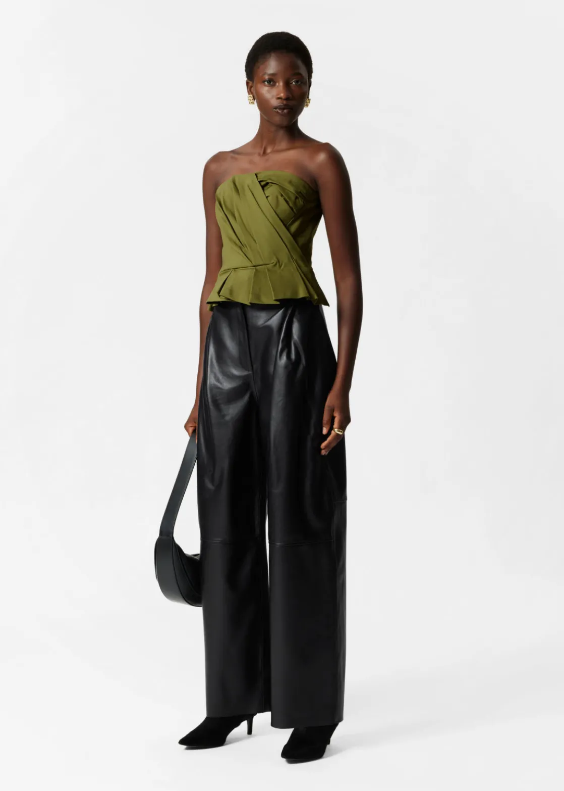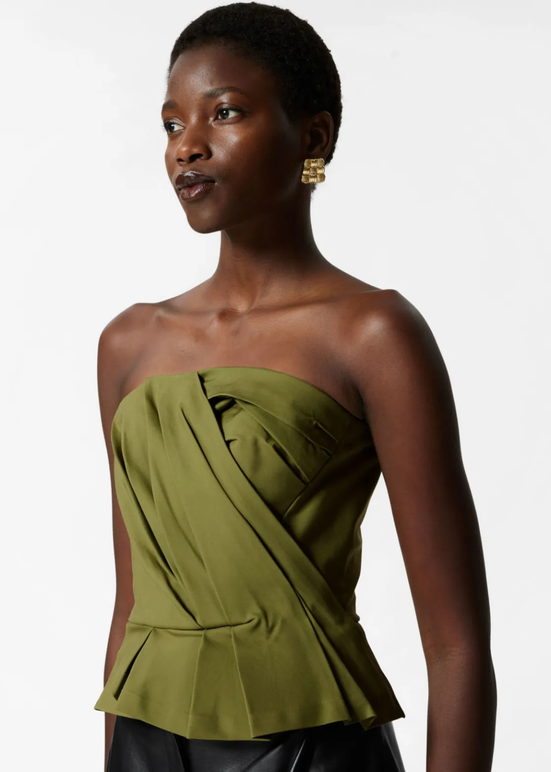 Bustier top featuring a draped finish that falls to an asymmetric hemline.