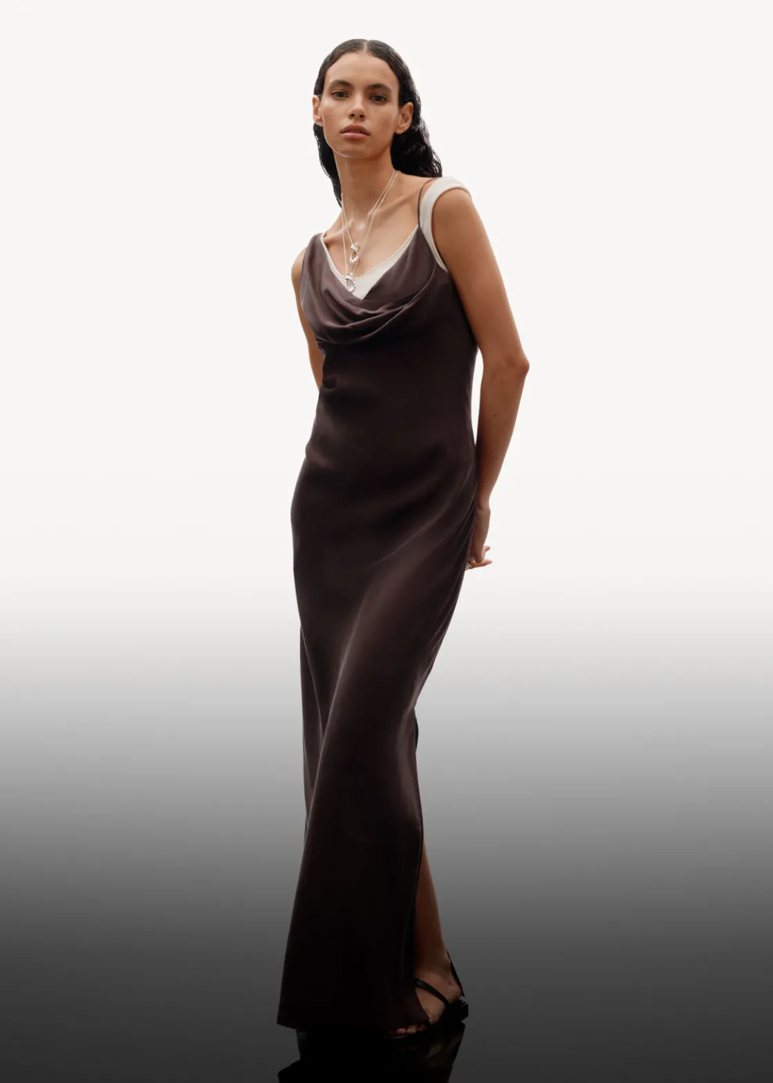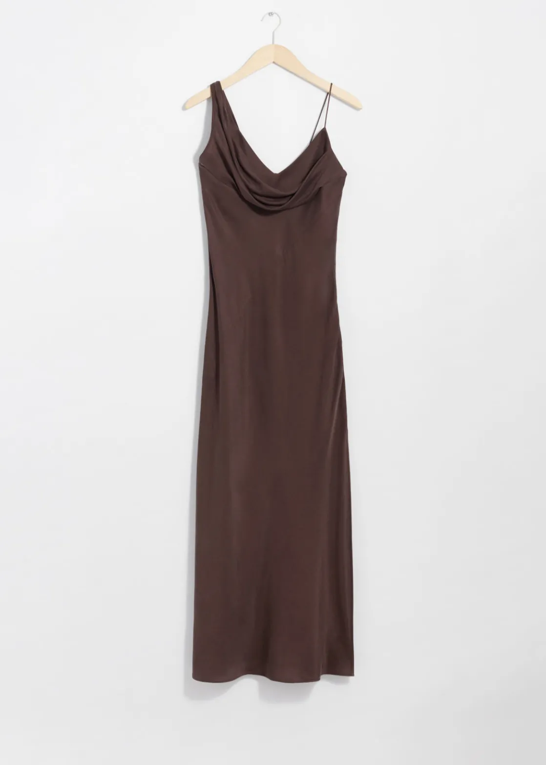 Sleeveless midi dress crafted from silk. Featuring a draped, asymmetric neckline.