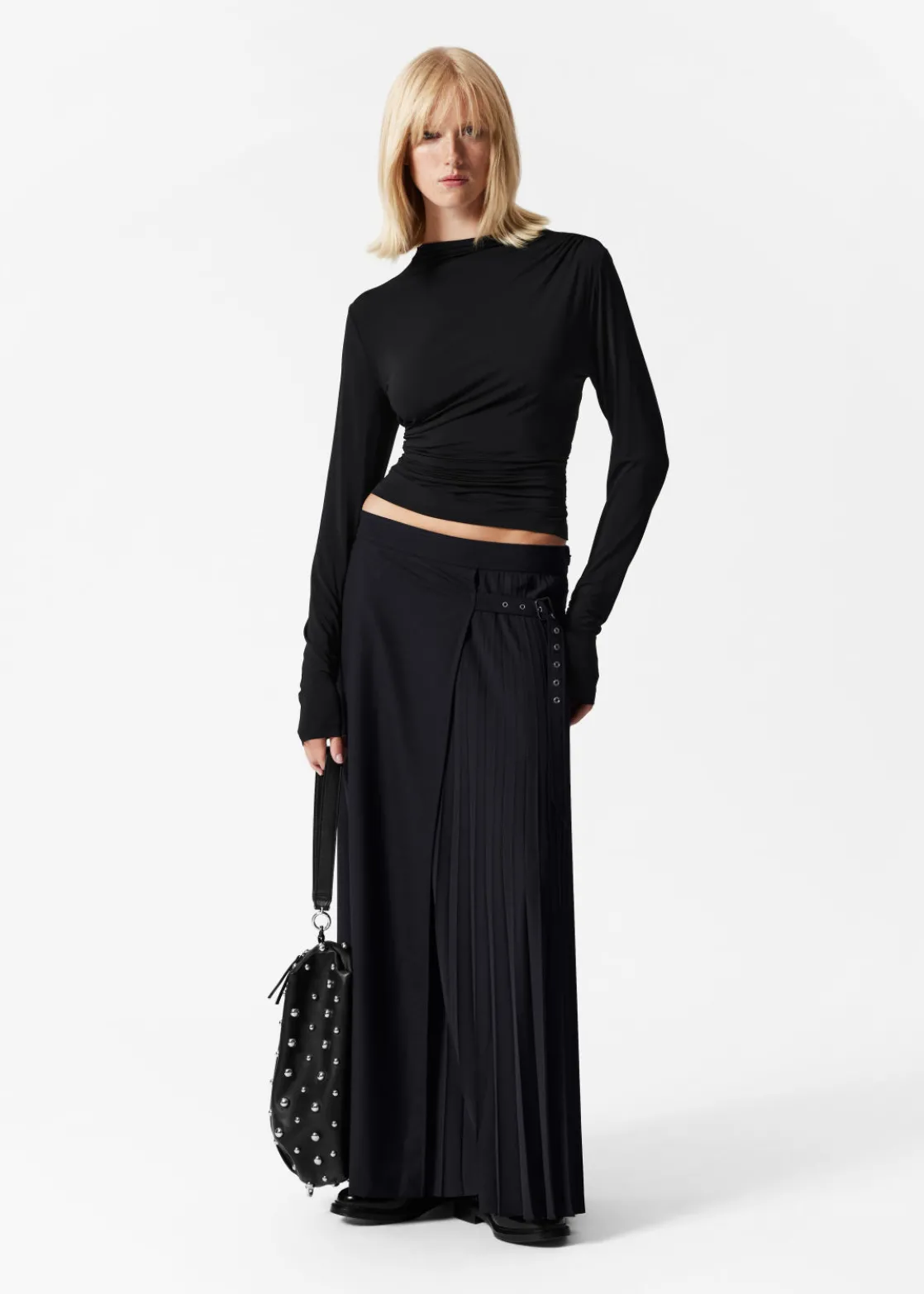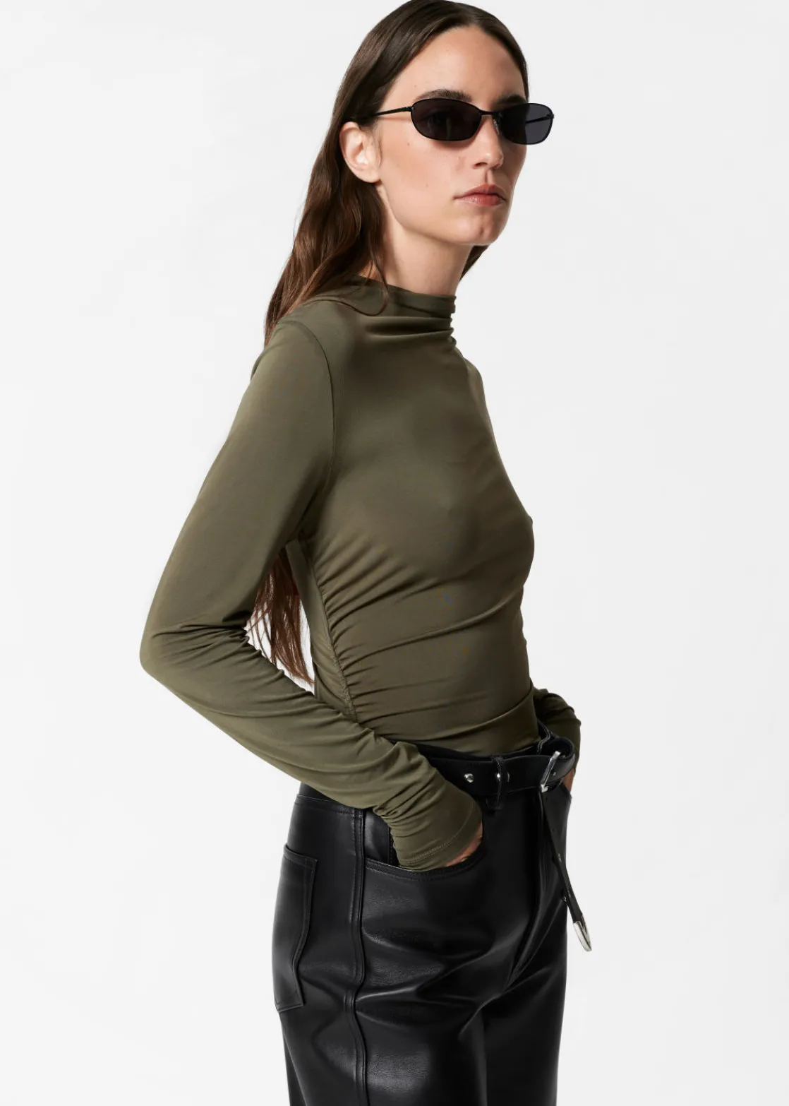Long-sleeve top featuring a mock neck and a gently draped finish.