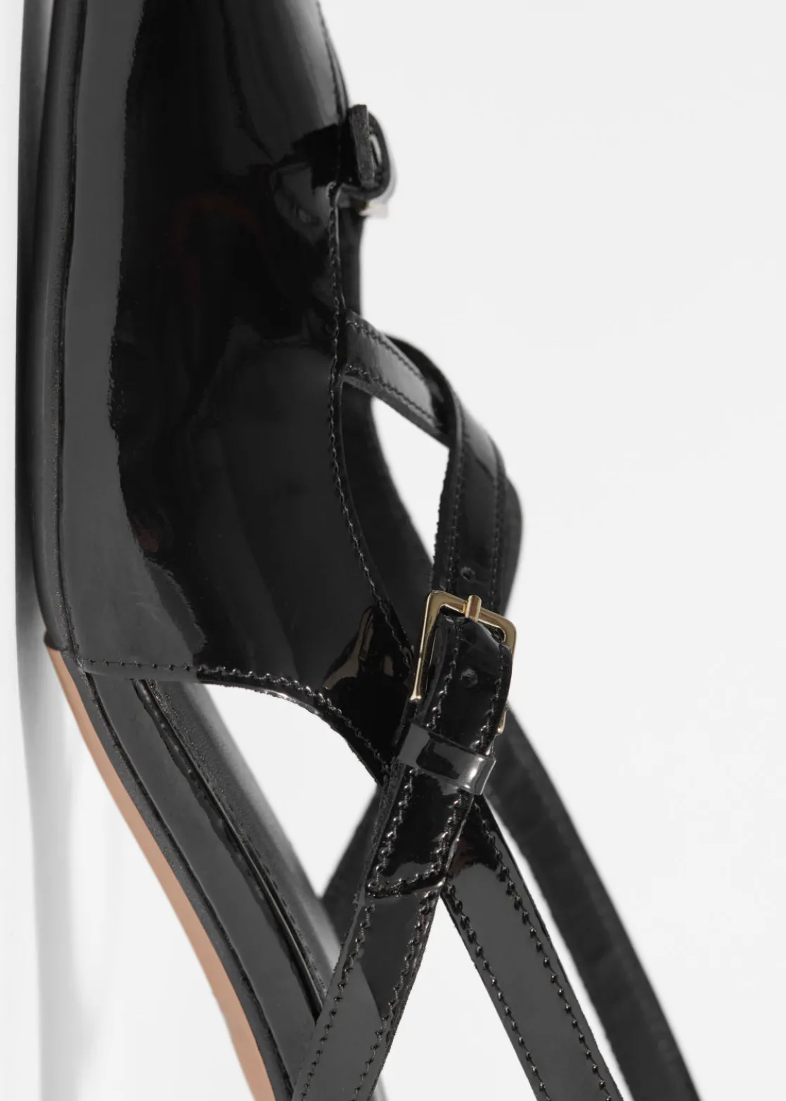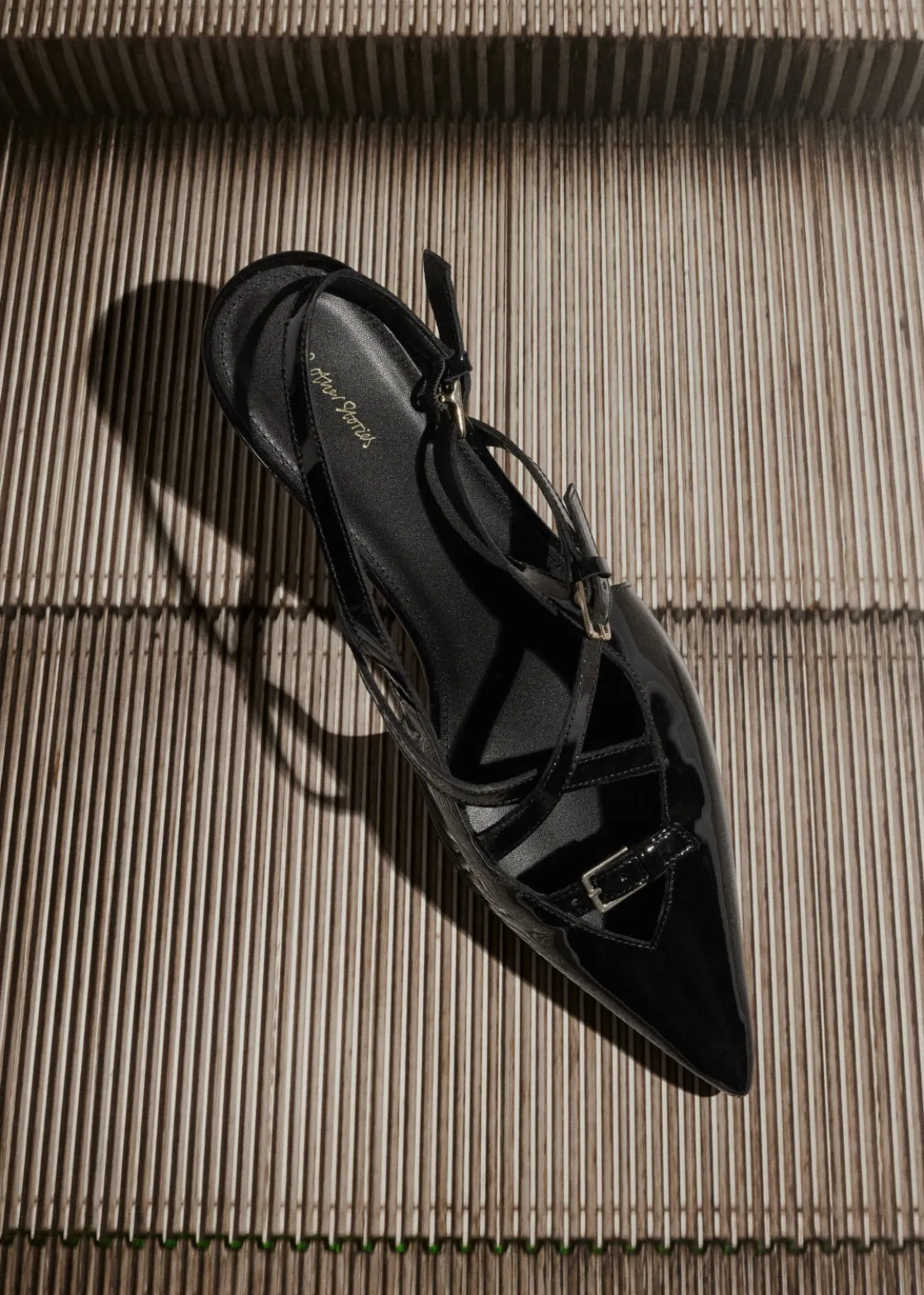 These slingback pumps feature adjustable straps embellished with gold-tone buckles. They’ve been made in Portugal from glossy patent leather and have pointed toes. The 45mm kitten heels add just the right amount of lift.