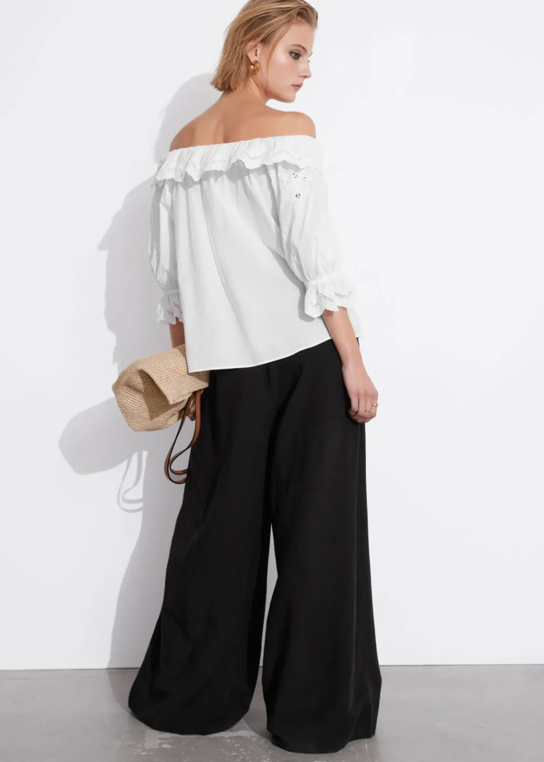 Embroidered blouse designed with a frilled, peter-pan style collar with a scooped neckline and short three-quarter-length scalloped sleeves in a loose-fitting silhouette.