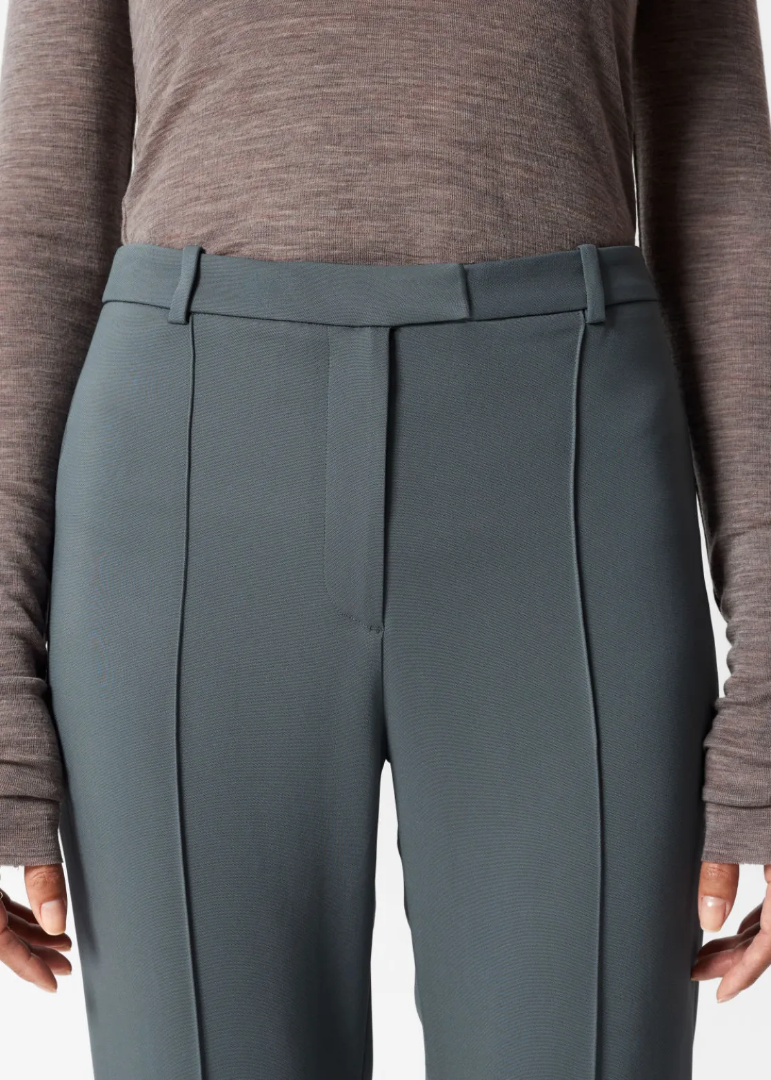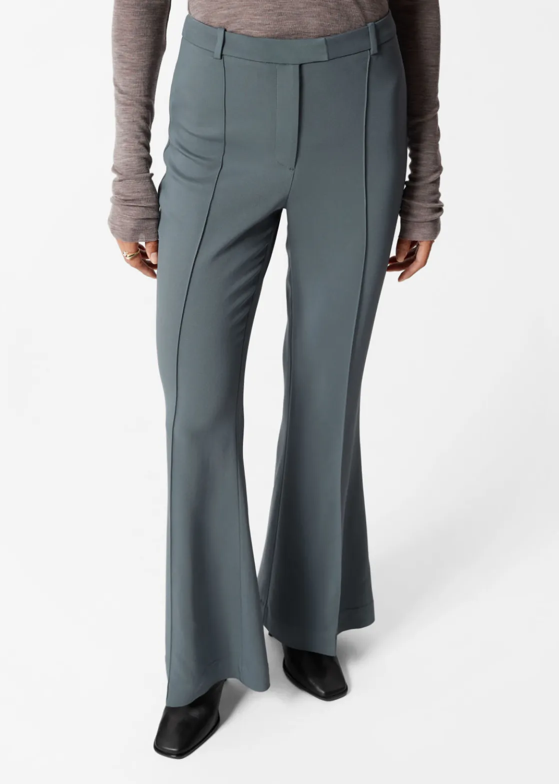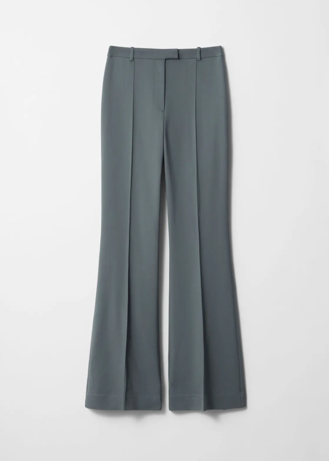 Trousers featuring a flared silhouette. Detailed with vertical pintucks along the legs.
