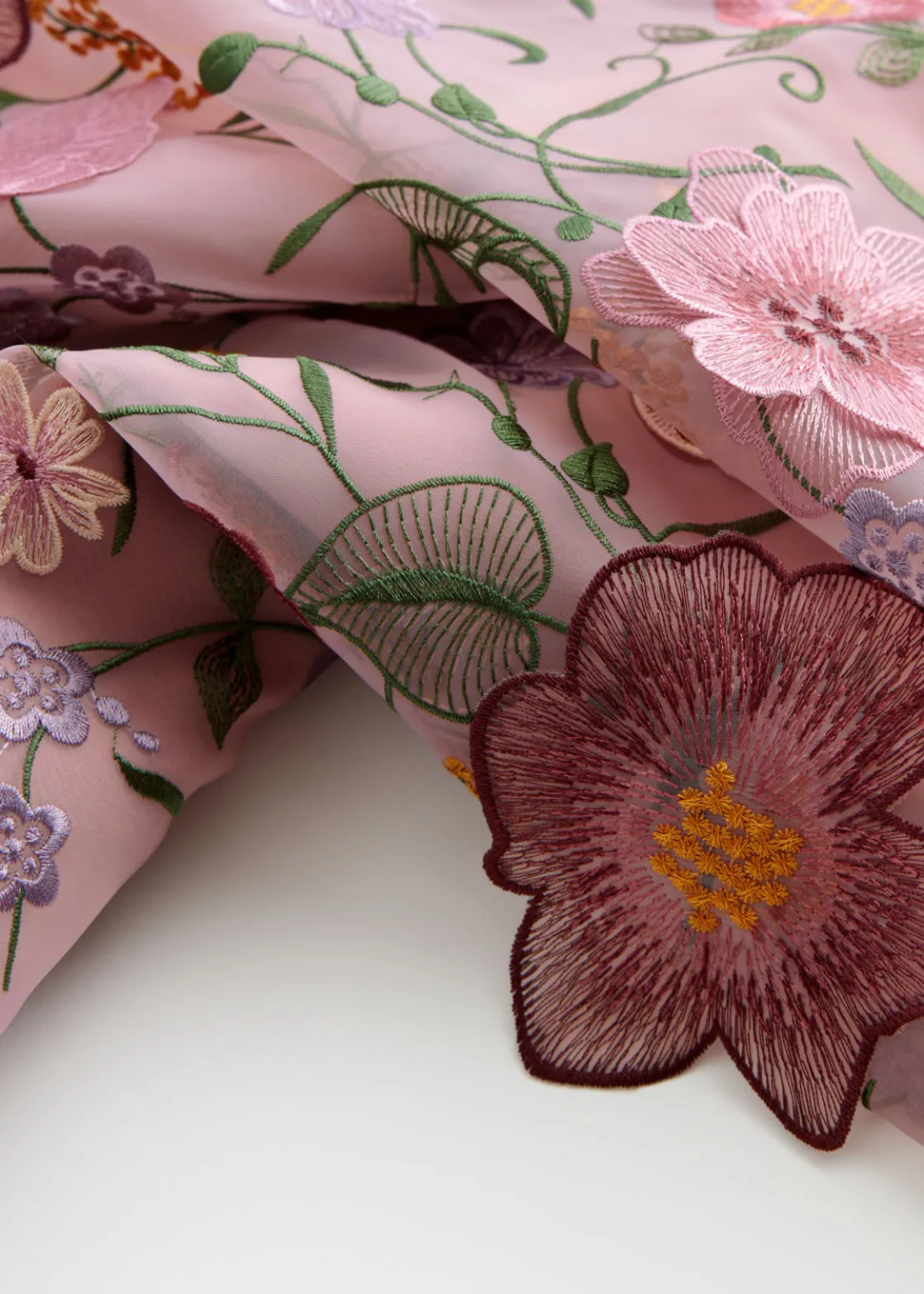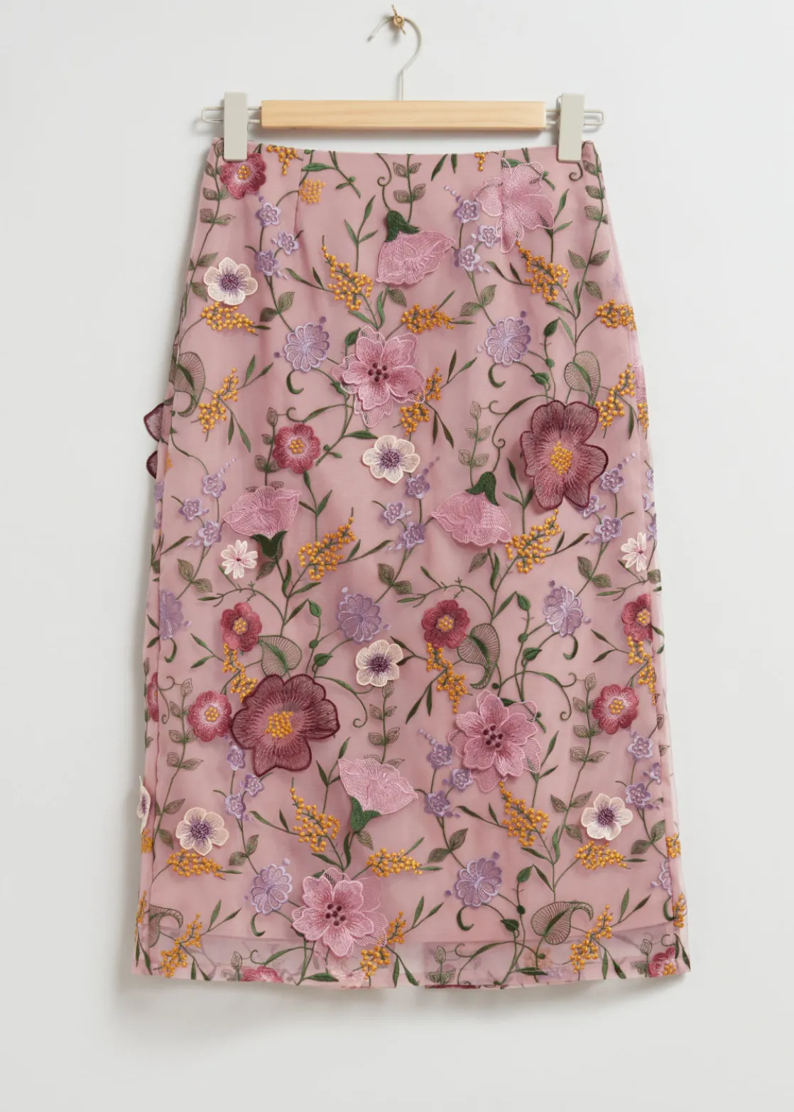Pencil midi skirt featuring a sheer organza layer adorned with intricate floral embroidery.