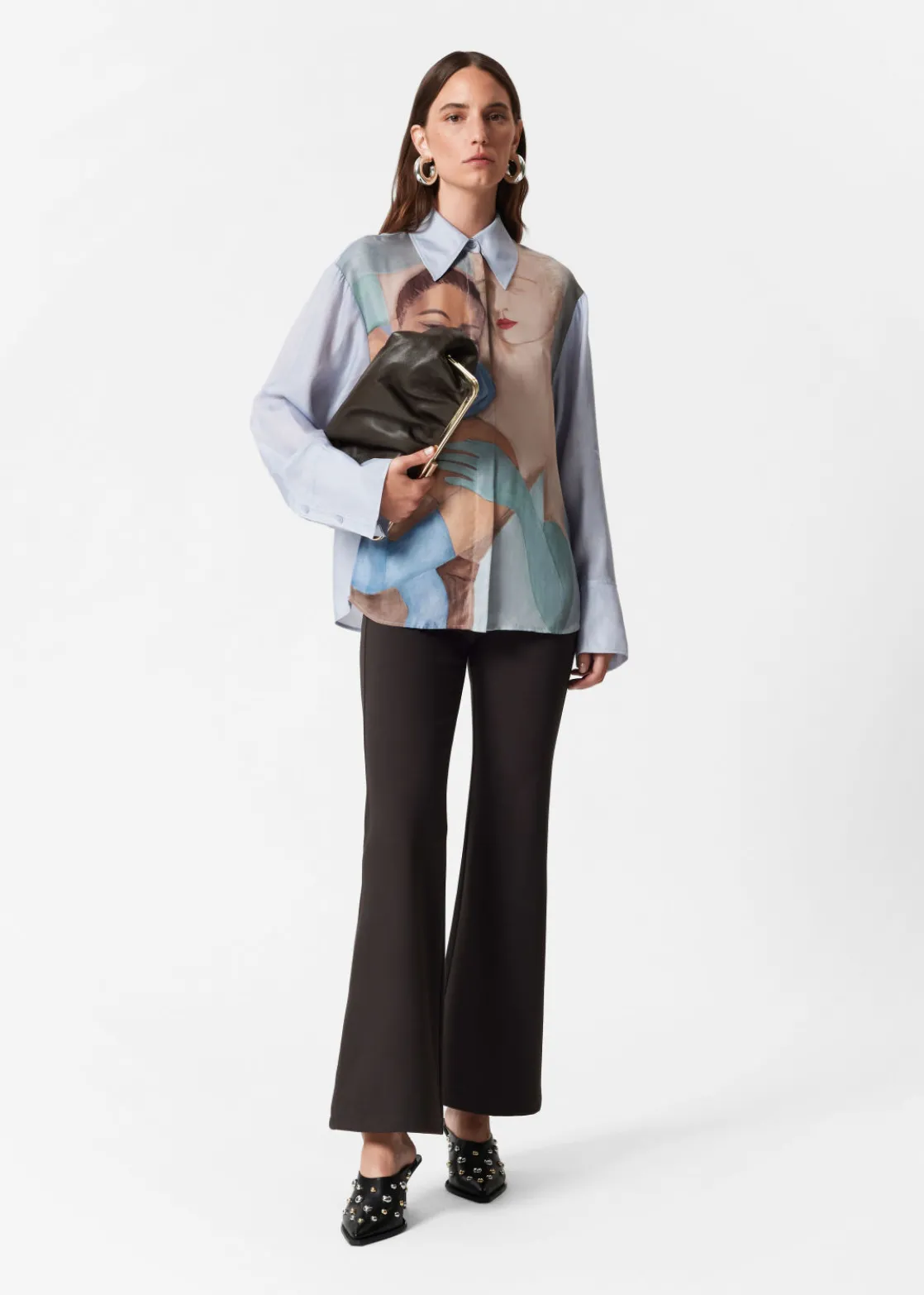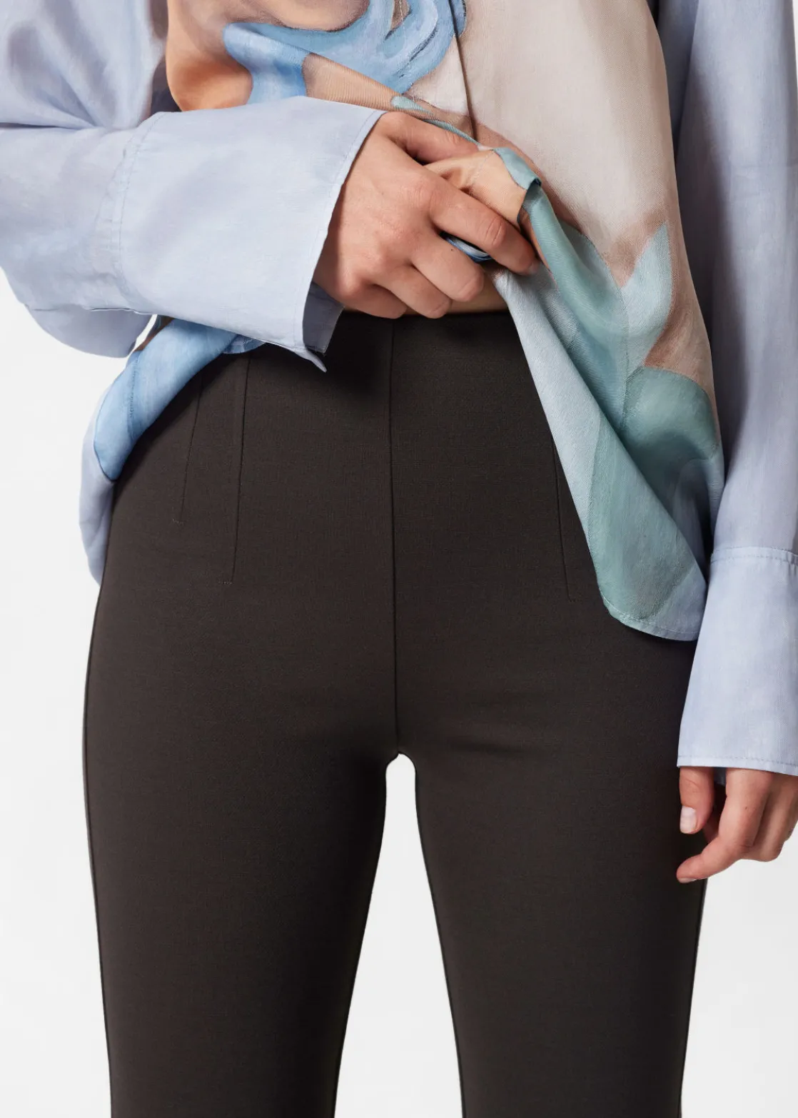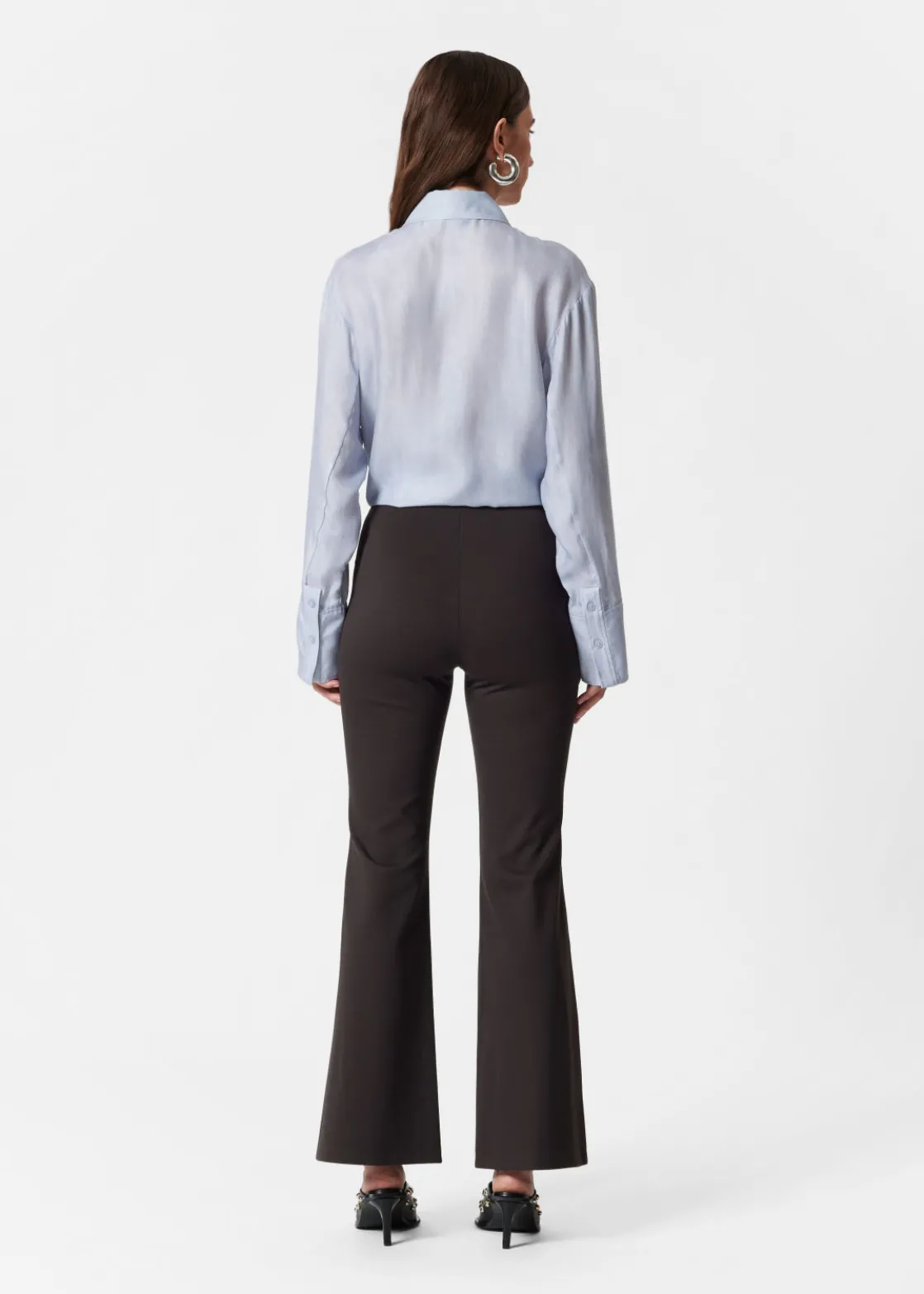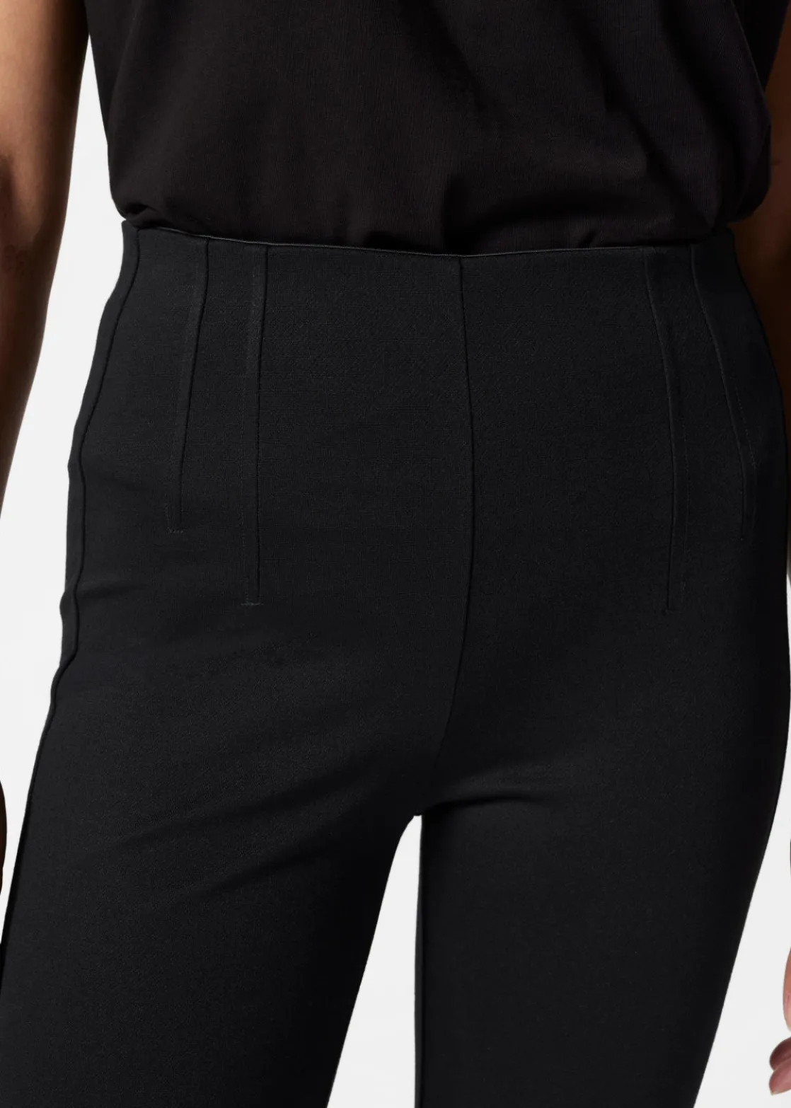 Trousers with a kick-flare leg. Finished with a high, elasticated waistline.