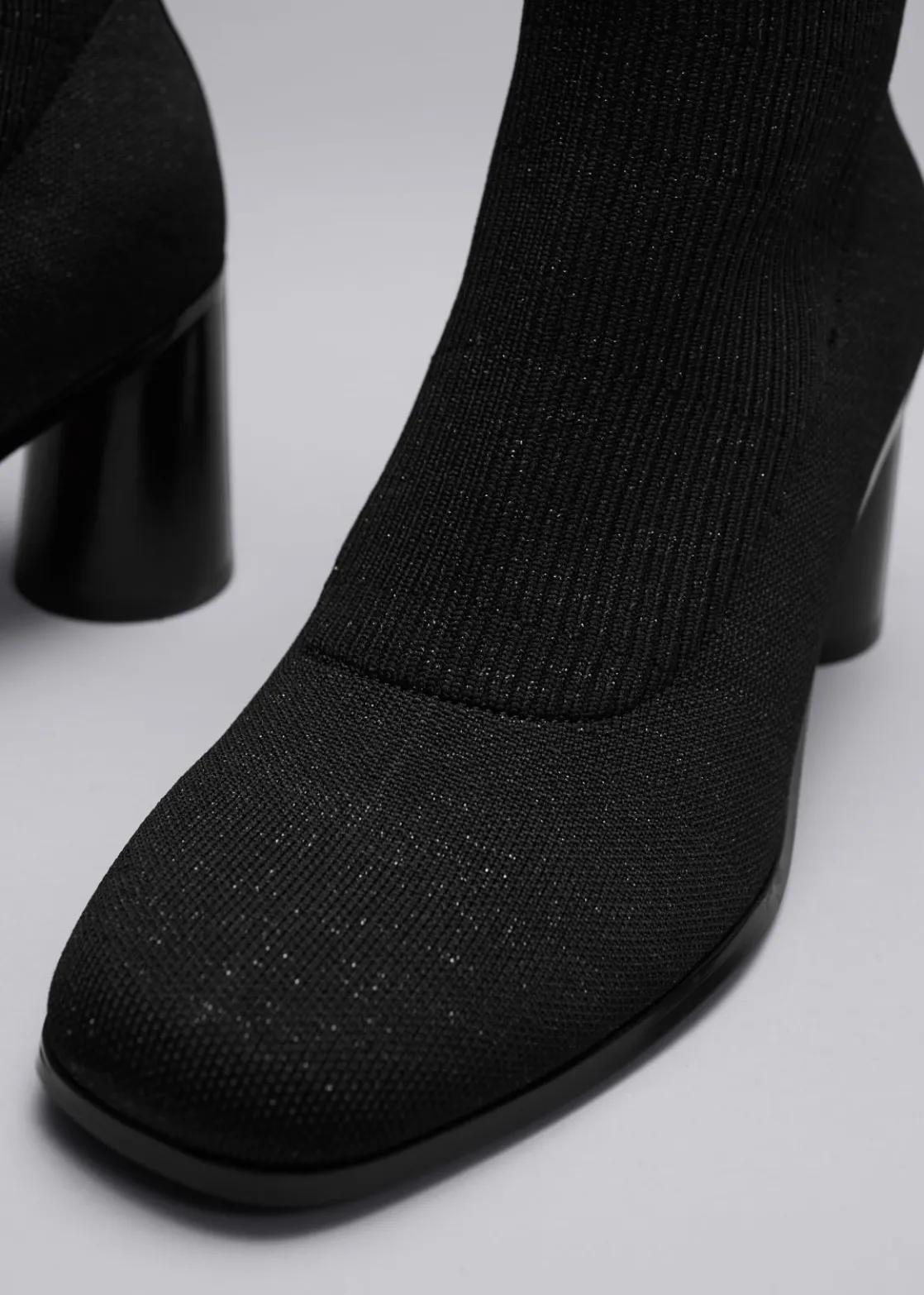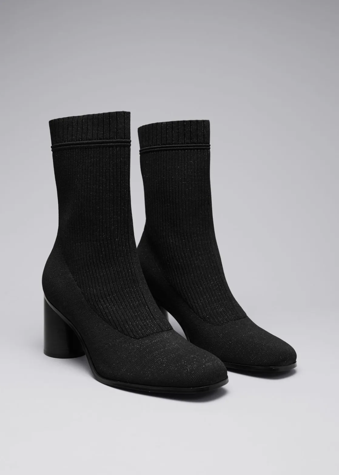 Boots made from stretch-knit for a comfortable, sleek sock-like fit. Designed with round heels and almond toes. Finished with ribbed cuffs.