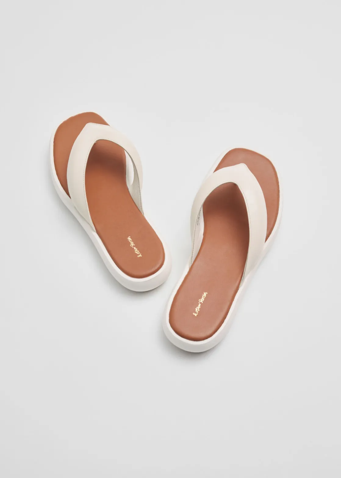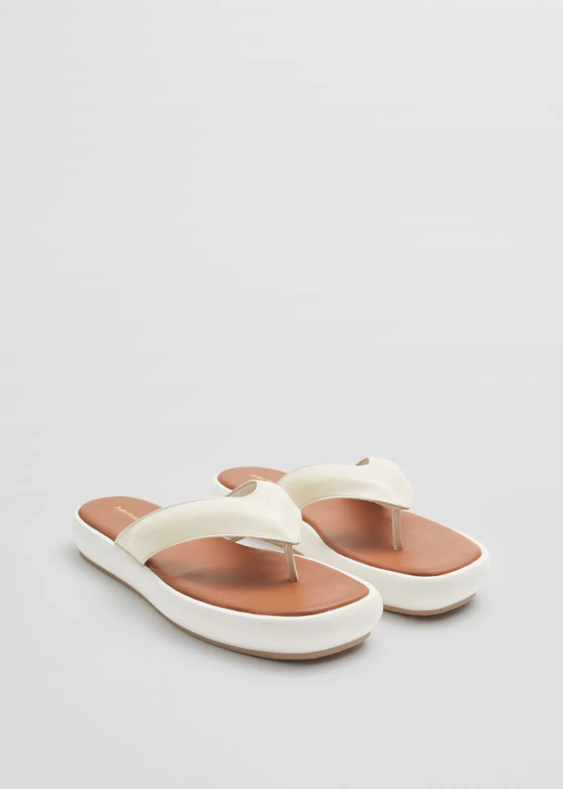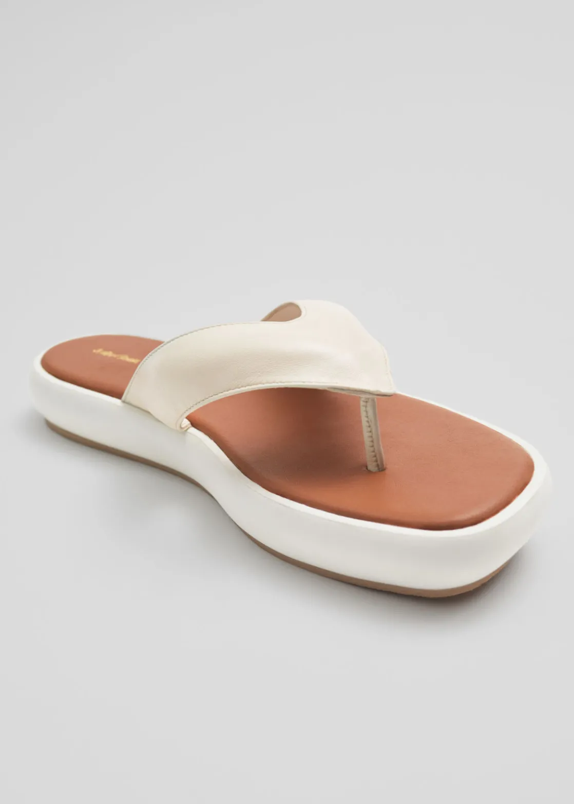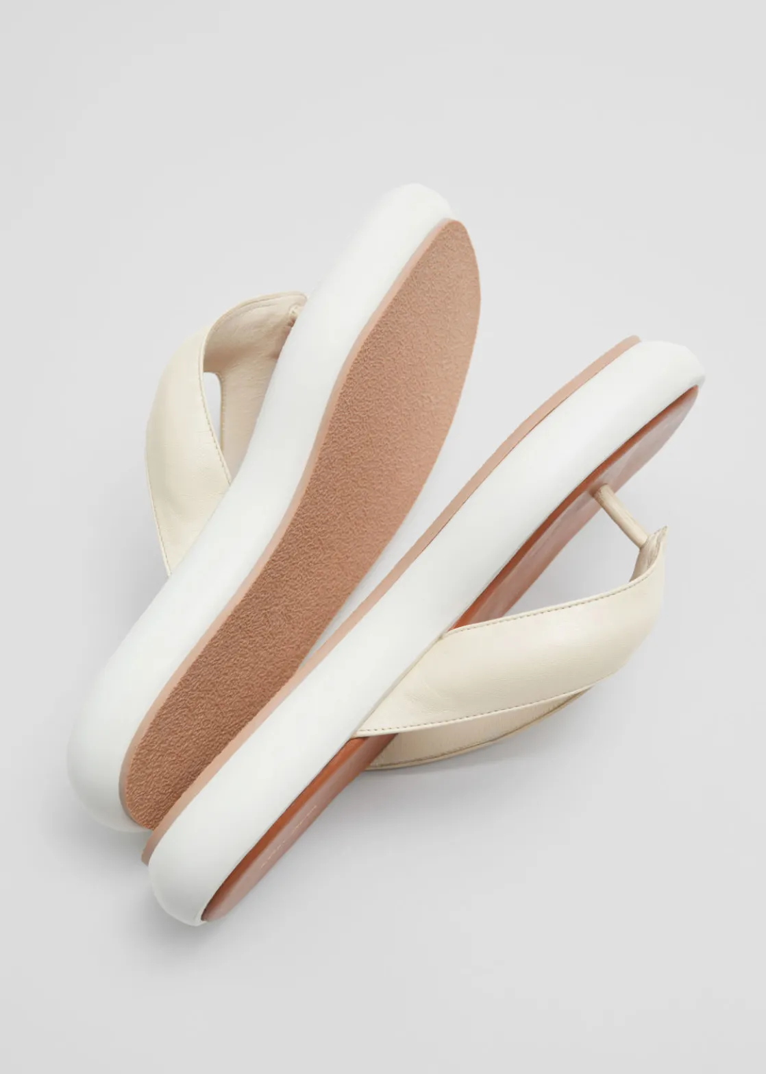 Platform flip flops crafted from smooth leather featuring cushioned footbeds and padded straps providing all-day comfort.