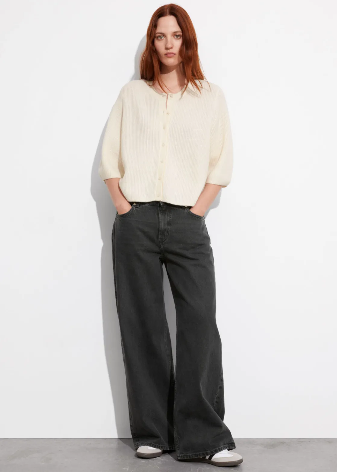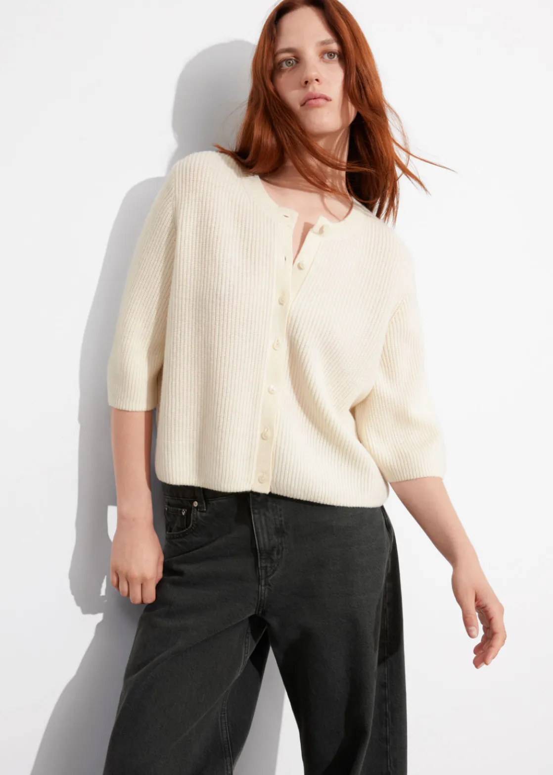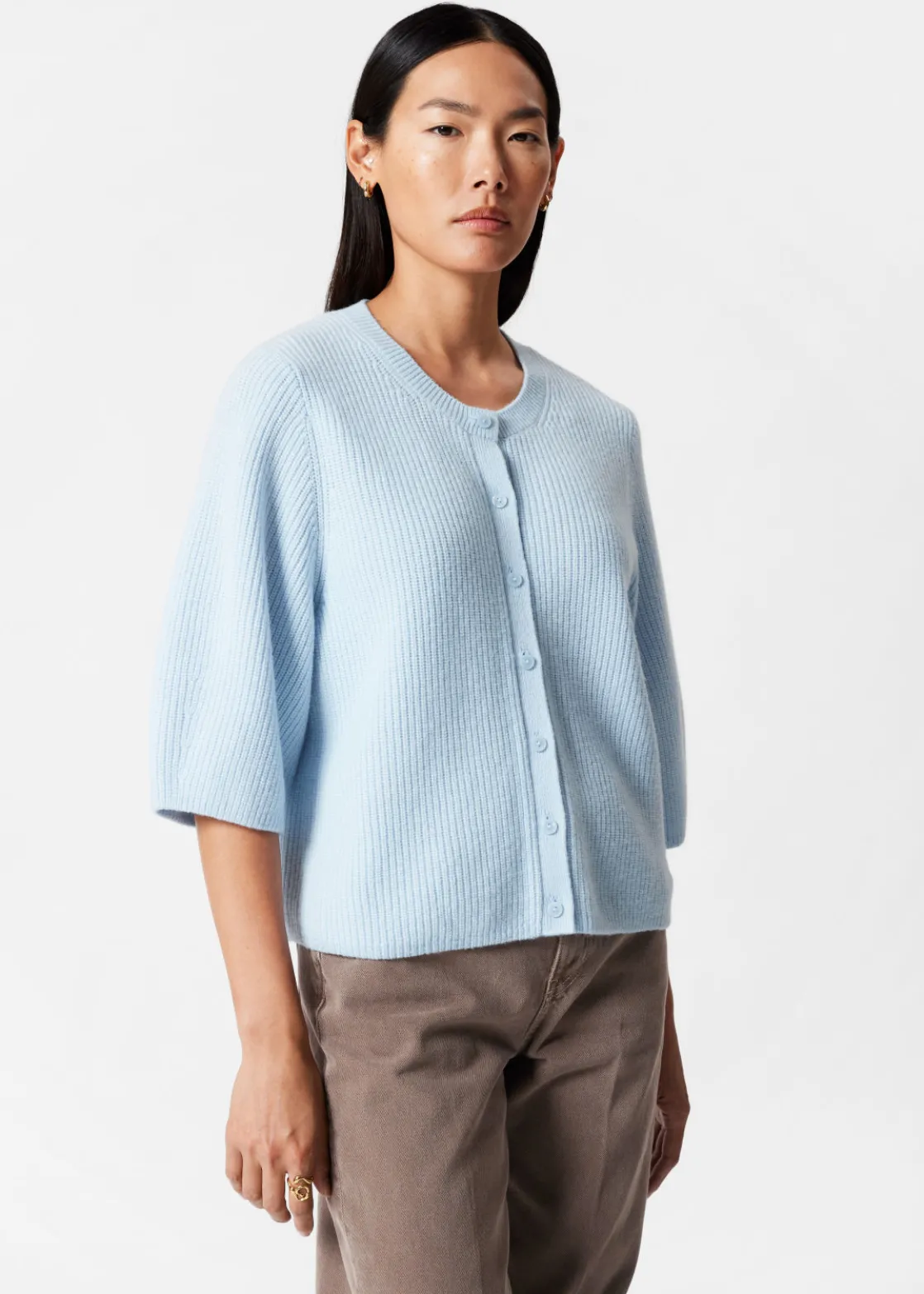 Ribbed cardigan knitted from merino wool featuring three-quarter sleeves.