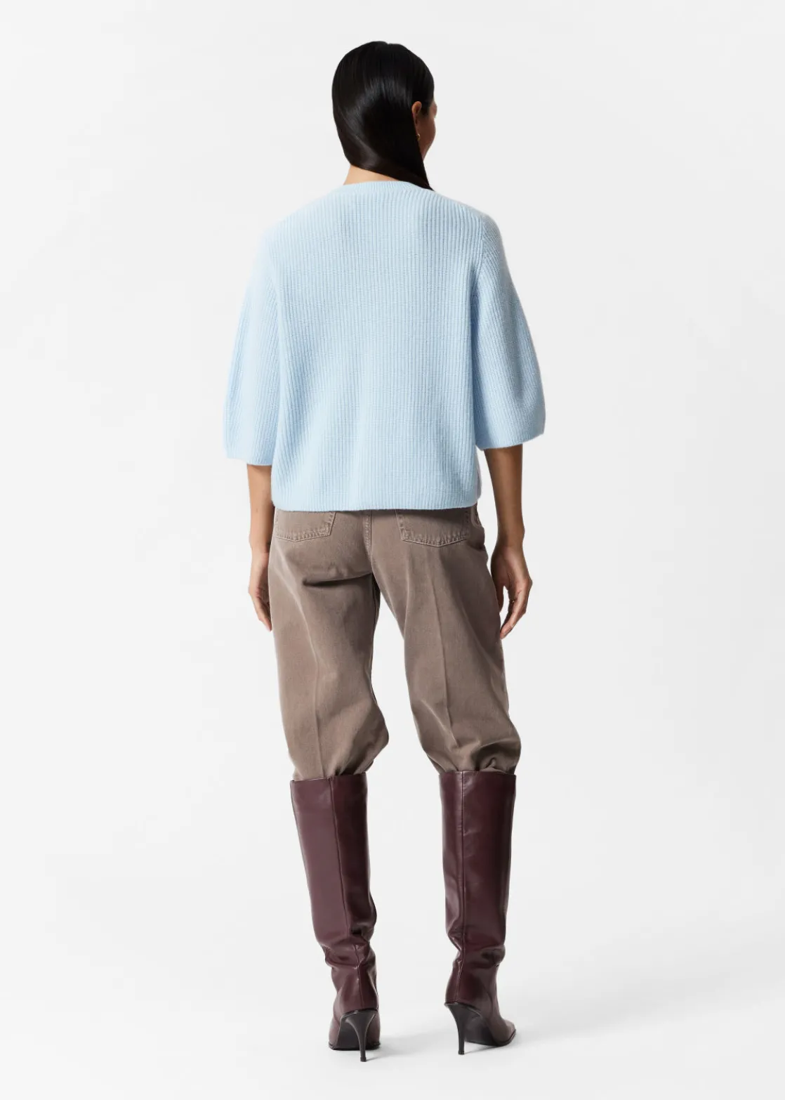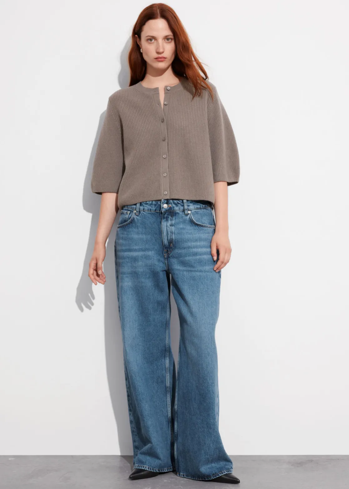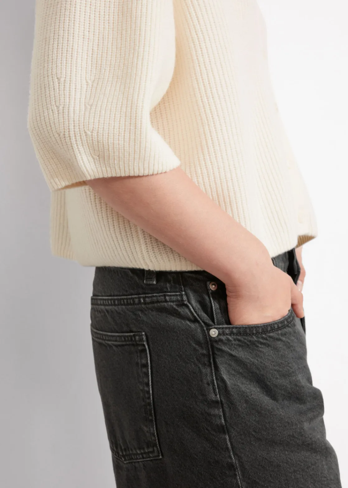 Ribbed cardigan knitted from merino wool featuring three-quarter sleeves.