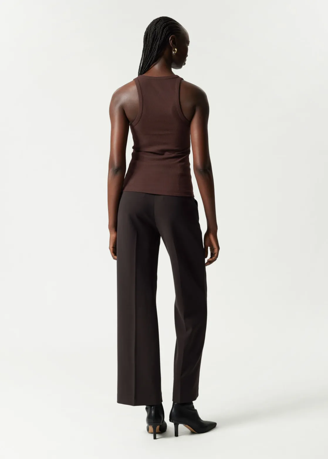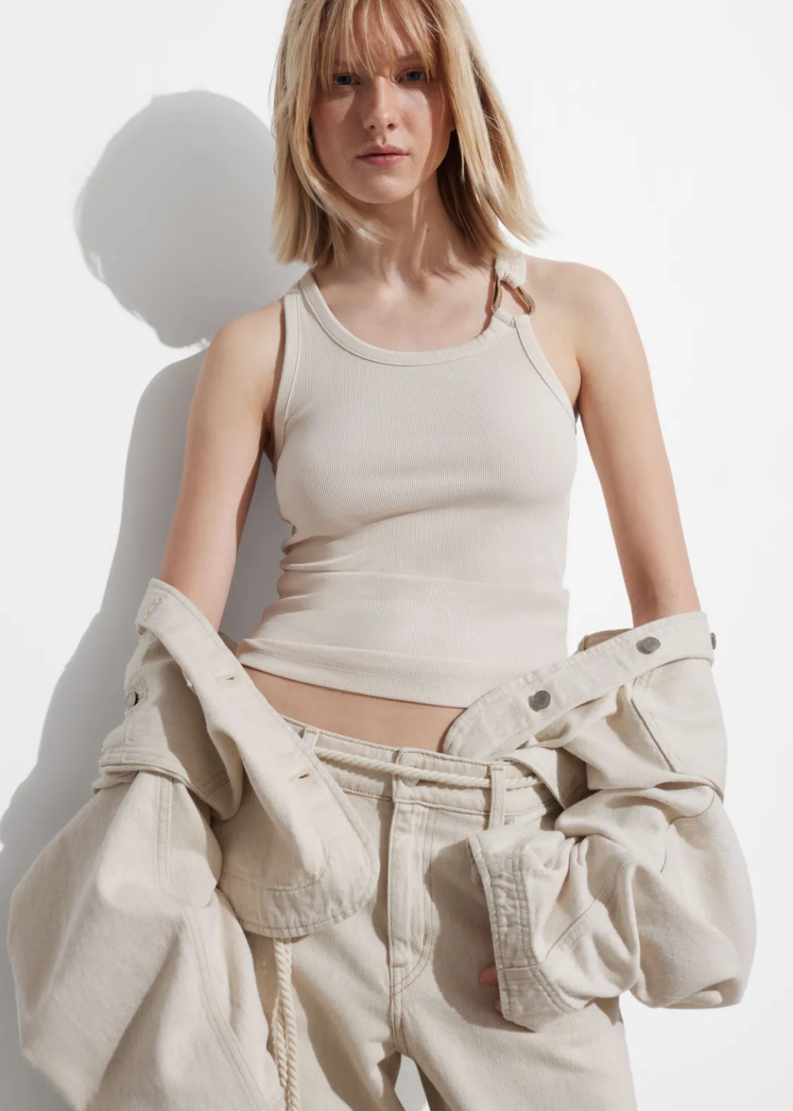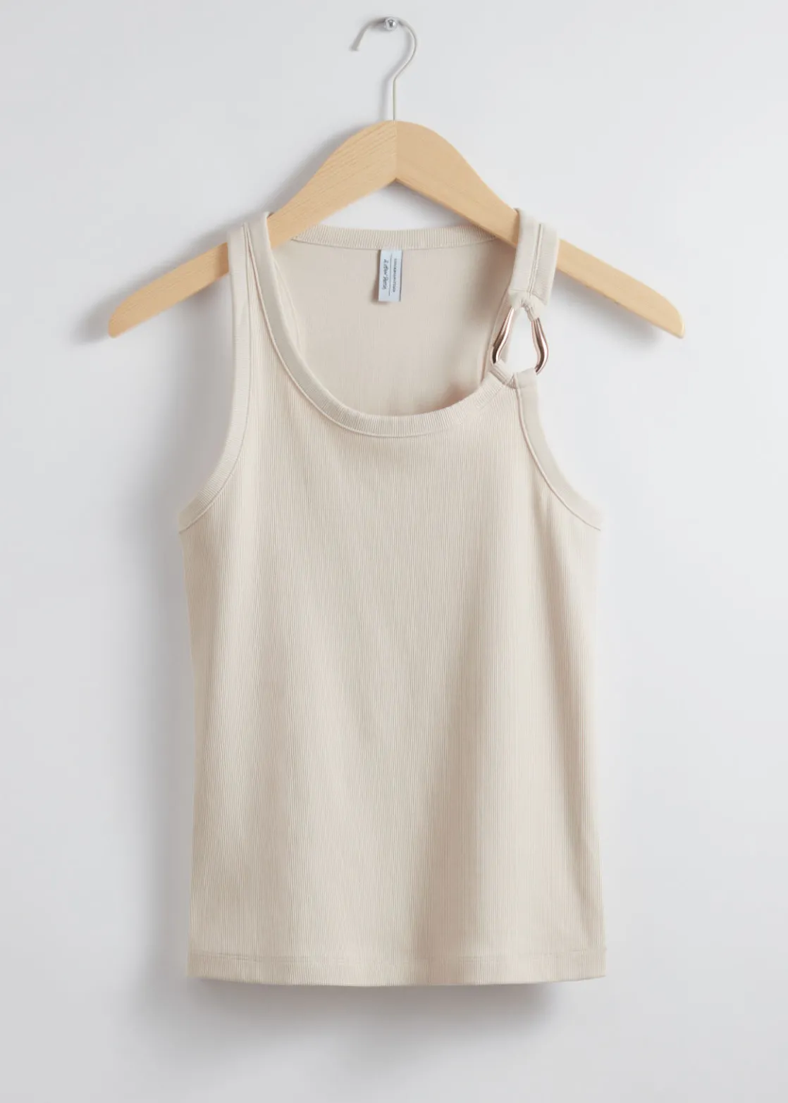 Tank top defined by a gold-toned metal buckle at the shoulder.