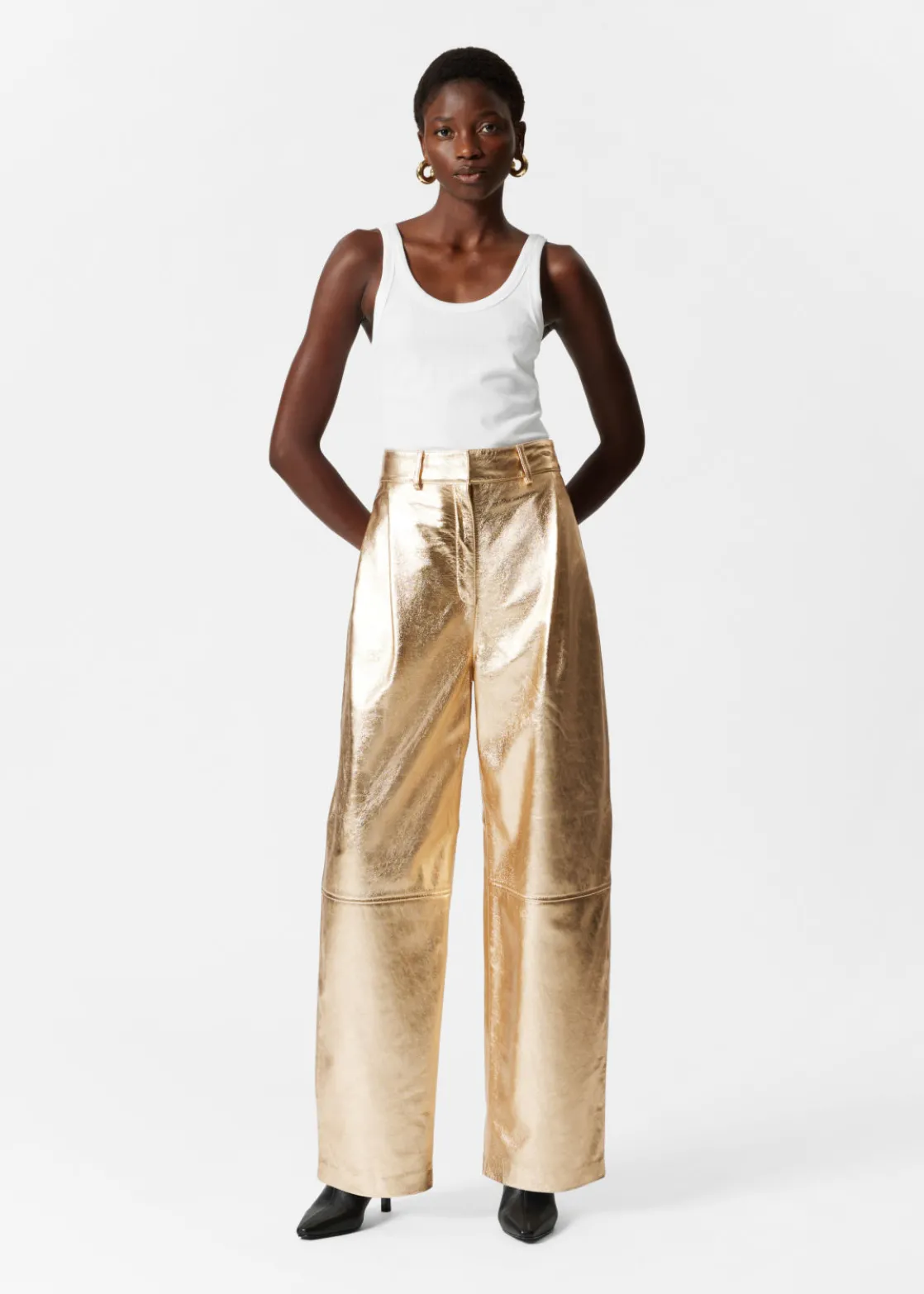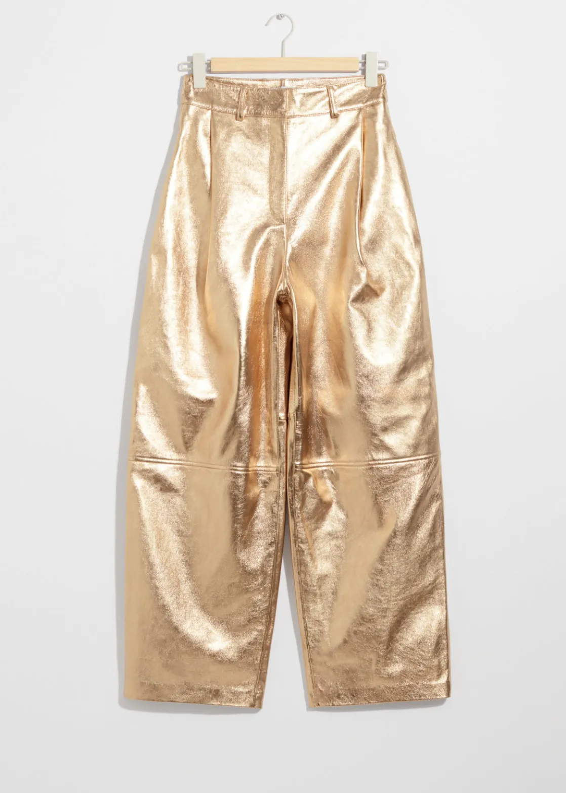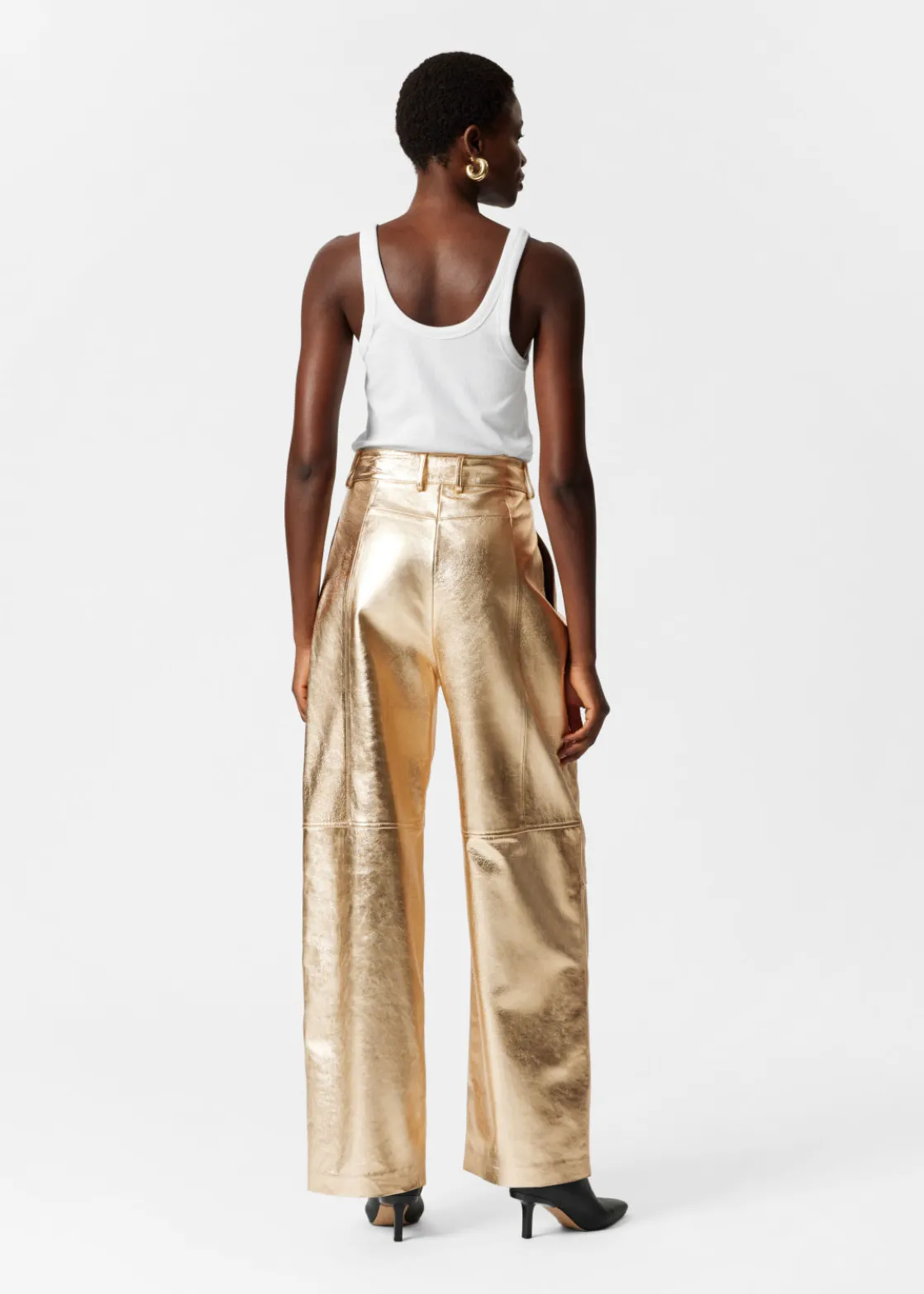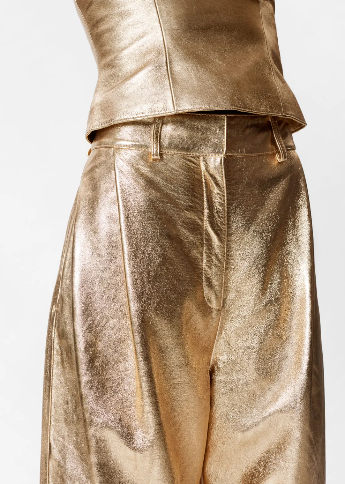 Tapered leather trousers with a metallic finish. Finished with duo side seam pockets.