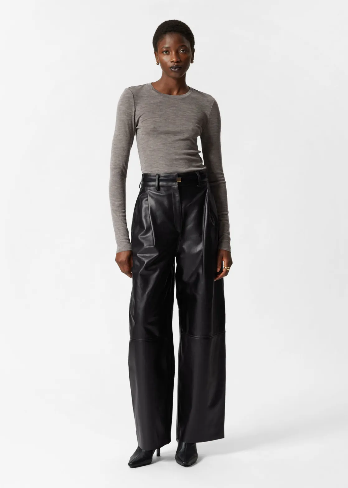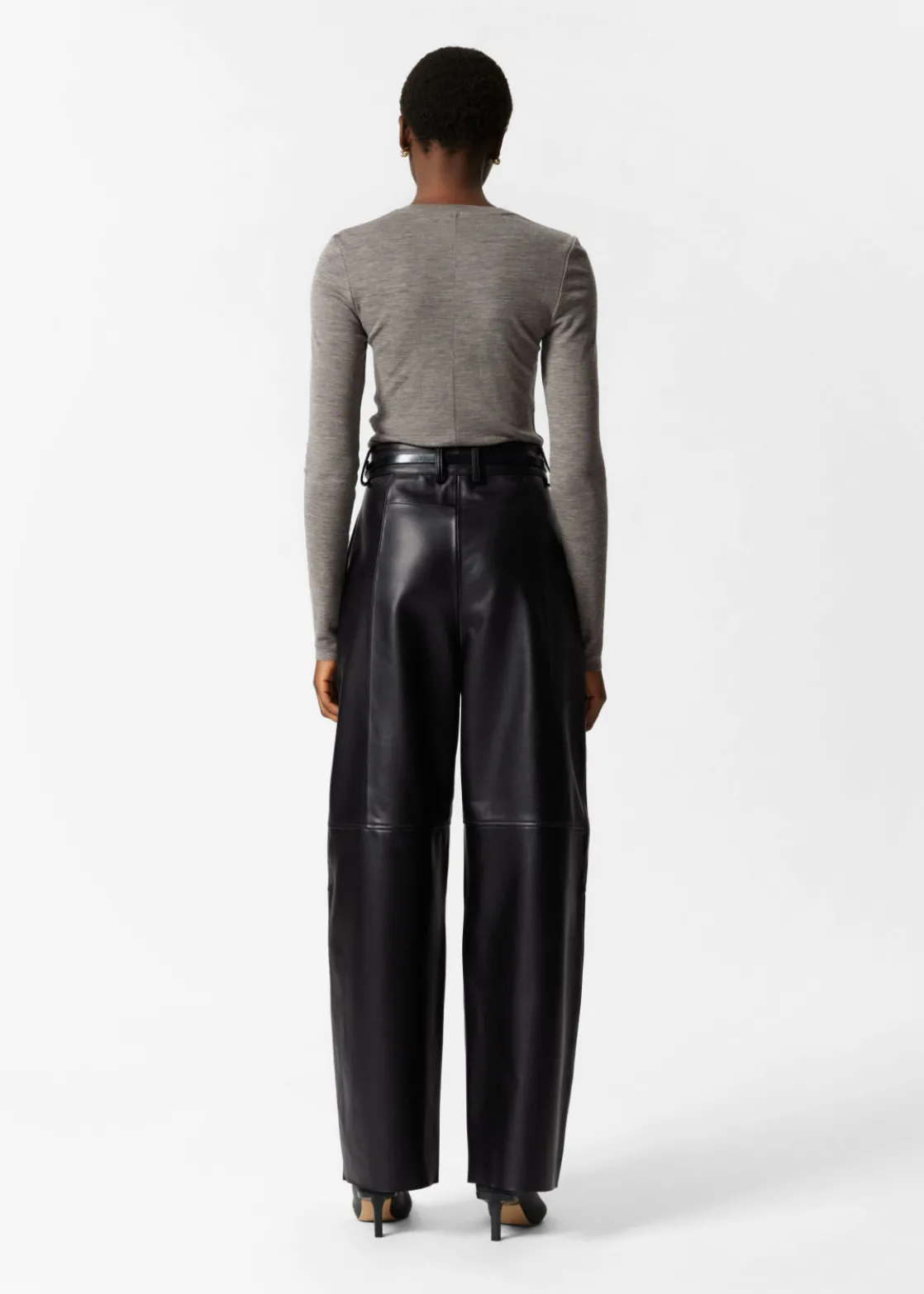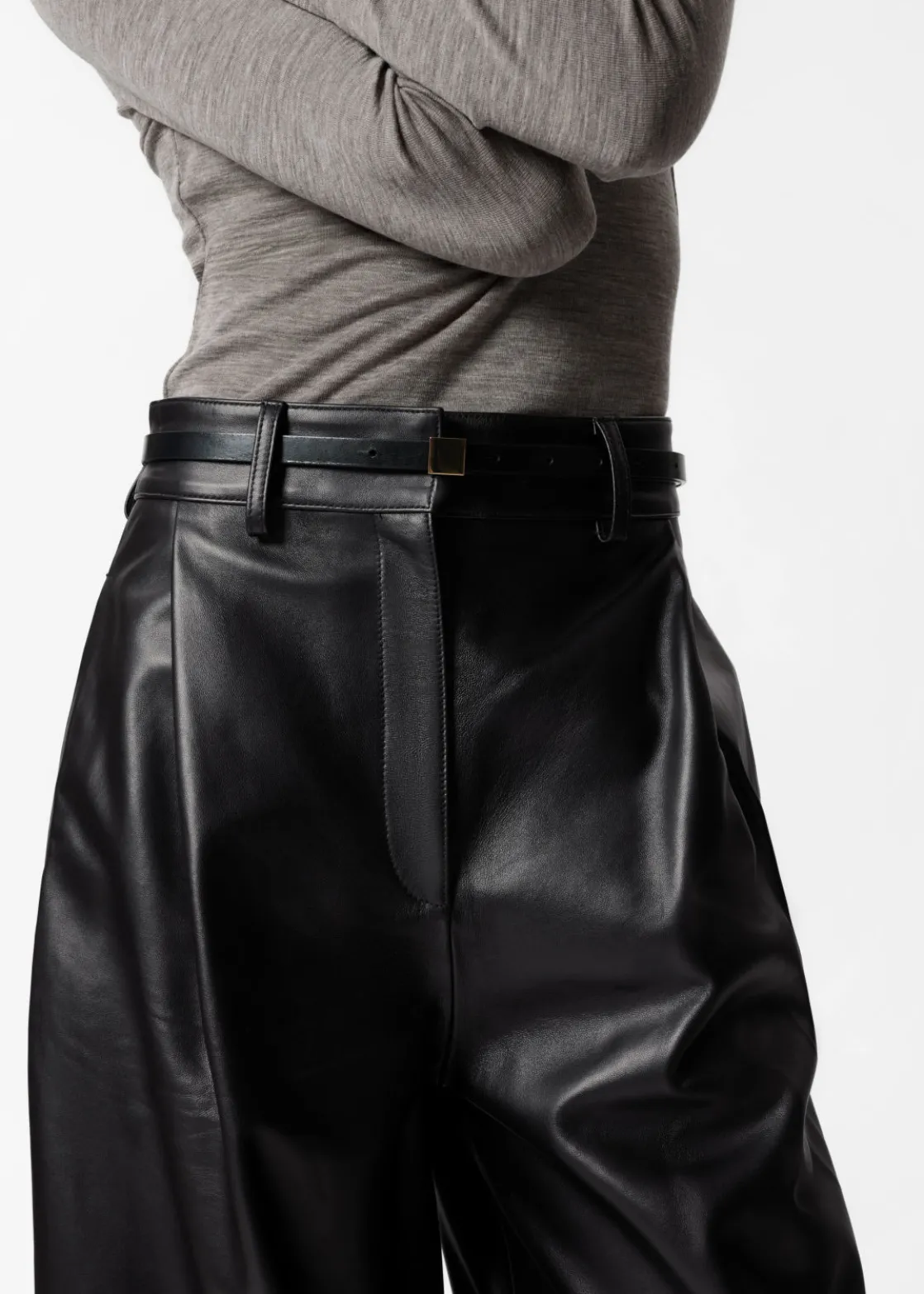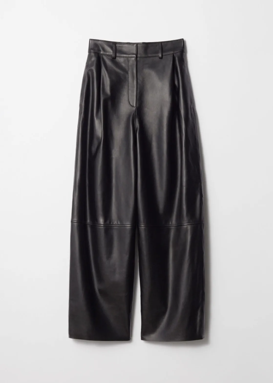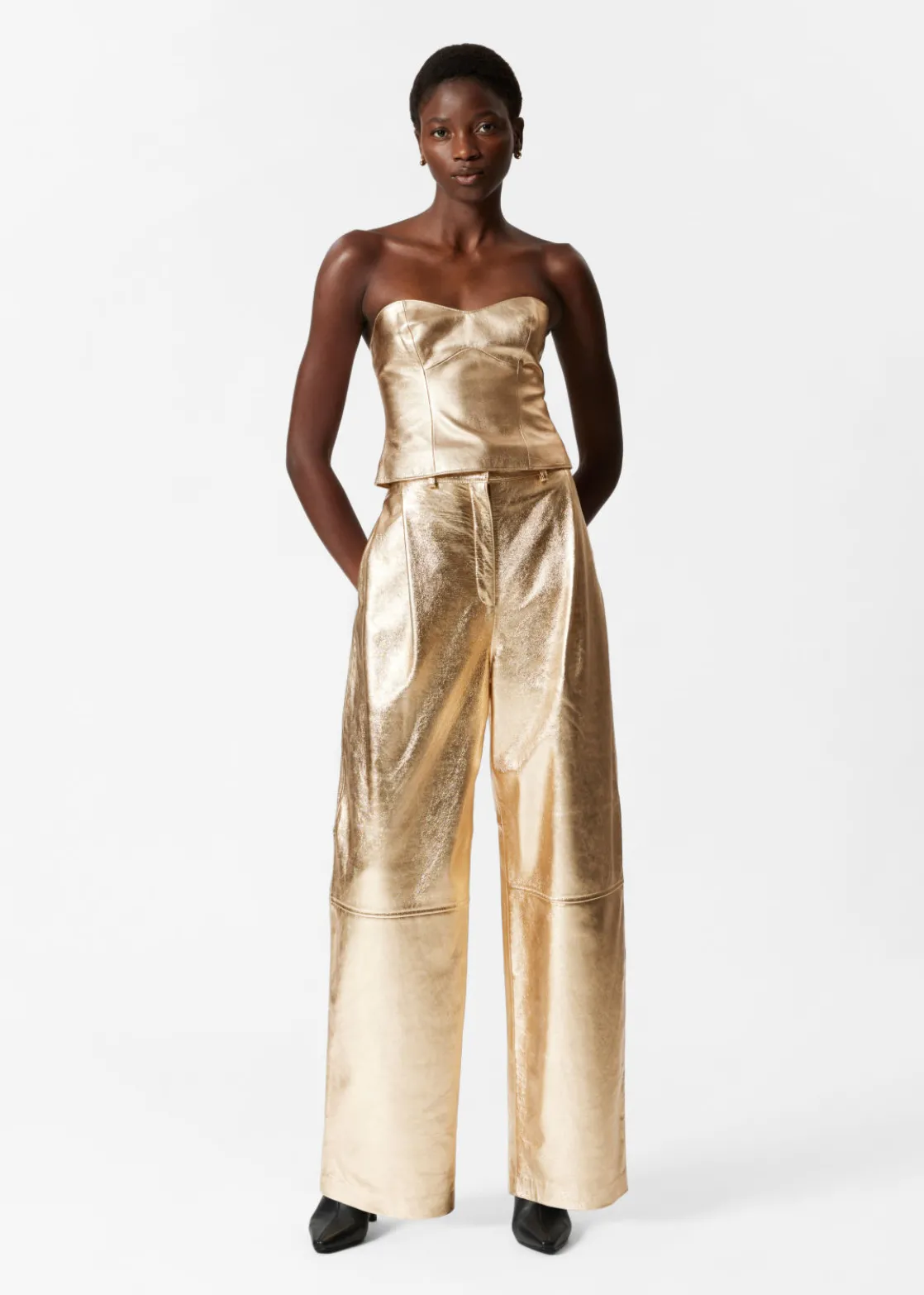 Tapered leather trousers with a metallic finish. Finished with duo side seam pockets.