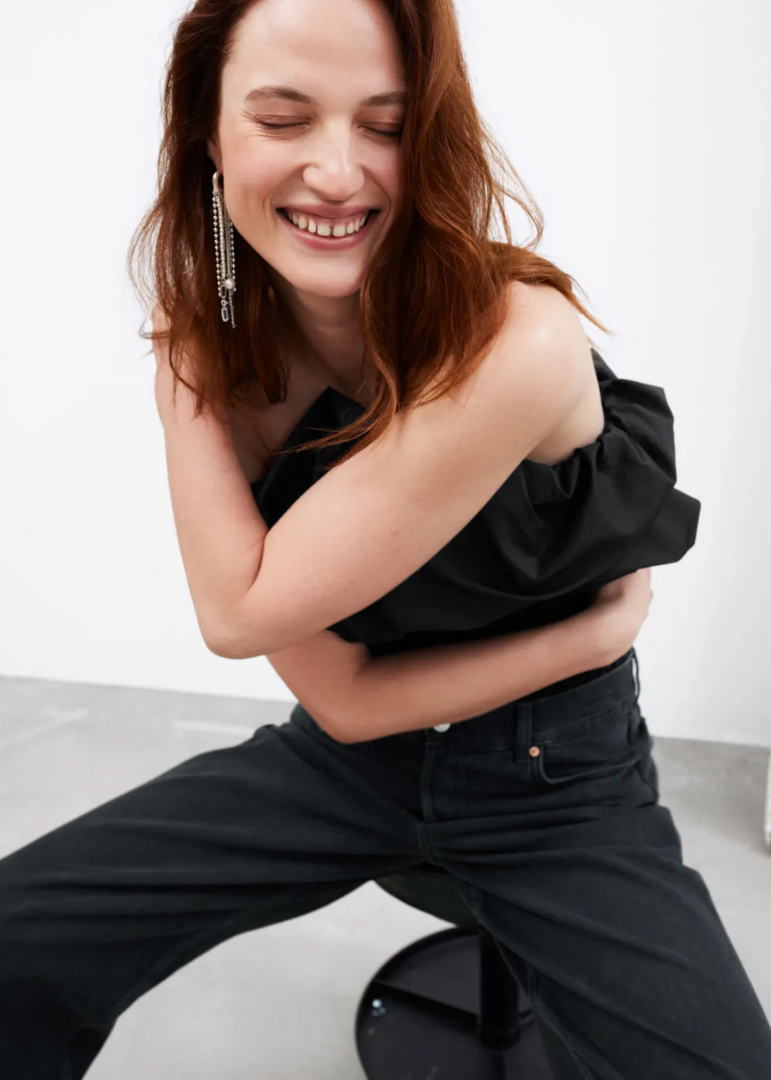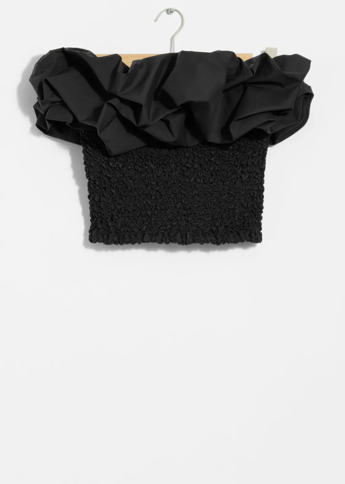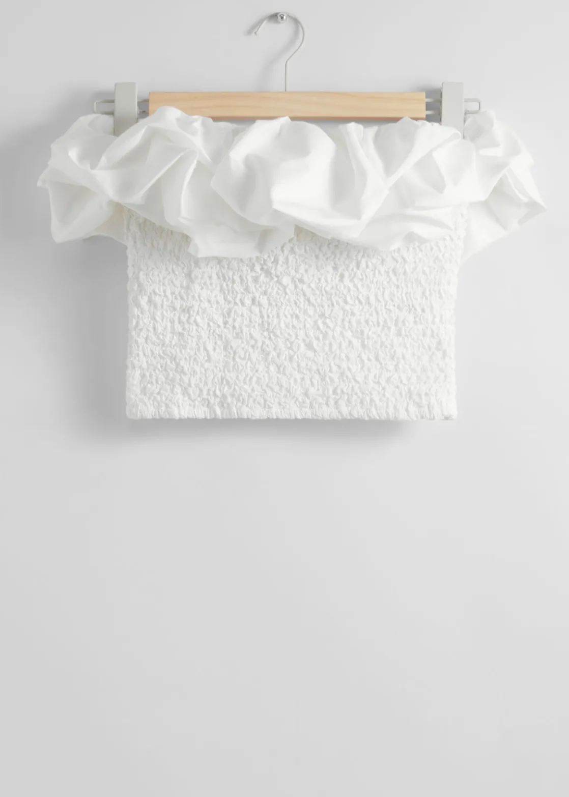 Off-shoulder top featuring a bubble neckline and a smocked finish. Fastened with a zipper at the back.