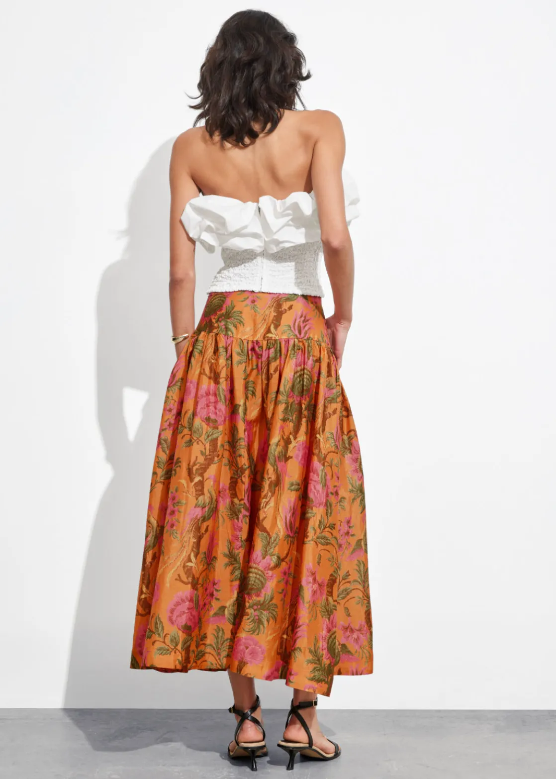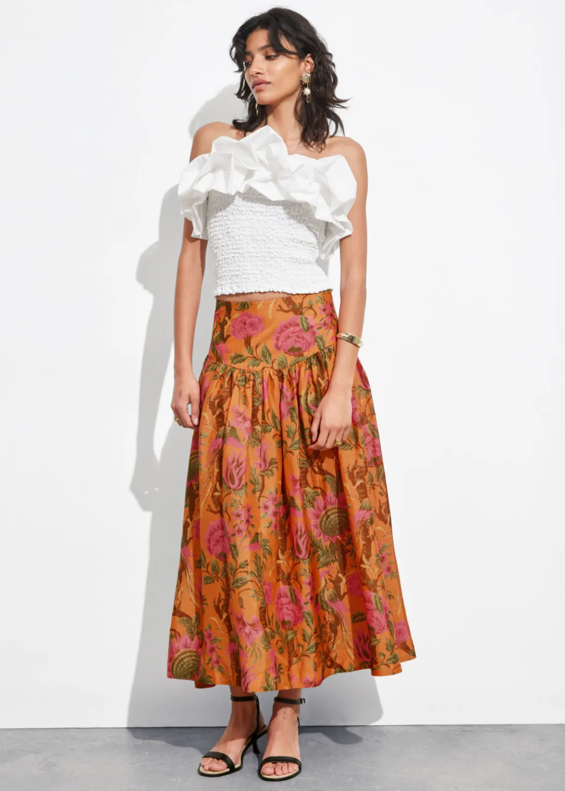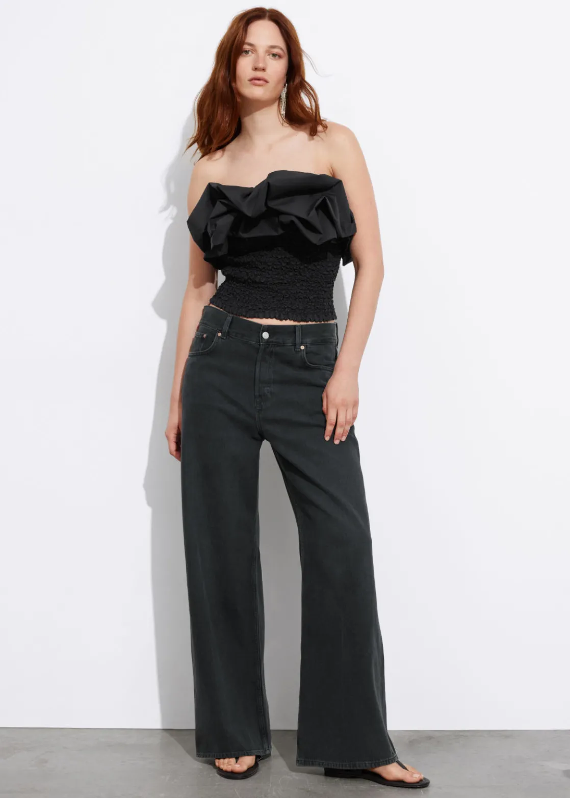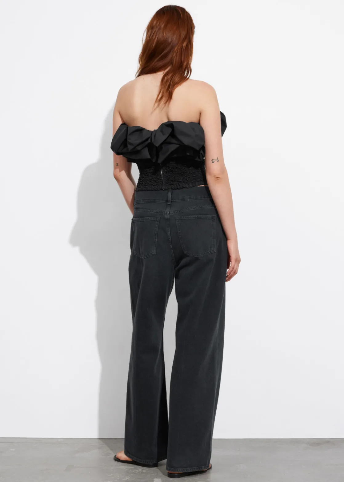 Off-shoulder top featuring a bubble neckline and a smocked finish. Fastened with a zipper at the back.