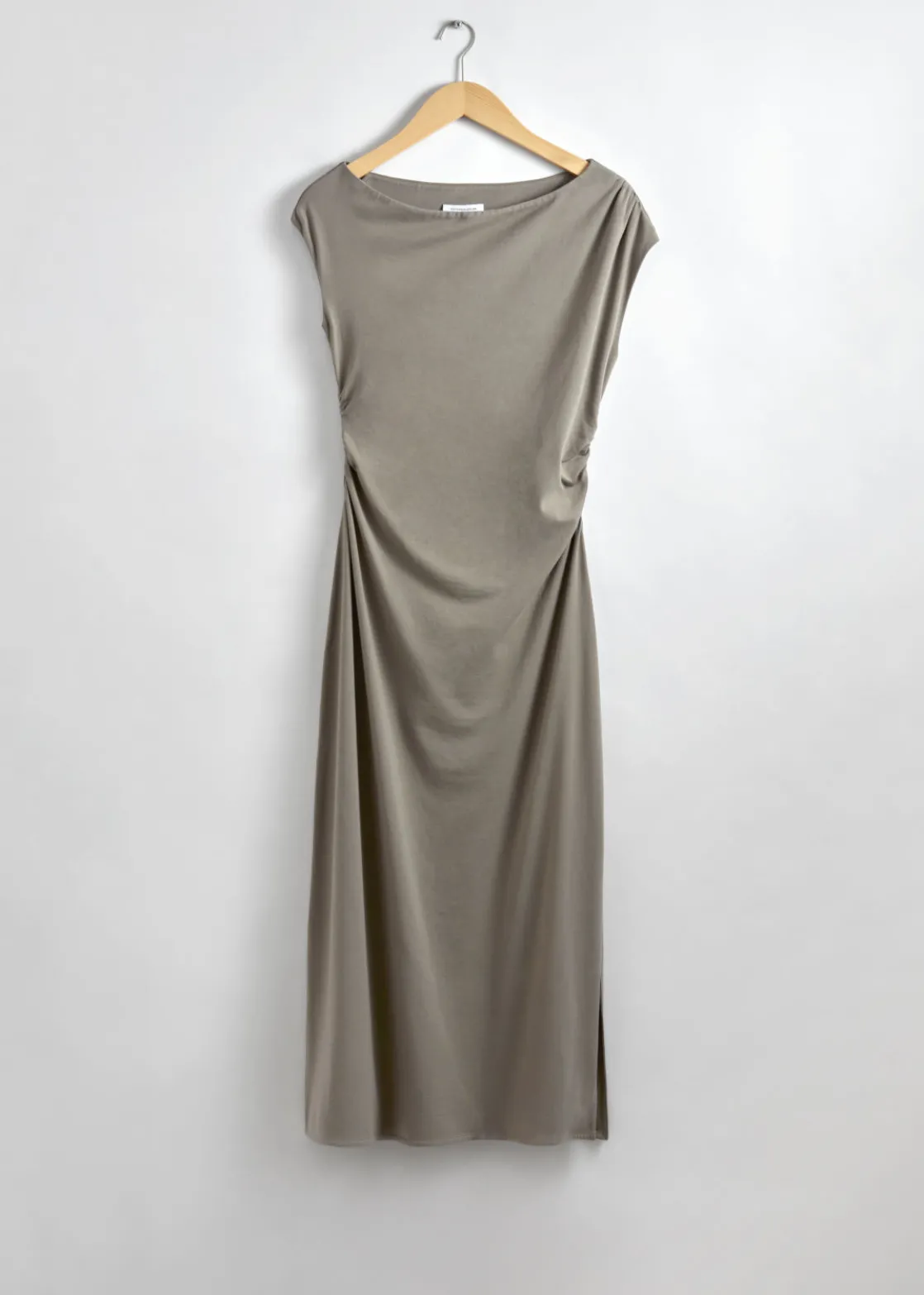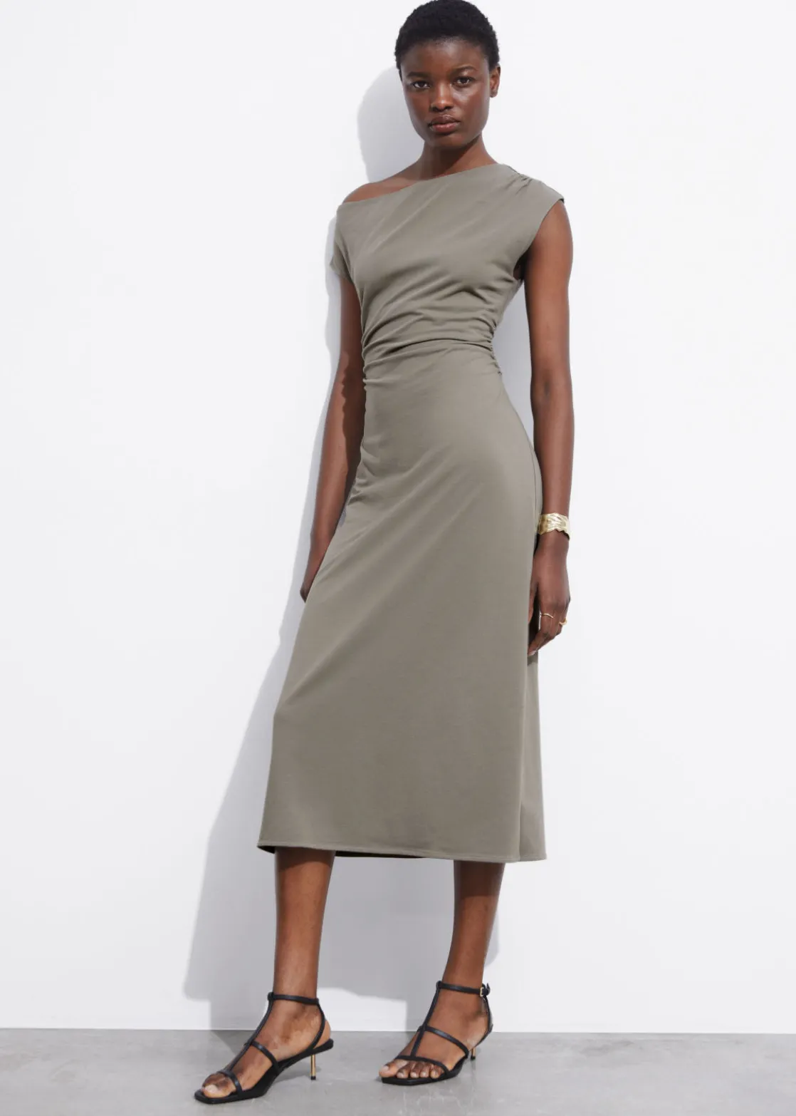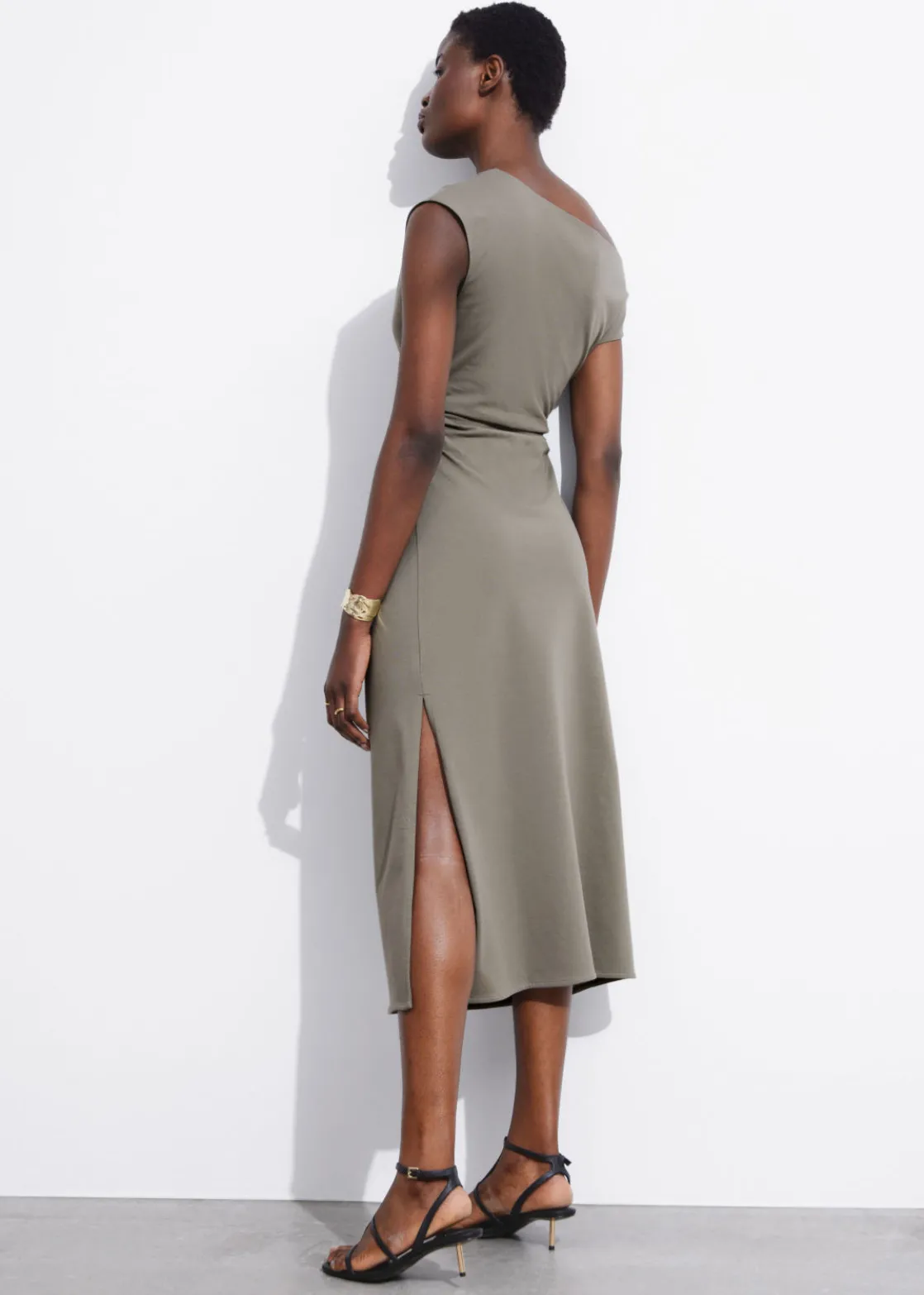Slim midi dress featuring a one-shoulder finish and gathered detailing at the waist.