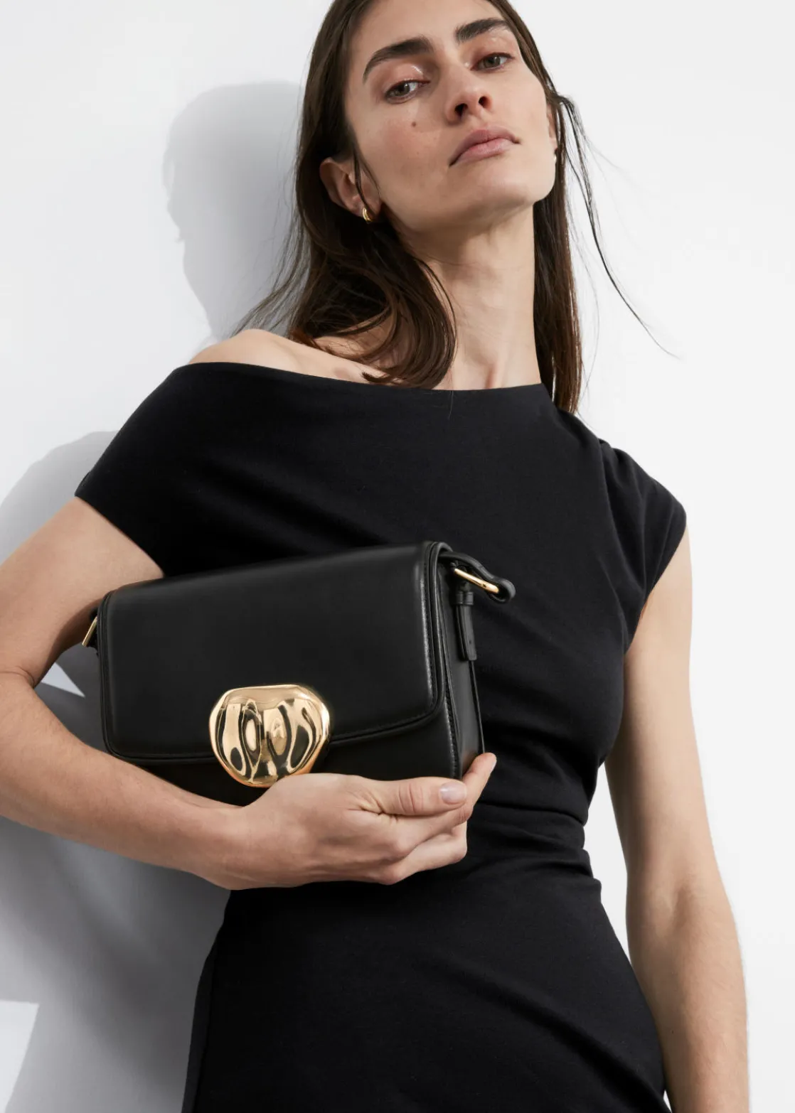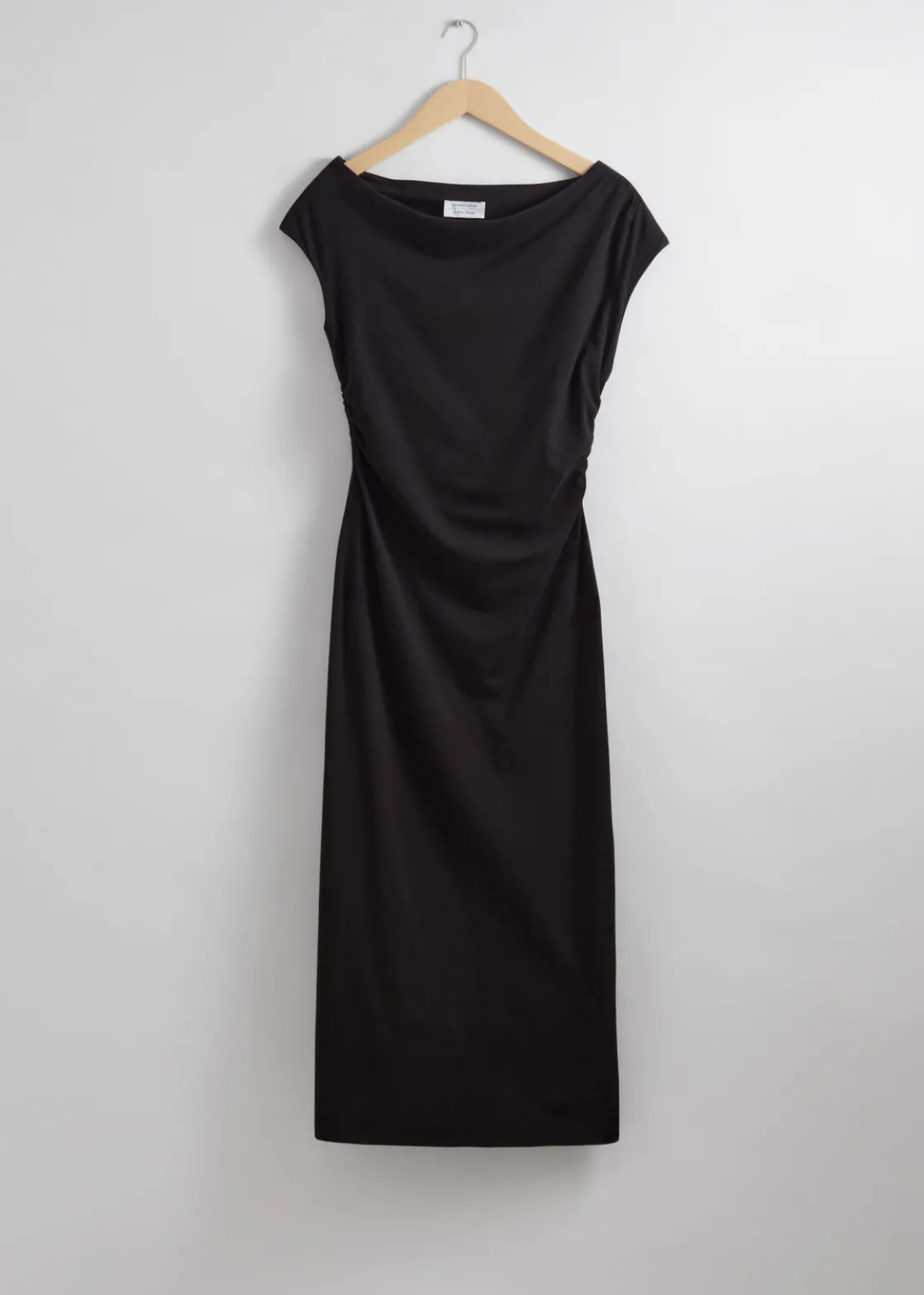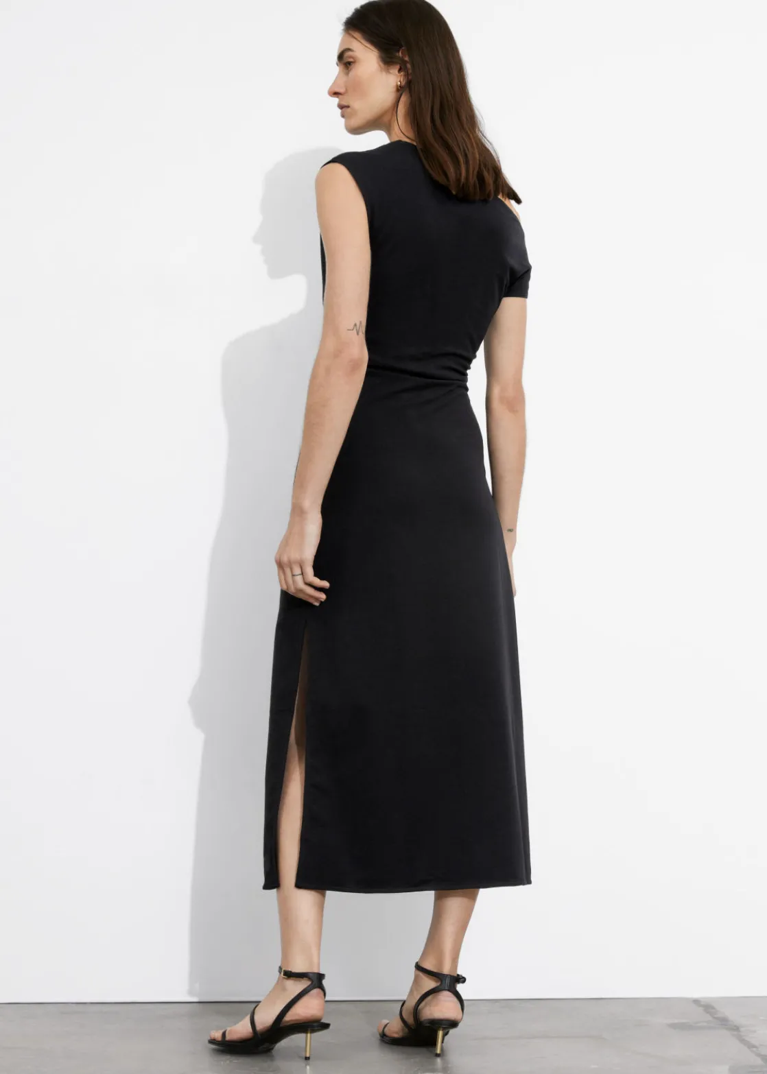 Slim midi dress featuring a one-shoulder finish and gathered detailing at the waist.