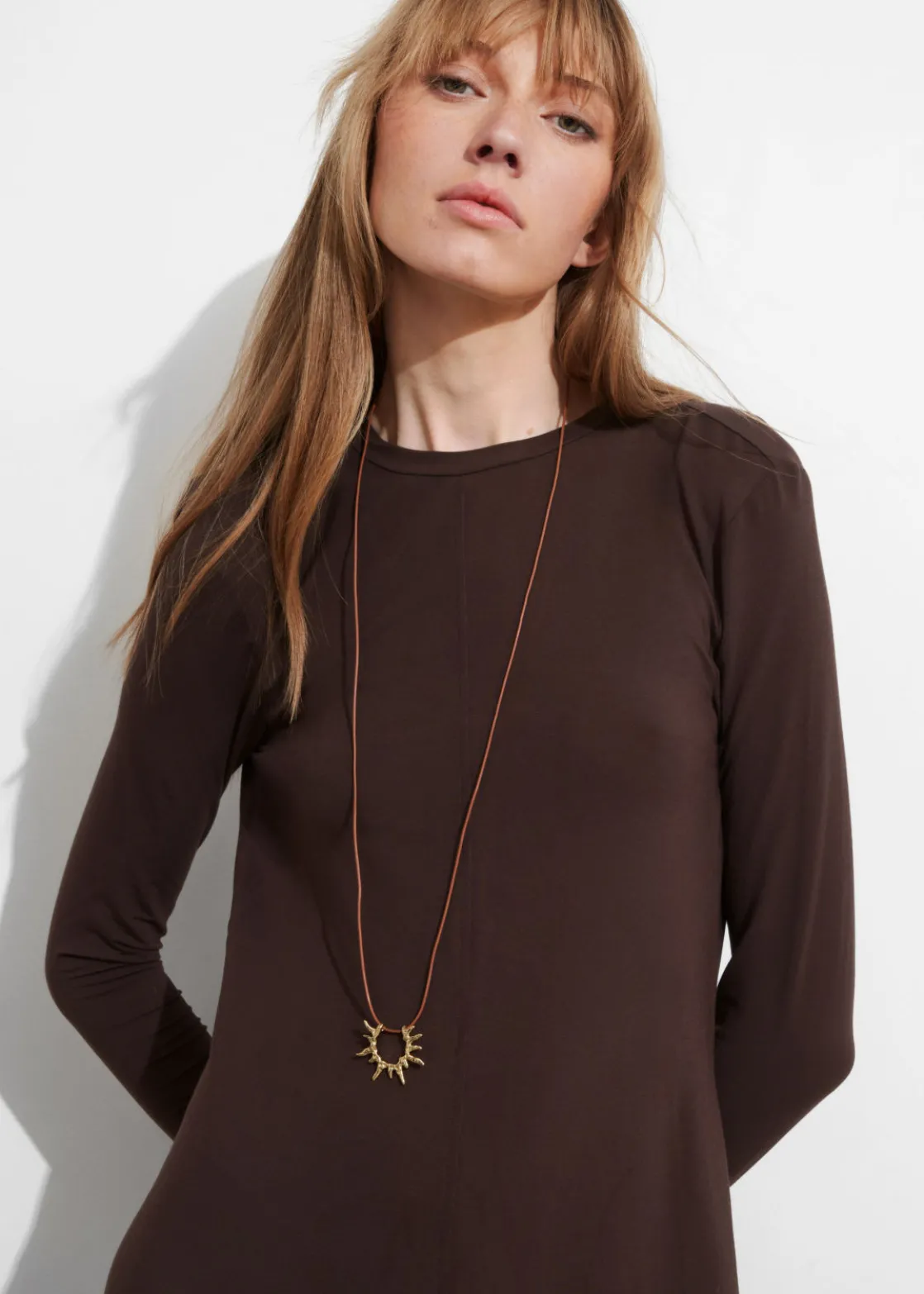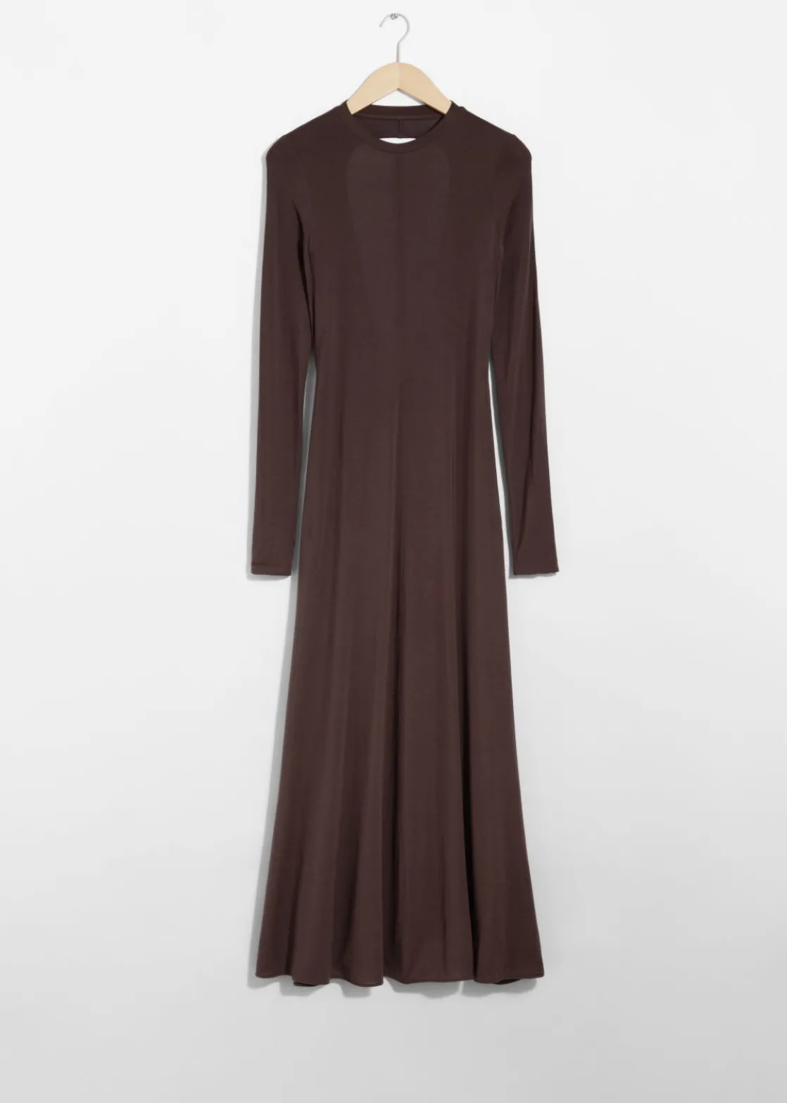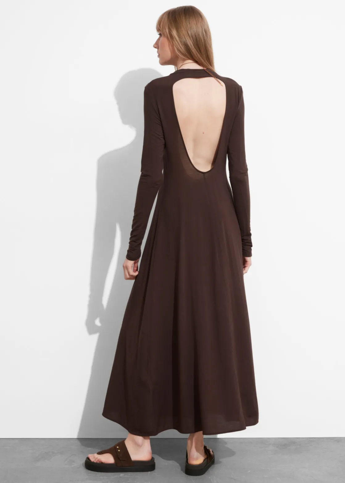 Long-sleeve maxi dress with a fitted, A-line silhouette and an open back.