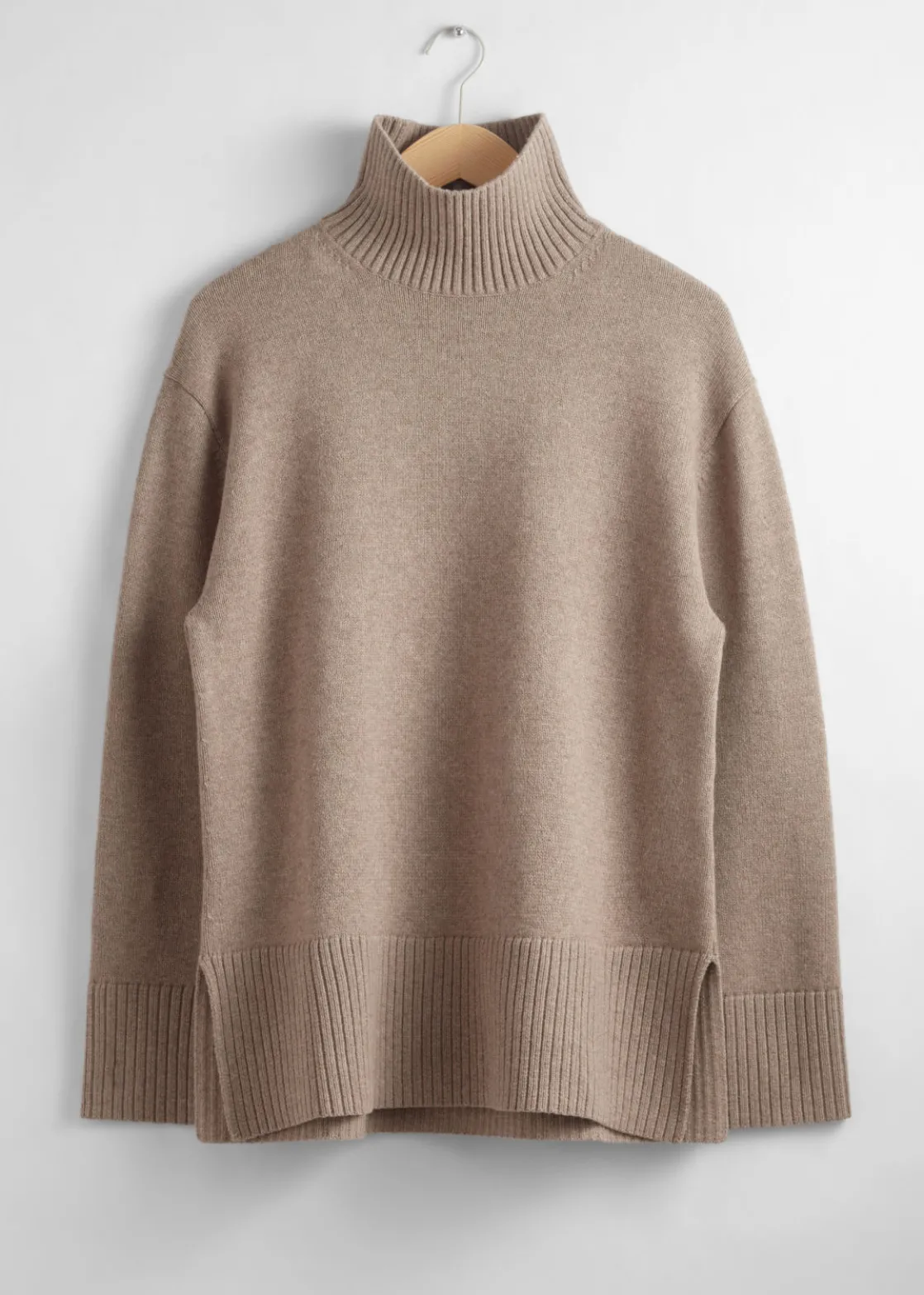 Turtleneck merino wool knit sweater with dropped shoulders for an oversized silhouette.