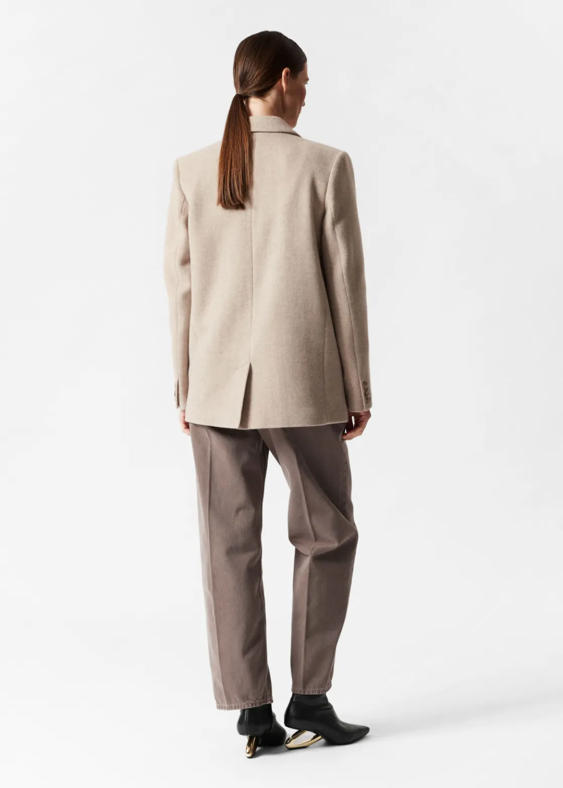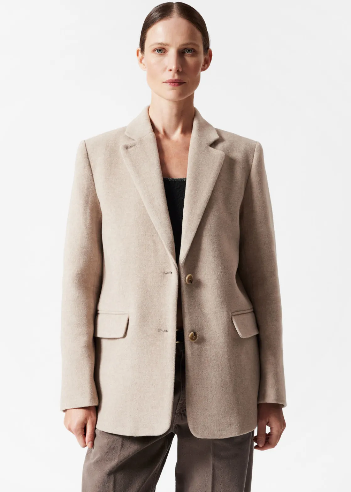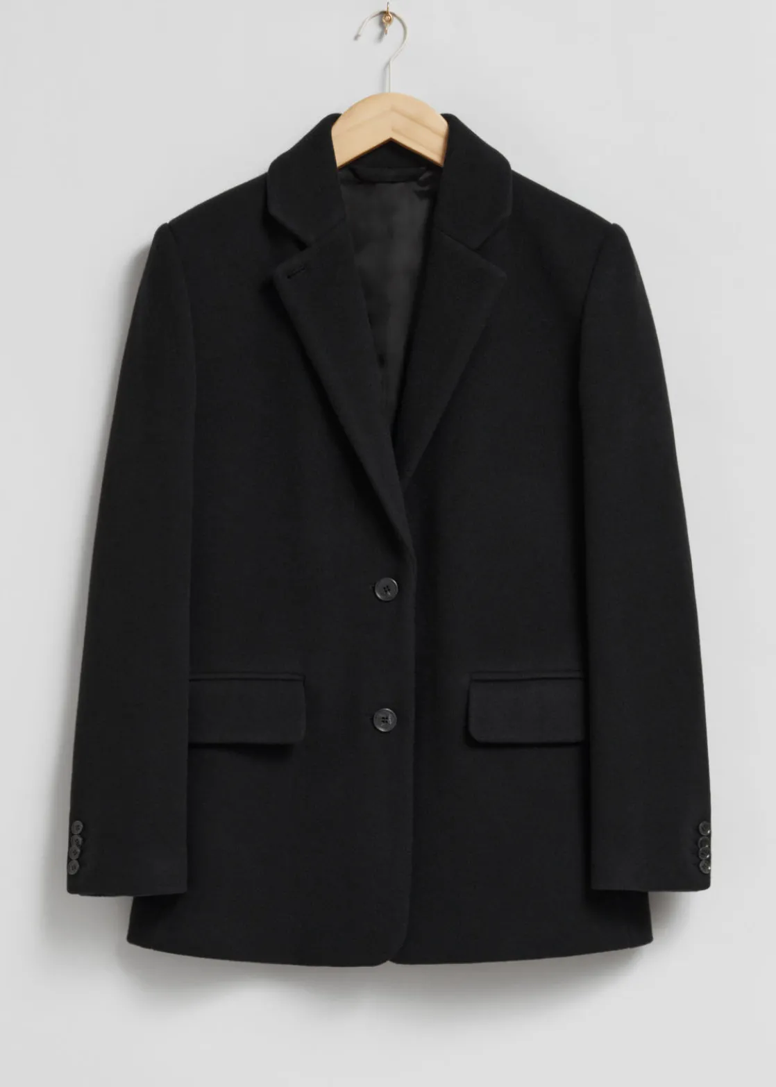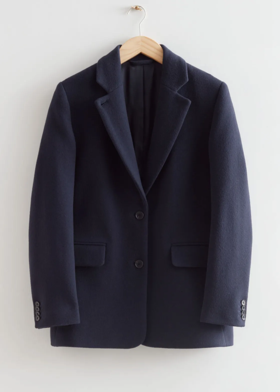 Oversized single-breasted blazer finished with padded shoulders and duo welt pockets.