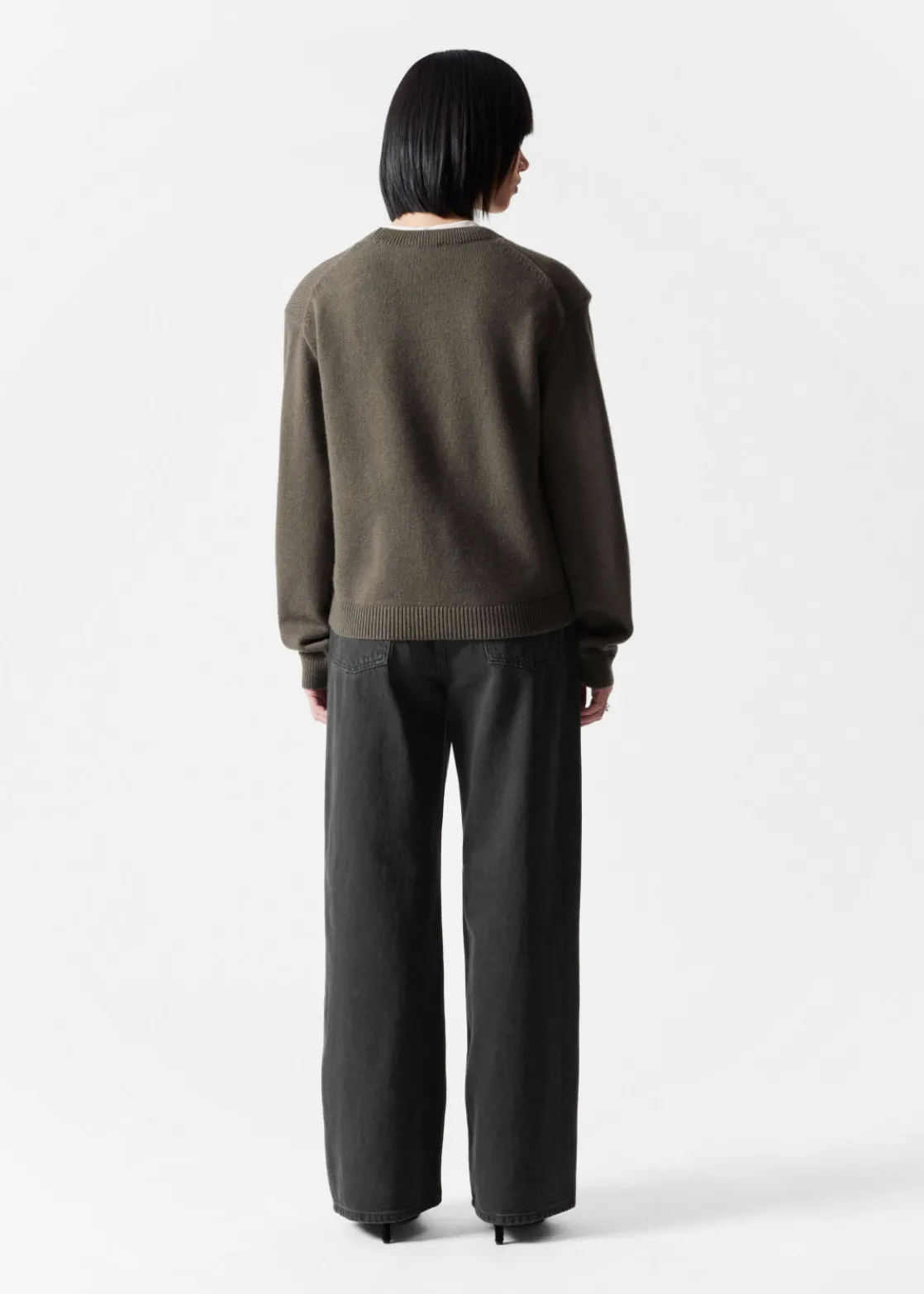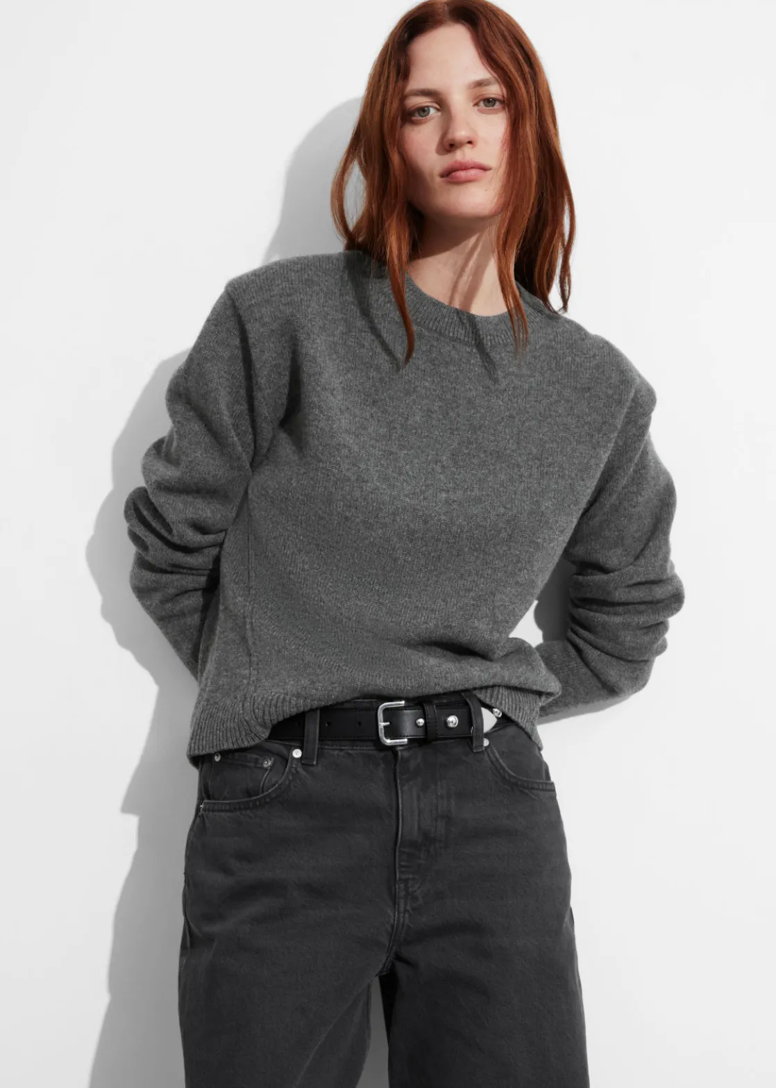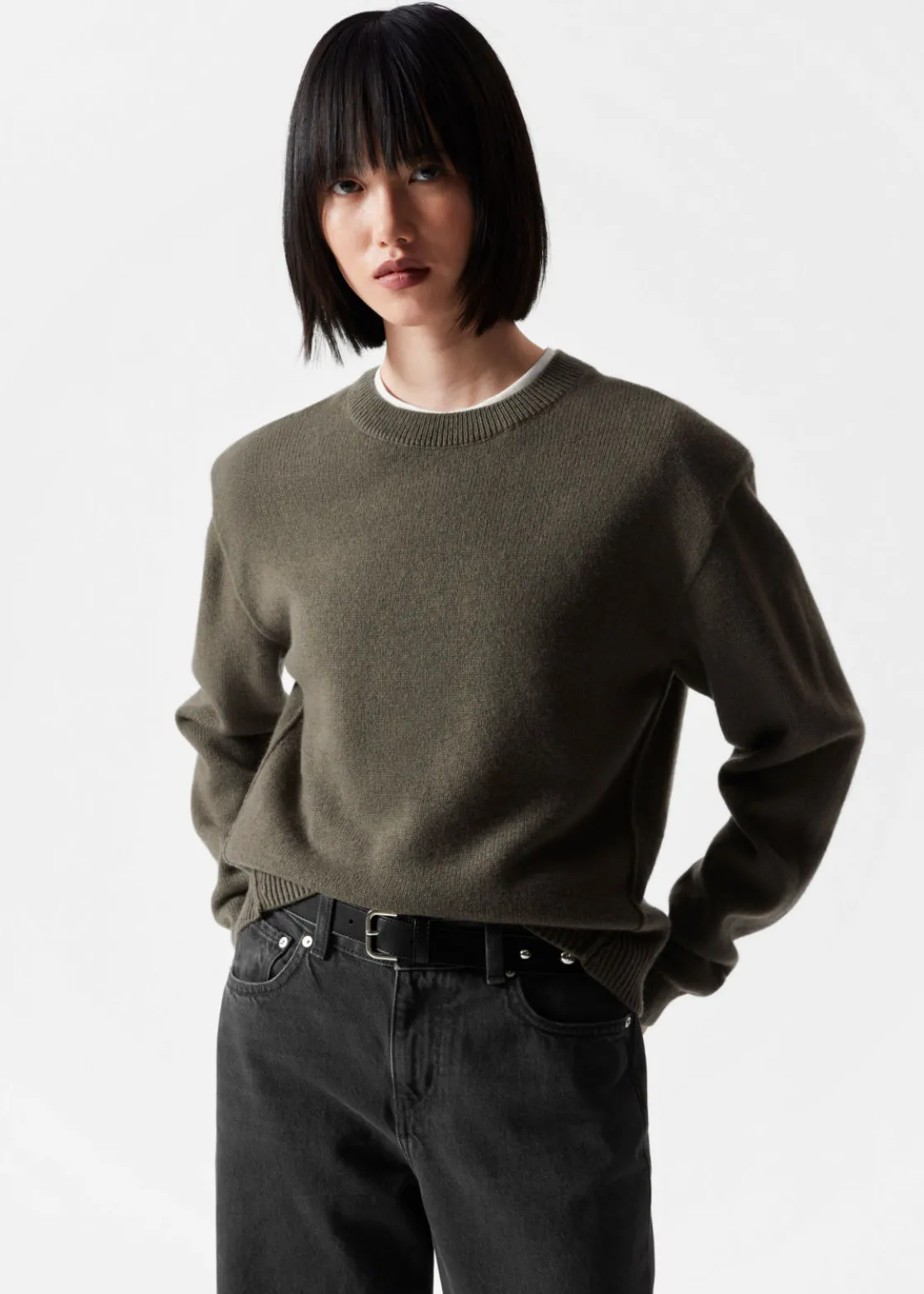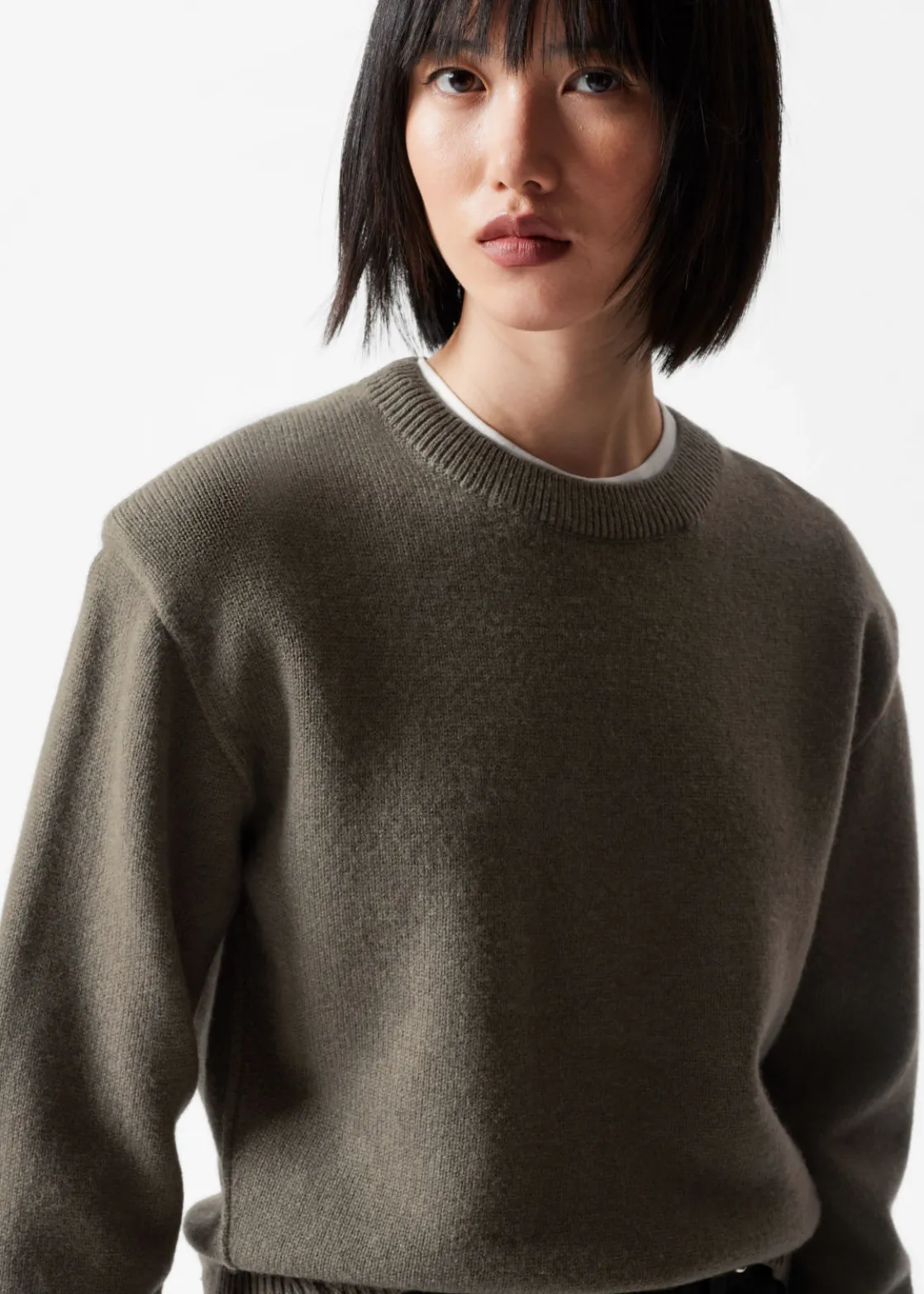 Long-sleeve jumper knitted from merino wool. Designed with padded shoulders.
