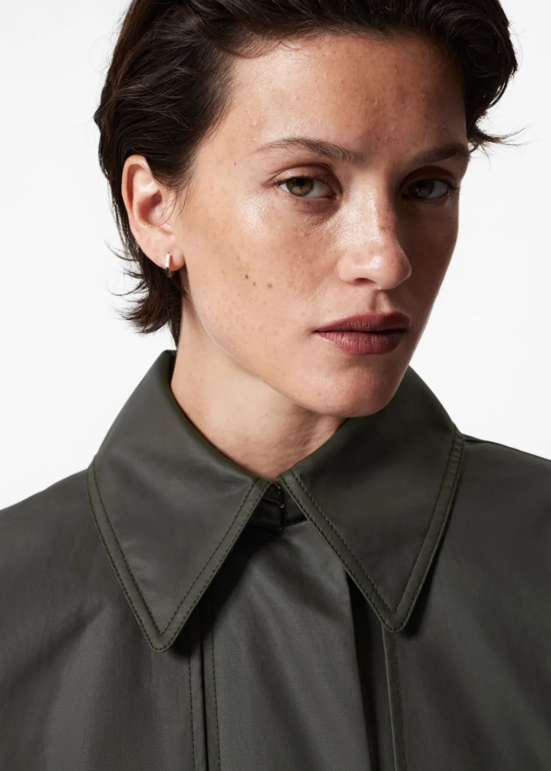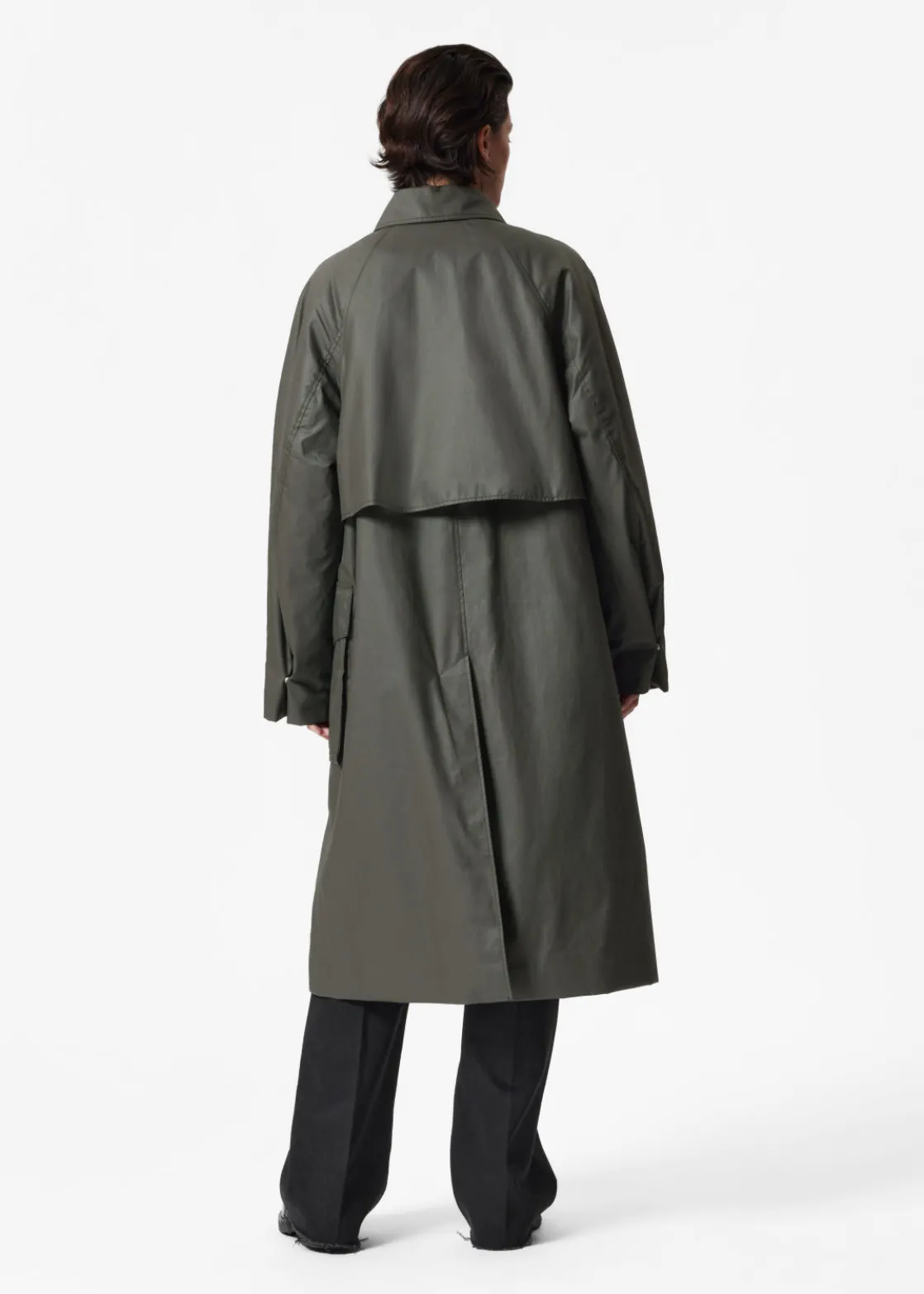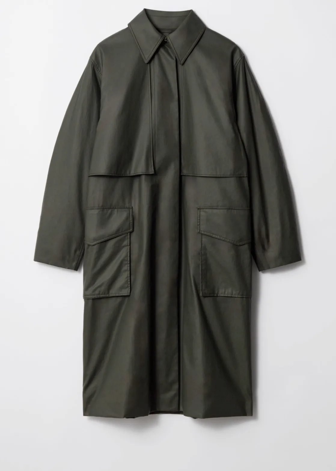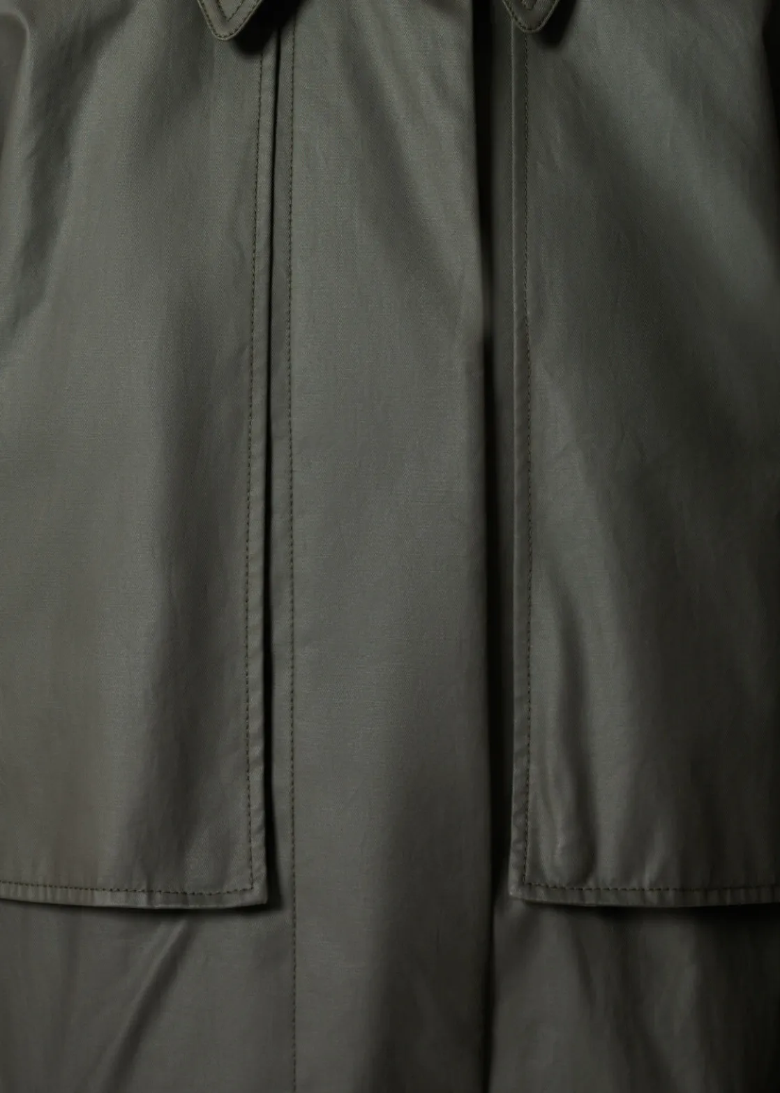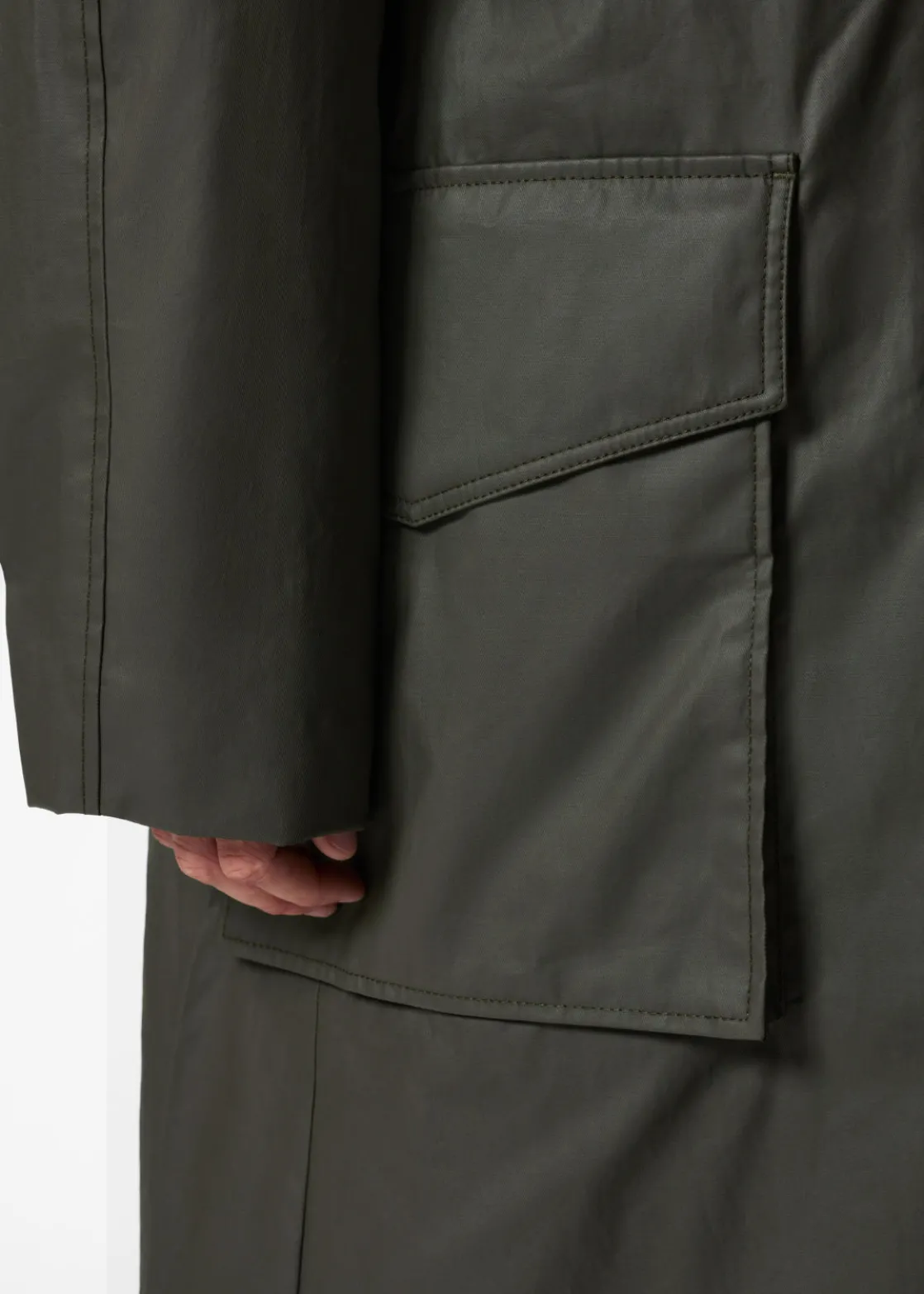 Long-sleeve cotton coat featuring duo large patch pockets and a storm flap.